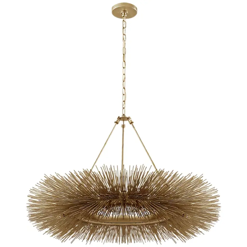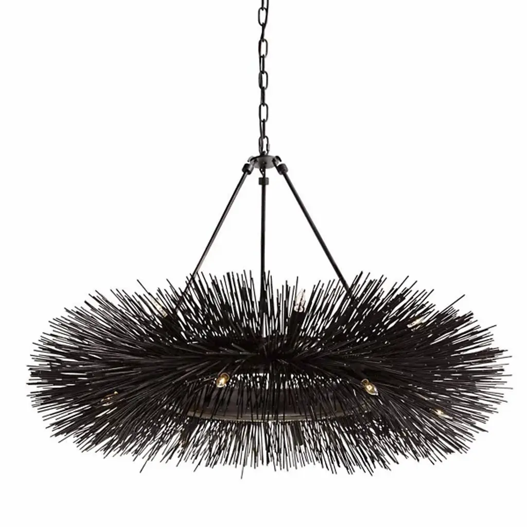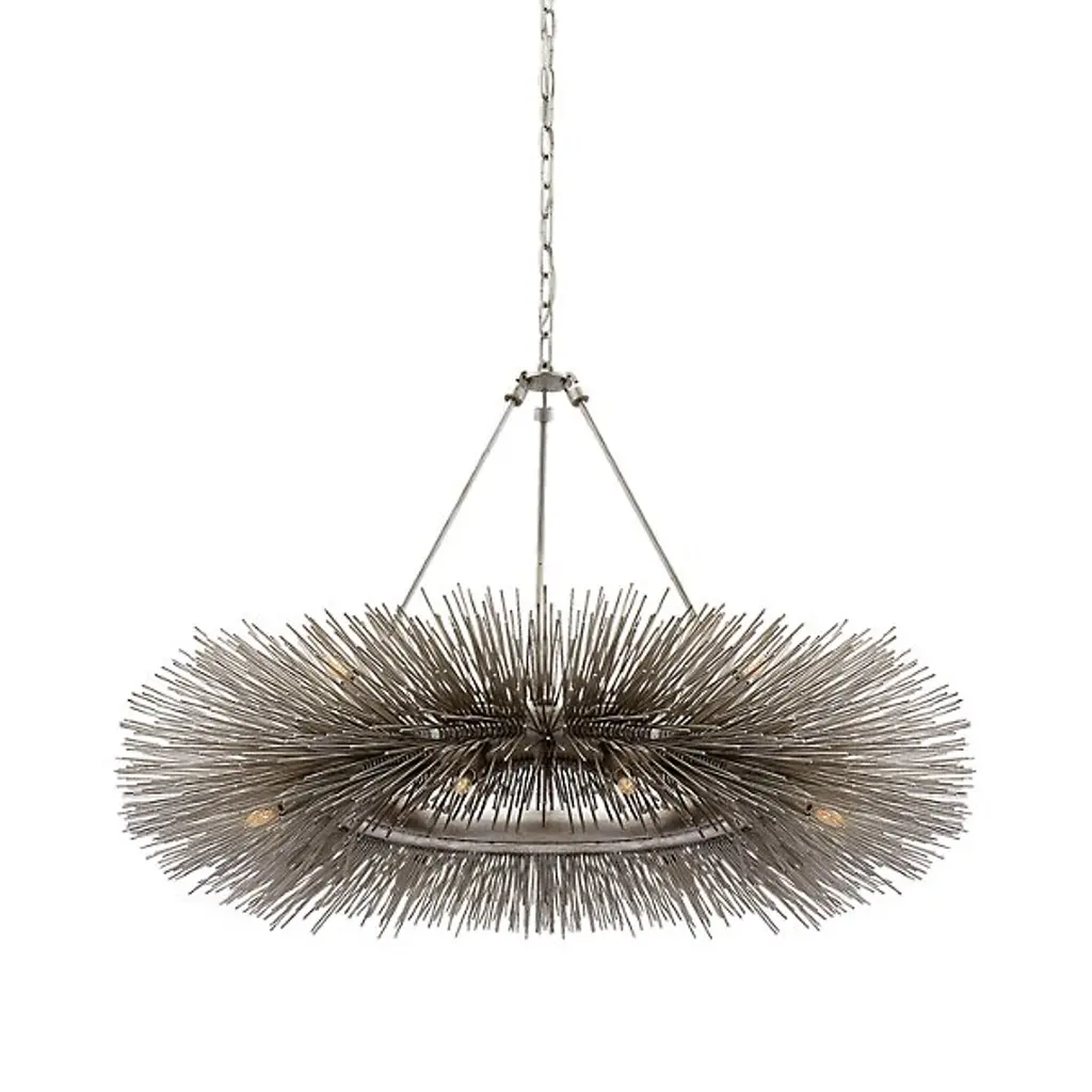 The Strada Ring Chandelier from Visual Comfort Signature, formerly known as Visual Comfort, locks onto the eyes with a silhouette that is mysterious like a spiny sea urchin and attractive like a stylish accessory. It’s an easy choice in the innovative contemporary home aesthetic. It enters the room with grace using a slender rod and chain-link suspension. A metal ring framework acts as the starting point for the chandelier’s bevy of fine rods. These rods create an exploding display that accentuates the radiant quality of the light. Pops of warm light come from classic candelabra bulbs that camouflage inside the starburst silhouette. The bulbs come together to produce a relaxed, atmospheric glow.