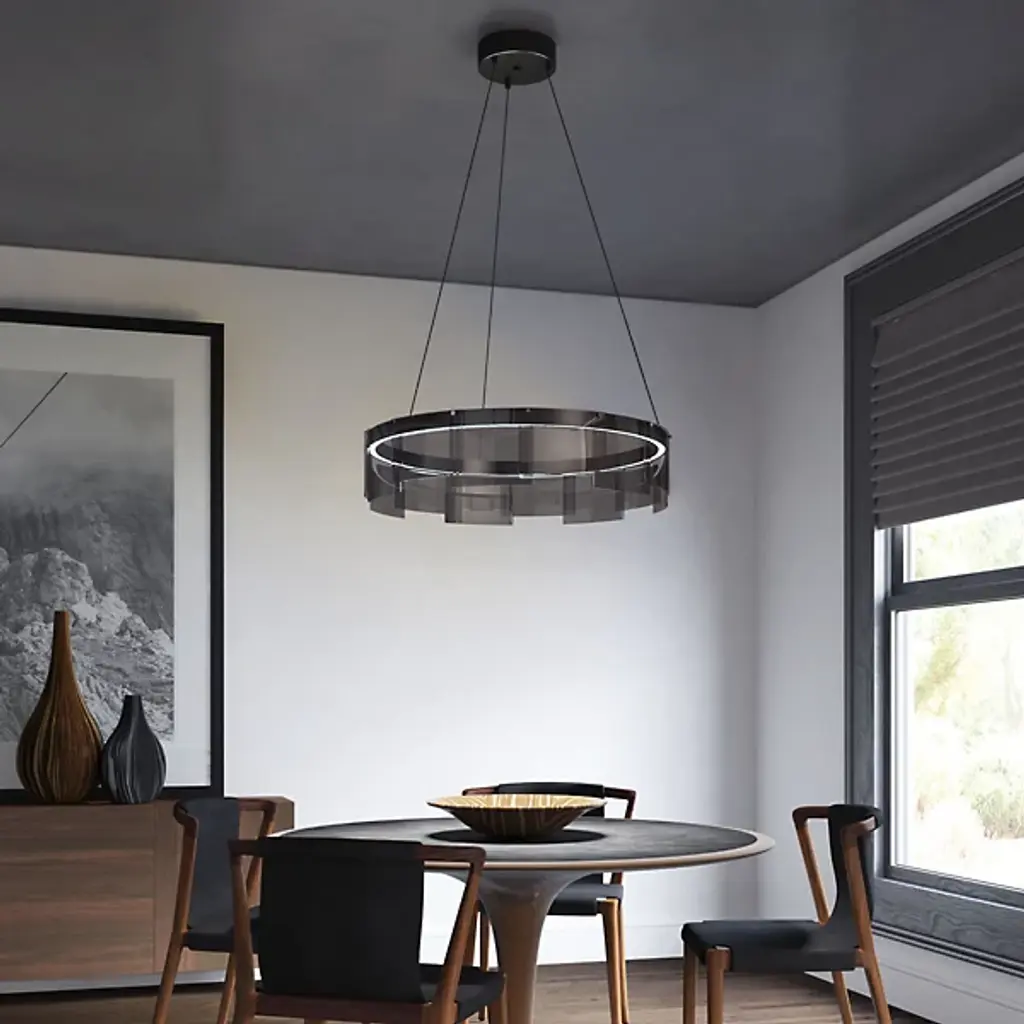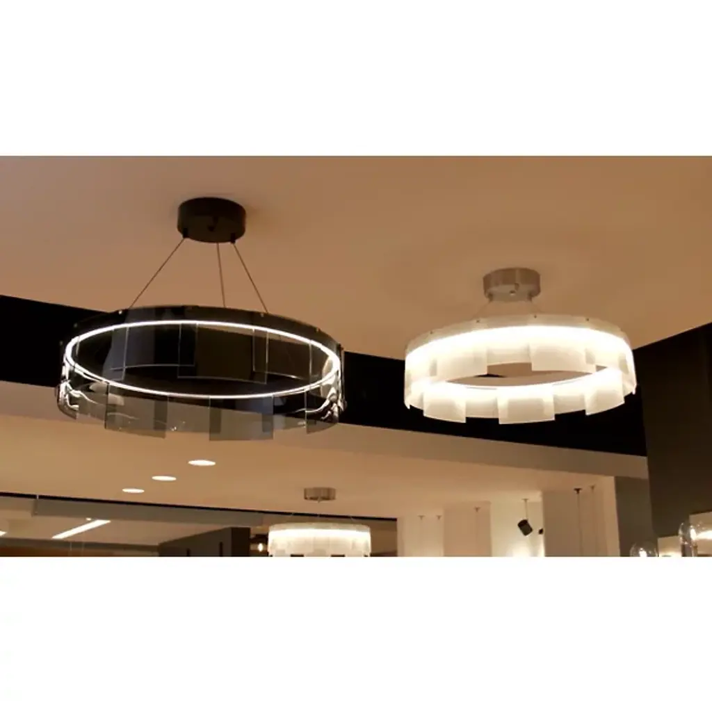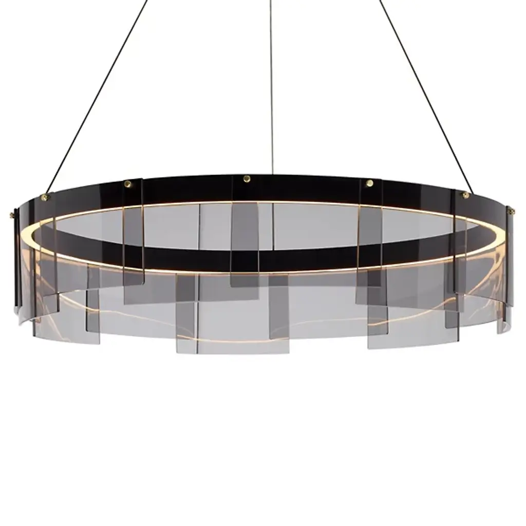 The Visual Comfort Modern, formerly known as Tech Lighting, Stratos LED Chandelier presents a modern interpretation of the traditional chandelier. Gently curved panels of glass overlap and are brought to life with a hidden LED module, lighting the space with a contemporary spin on the tried and true. By combining cutting edge technology with the iconic round chandelier shape, the result is a modern aesthetic that still has classic appeal.