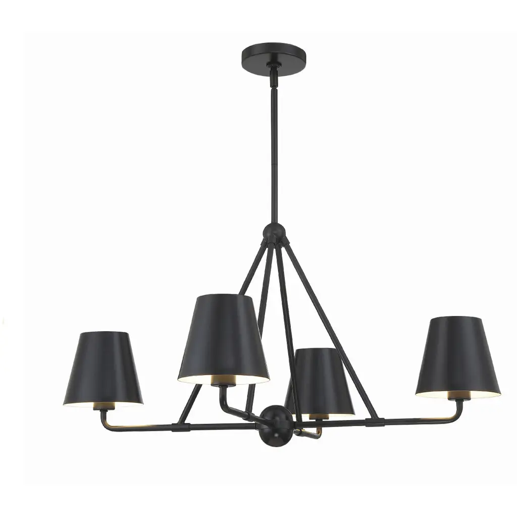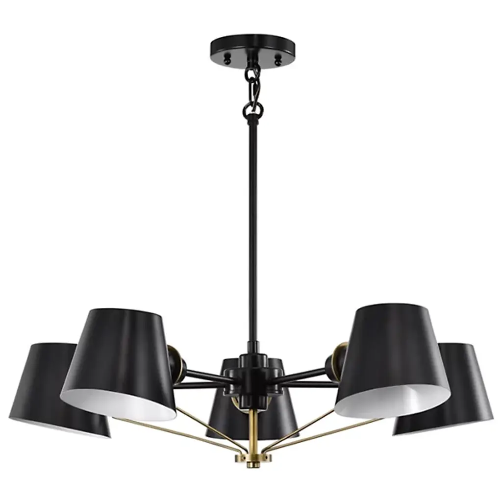Add a pleasing retro appeal to inside ceiling spaces with the Sully Chandelier from Alder & Ore. Retained by a sleek steel disc accentuated by spherical accents, it uses a short length of chain to support a central stem below. The stem, in turn, descends to a rounded hub that extends spoked branches accompanied by slender, sleek braces that contrast with the matte metal above to seat potent lamping inside conical shades, bias-cut to spill a mix of radiant warmth and direct downlight below.