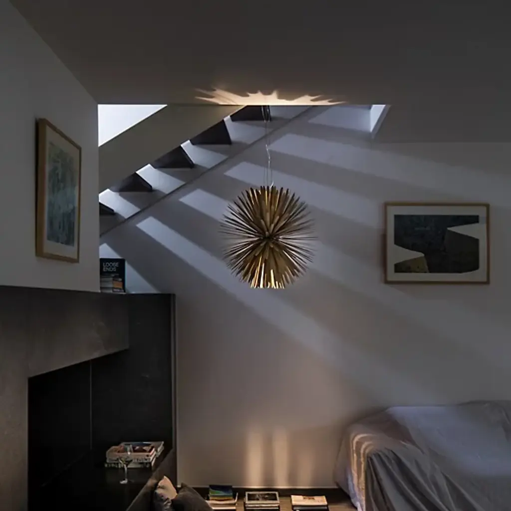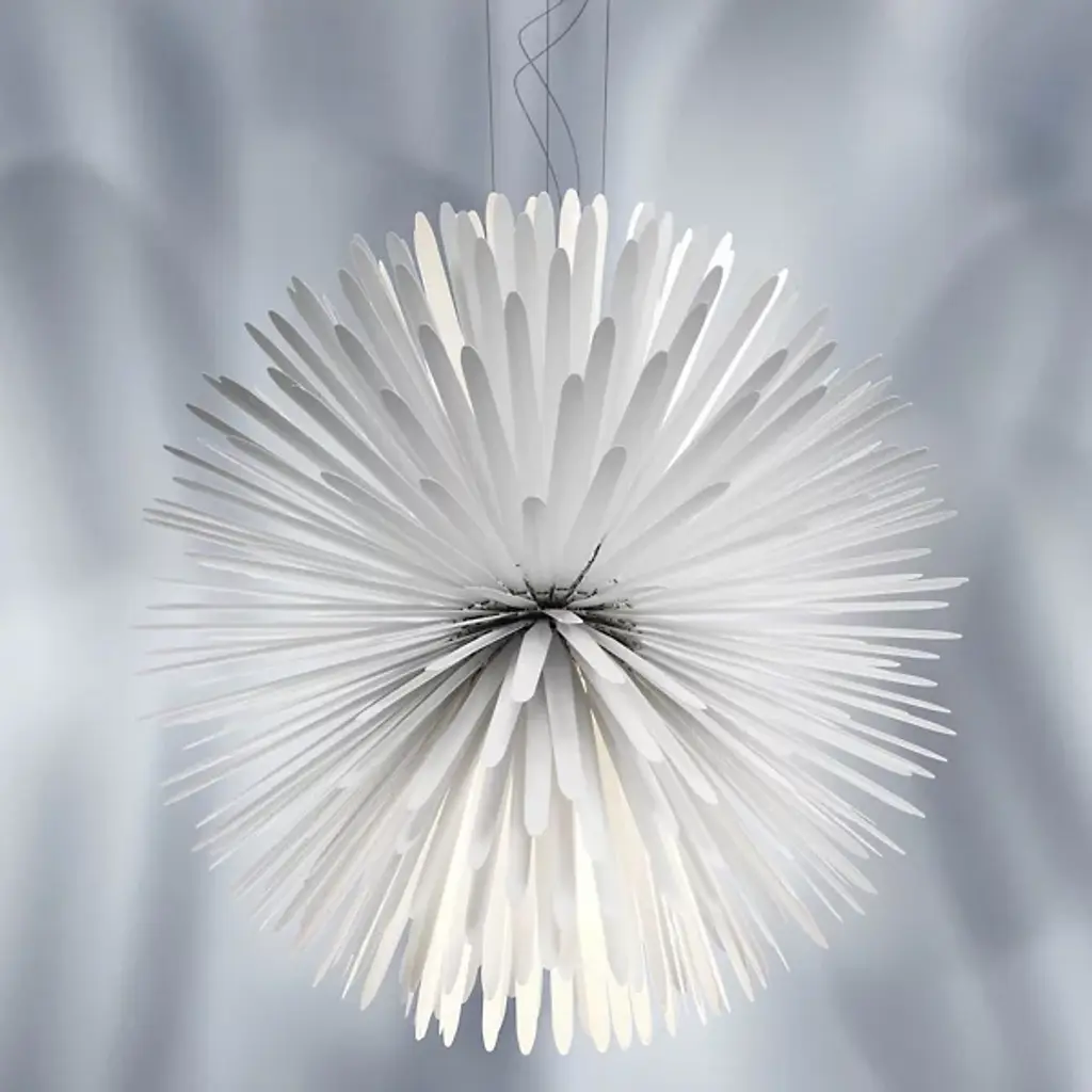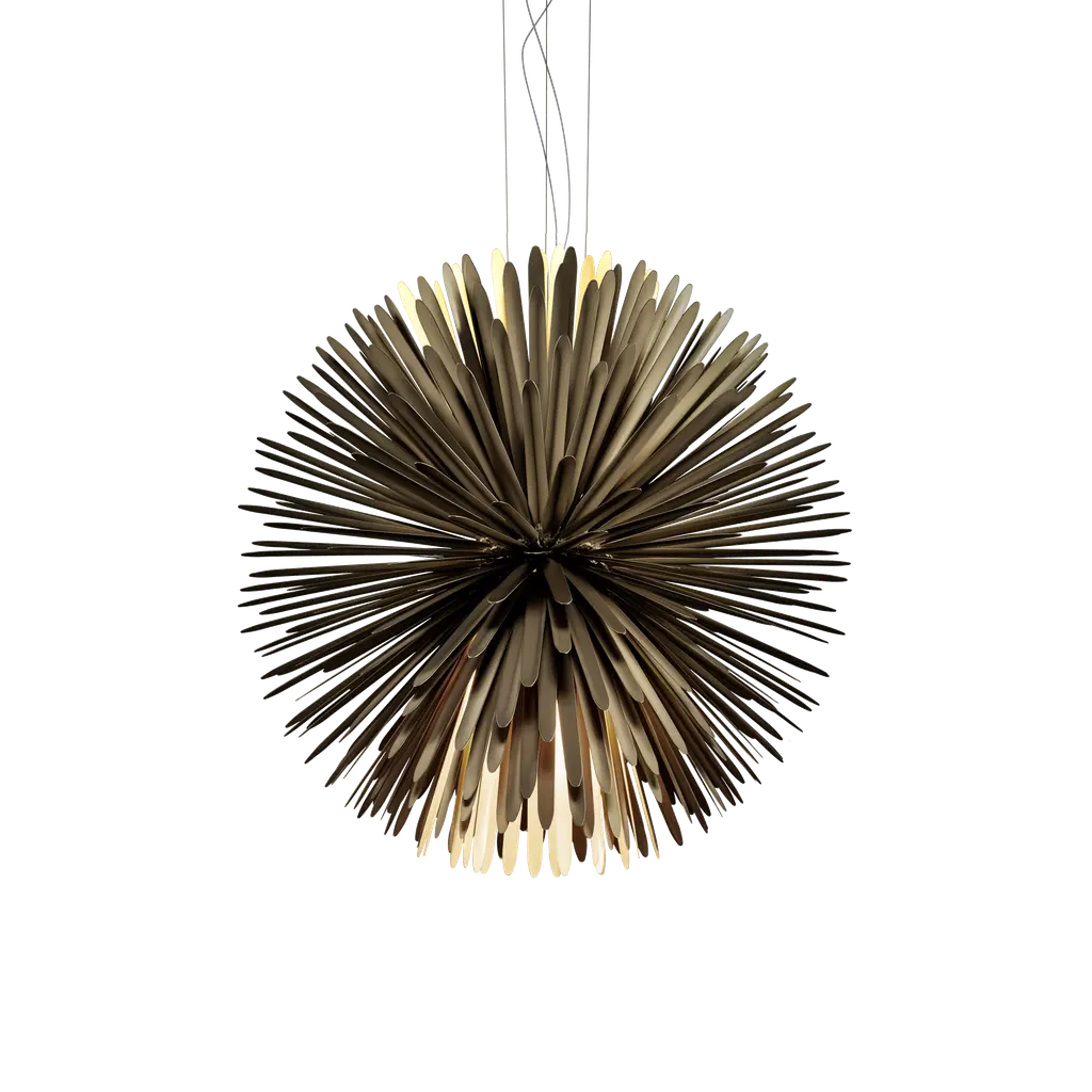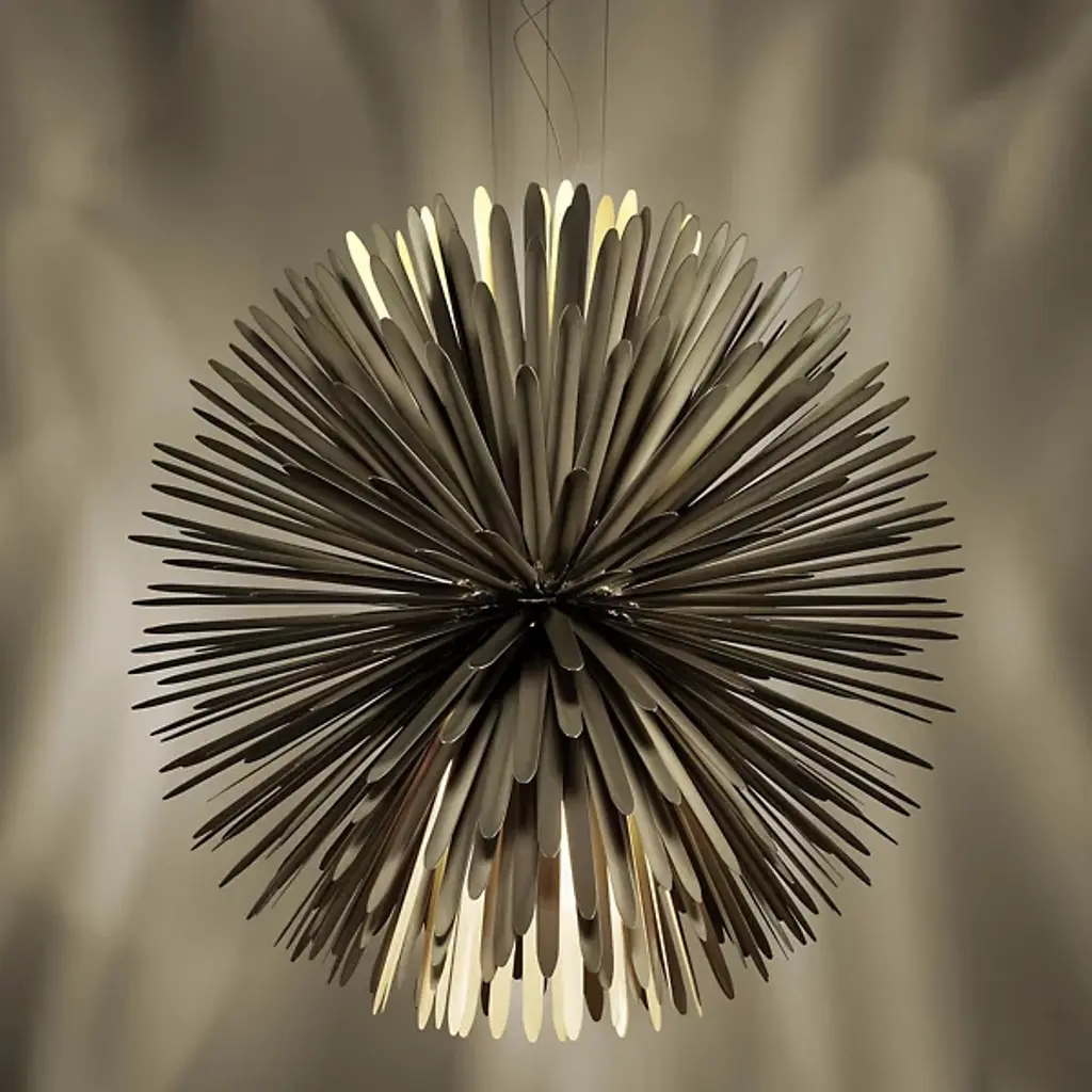 The Sun Light Of Love LED Chandelier by Foscarini is a beautiful design from Tord Boontje that has a minimal, modern feel. Like the sun itself, this pendant expands into a soft, spherical silhouette as 390 cold-pressed steel rays that are grafted onto a central body reach outward, creating a dynamic landscape for light and shadow to play throughout. Offering a mix of direct and indirect light, the warm, welcoming presence of this design brings an organic look and bright touch to spaces.