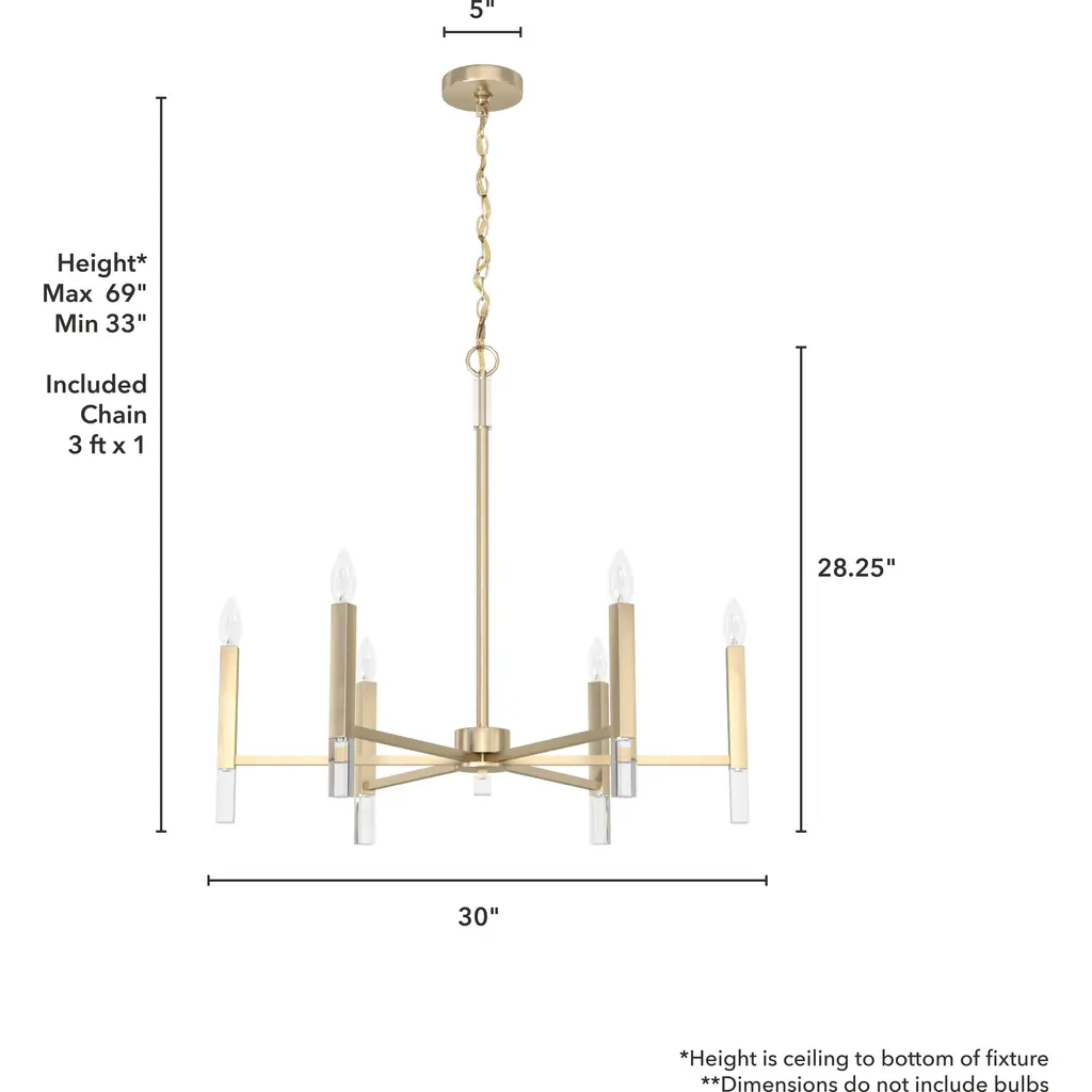 Your guests will be drawn to the beauty of the Sunjai 6 light chandelier. The perfect modern accent to your home’s living or dining room, your guests will be entertained by your style. Pairing the modern simplicity with elegant design and chic sparkling accents, the Sunjai chandelier is a wonderful way to light up your living space without overwhelming your home’s existing décor. Upgrade your aesthetic with the Sunjai.