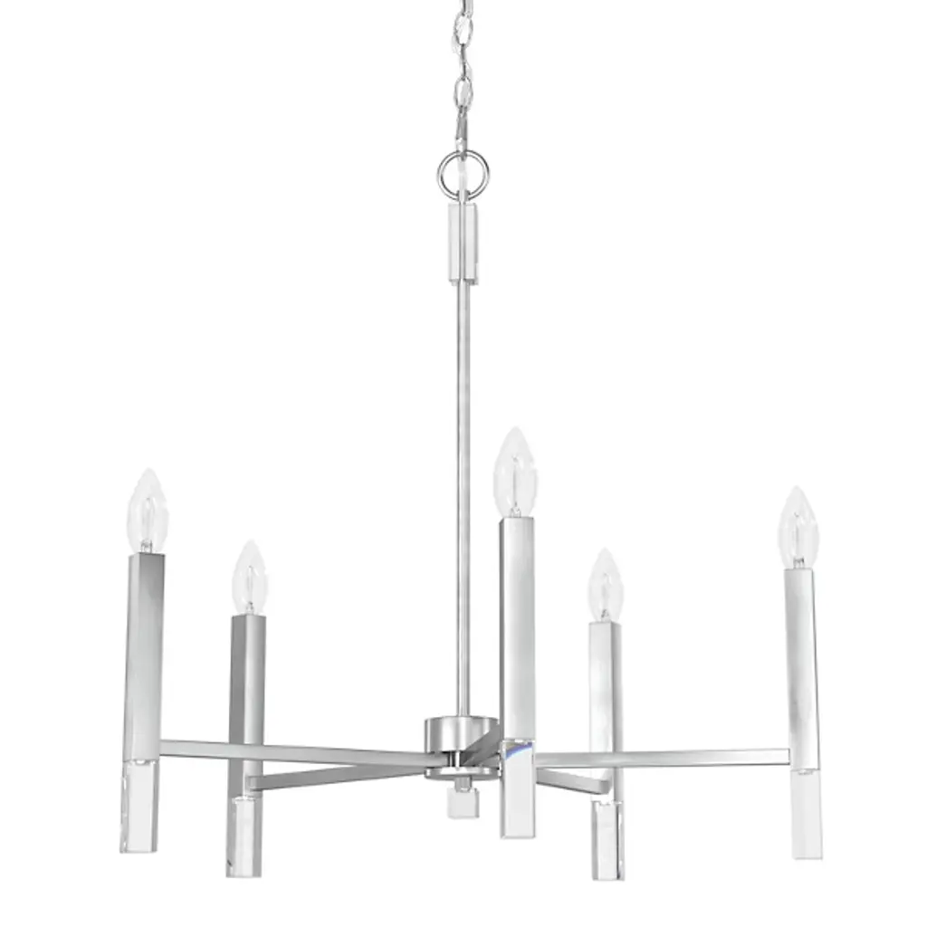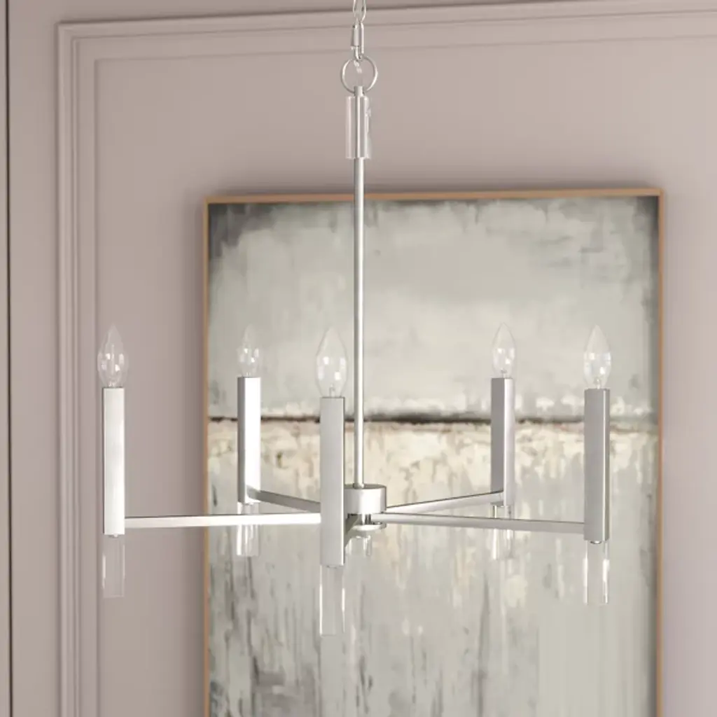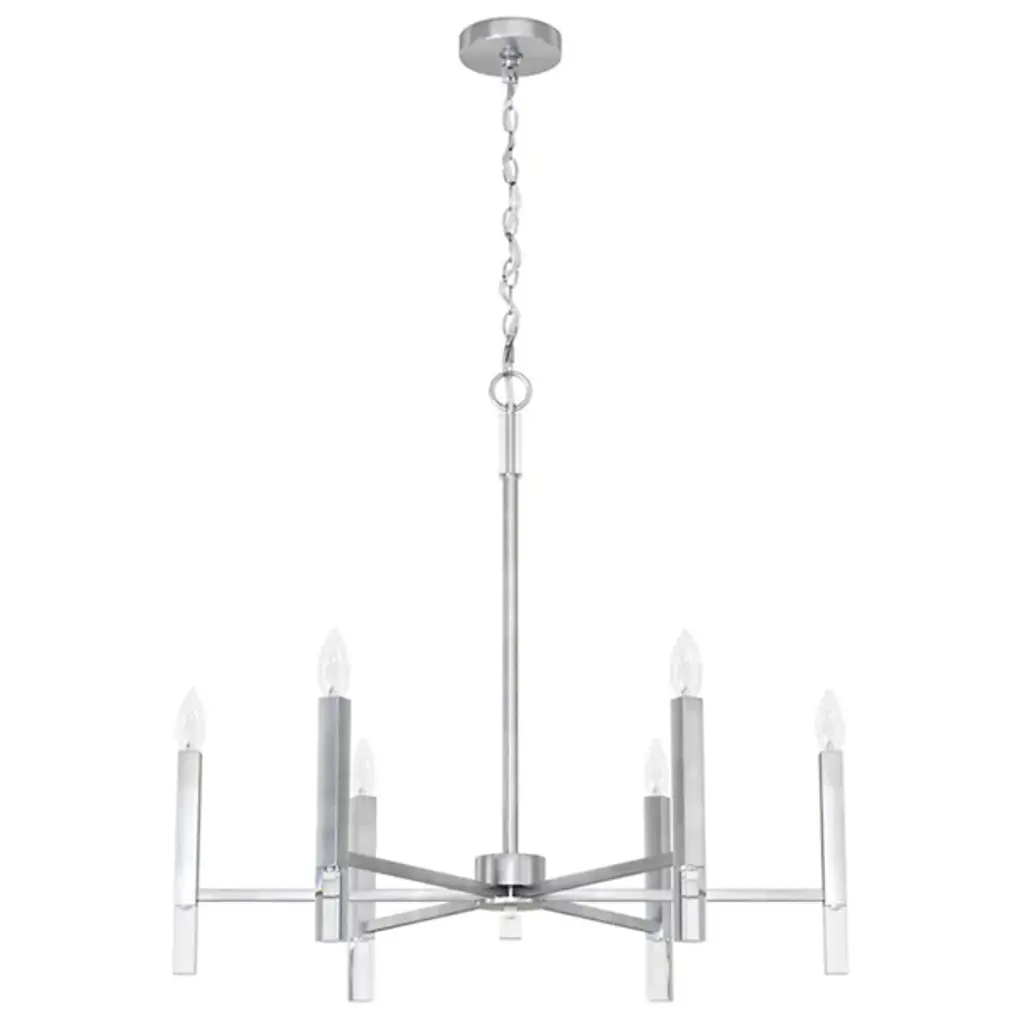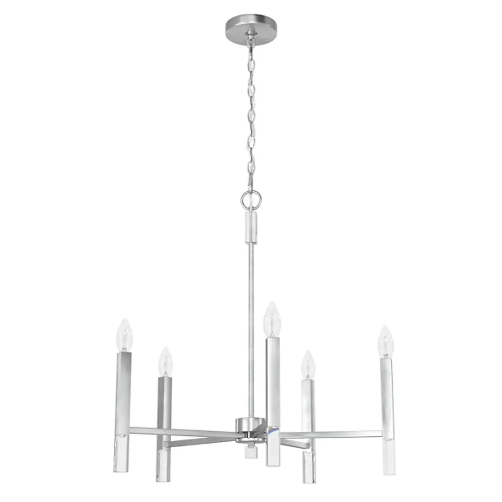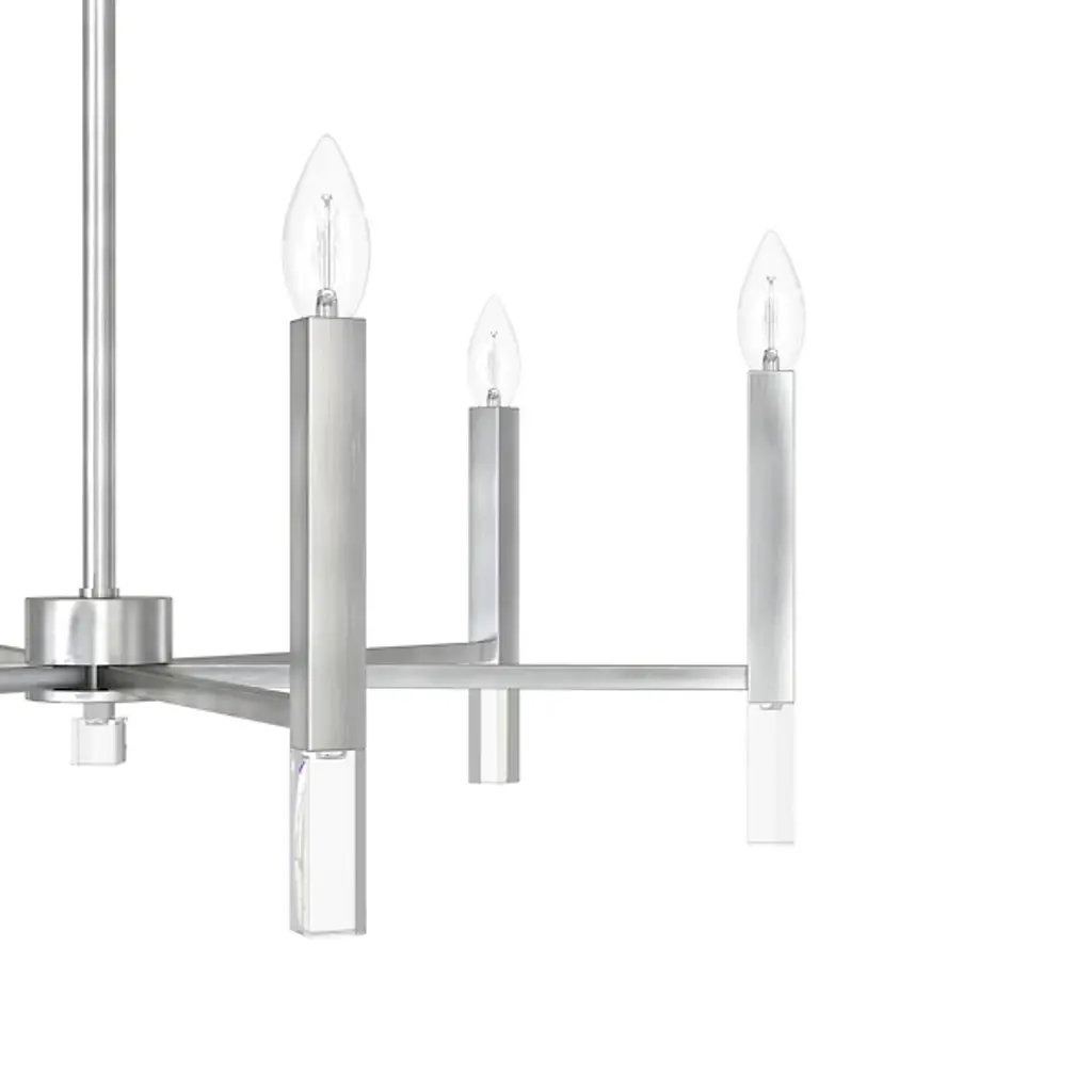 Illuminate your home with the Sunjai Chandelier by Hunter Fans. Crafted in the quintessential, minimalist candelabra style of other fixtures in the Sunjai Line, this chandelier brings a regal aesthetic to your kitchen or family room. A collection of metallic arms is displayed in a carousel-like fashion overhead. This fixture attaches to the ceiling via a chain secured to a disc-shaped canopy. This chandelier is available in multiple lighting options so that you can choose the piece that most suits your needs.