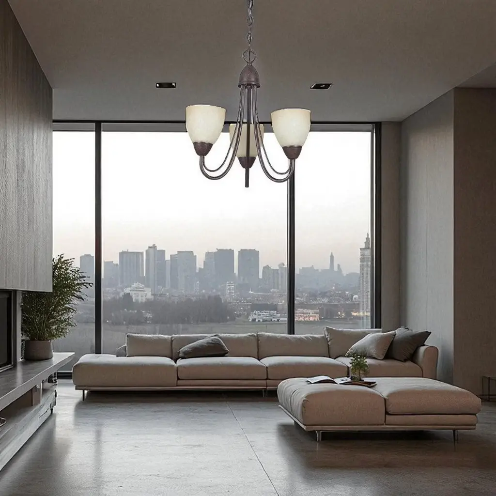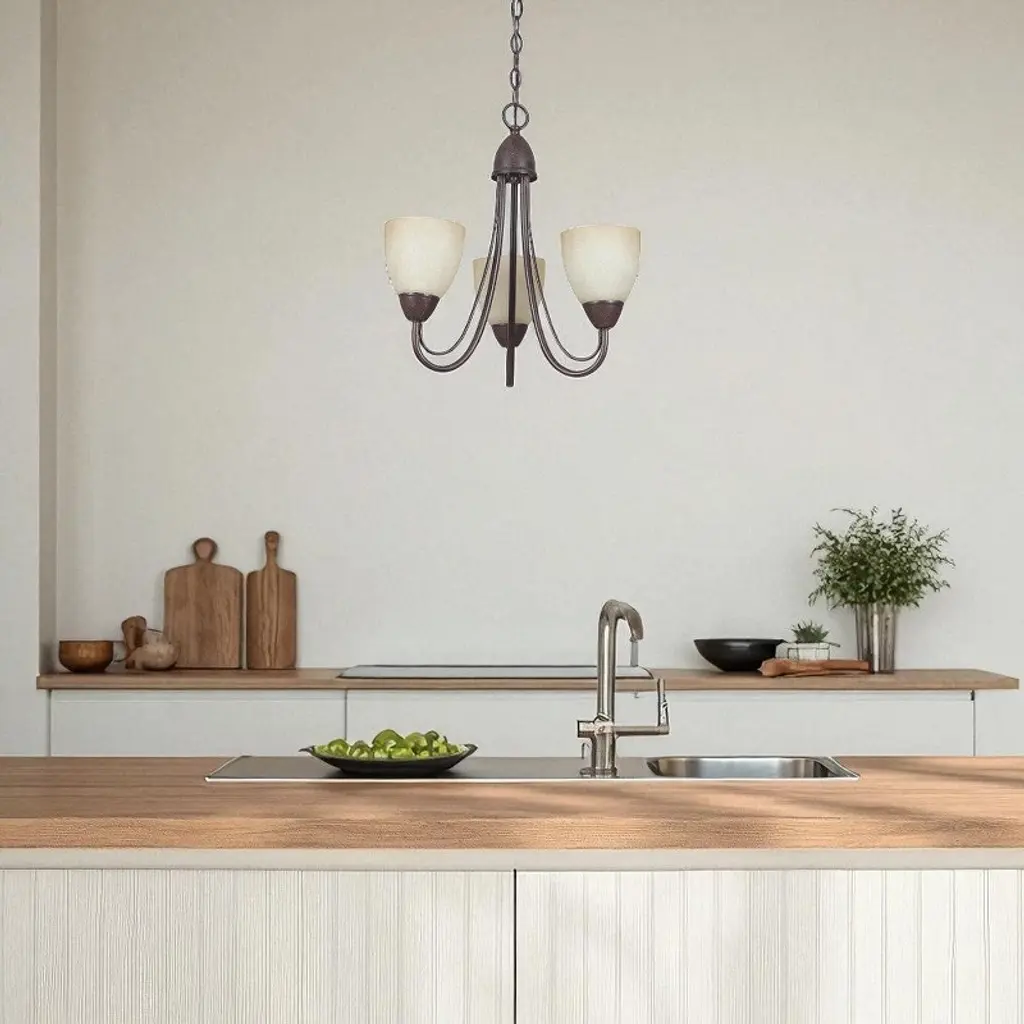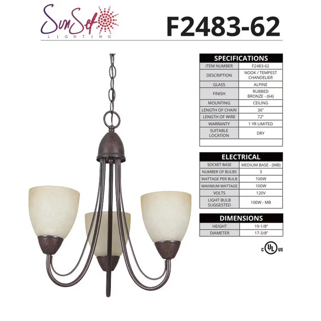 Sunset Lighting Chandelier with Alpine Glass, Rubbed Bronze A transitional 3-light chandelier featuring warm Rubbed Bronze metalwork and Alpine glass shades. Designed for classic or modern spaces, it provides comfortable uplighting and works with dimmers for tailored ambiance. Ideal for dining rooms, kitchens, and foyers. Key Features: • Transitional 3-light chandelier with elegant uplight design • Rubbed Bronze finish with included Alpine glass shades • Dimmable with compatible bulbs/dimmer switches • Uses standard medium (E26) base bulbs for easy replacement • Ceiling-mount installation for a variety of rooms Specifications: • Brand: Sunset Lighting • Part Number / Model: F2483-62 • Color / Finish: Rubbed Bronze • Material: Glass, Metal • Style: Transitional • Light Fixture Form: Chandelier (Uplight) • Number of Lights: 3 • Socket/Base: Medium E26 • Wattage: 3 × 100W max (bulbs not included) • Voltage: 120V • Special Feature: Dimmable • Power Source: Corded Electric • Product Dimensions: 19" × 17.88" × 19" • Mounting Type: Ceiling Mount