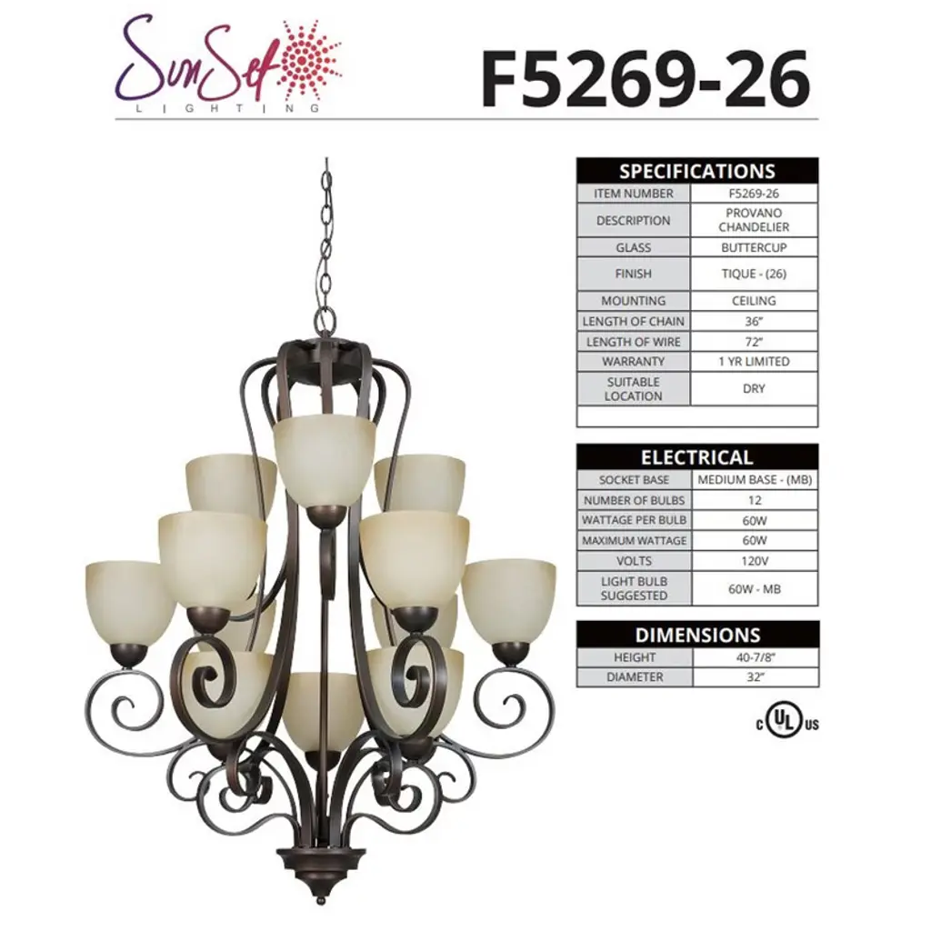 Sunset LightingProvano 12-Light Chandelier, Buttercup Glass, Tique Finish Make a grand statement with the Provano chandelier’s layered silhouette, warm Tique finish, and glowing Buttercup glass shades. Ideal for formal dining rooms, great rooms, and entryways, its twelve medium-base sockets deliver ample, dimmer-ready illumination. Adjustable chain and wire lengths make installation straightforward on a variety of ceiling heights. Key Features: • Elegant 12-light chandelier for large spaces • Warm Tique (26) finish with Buttercup glass shades • Medium-base sockets; compatible with 60W bulbs (not included) • Adjustable hanging height with 36" chain and 72" wire • Dry-location rated; ceiling-mount installation Specifications: • Item Number: F5269-26 • Collection/Description: Provano Chandelier • Finish: Tique • Glass: Buttercup • Mounting: Ceiling • Suitable Location: Dry (Indoor) • Chain Length: 36" • Wire Length: 72" • Socket Base: Medium Base (MB/E26) • Number of Bulbs: 12 • Wattage per Bulb: 60W (max 60W each; bulbs not included) • Voltage: 120V • Suggested Bulb: 60W MB/E26 • Height: 40-7/8" • Diameter: 32"
