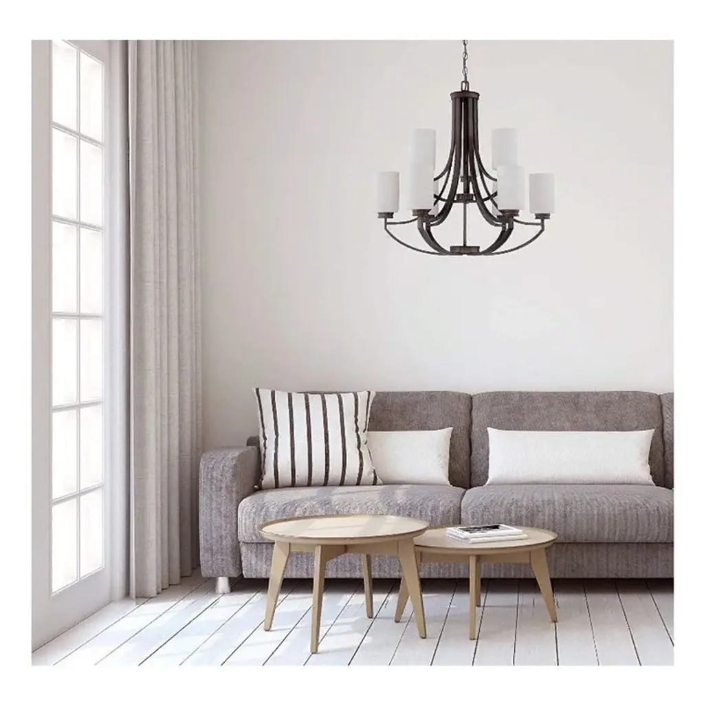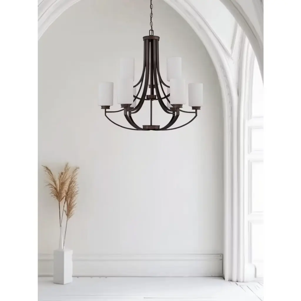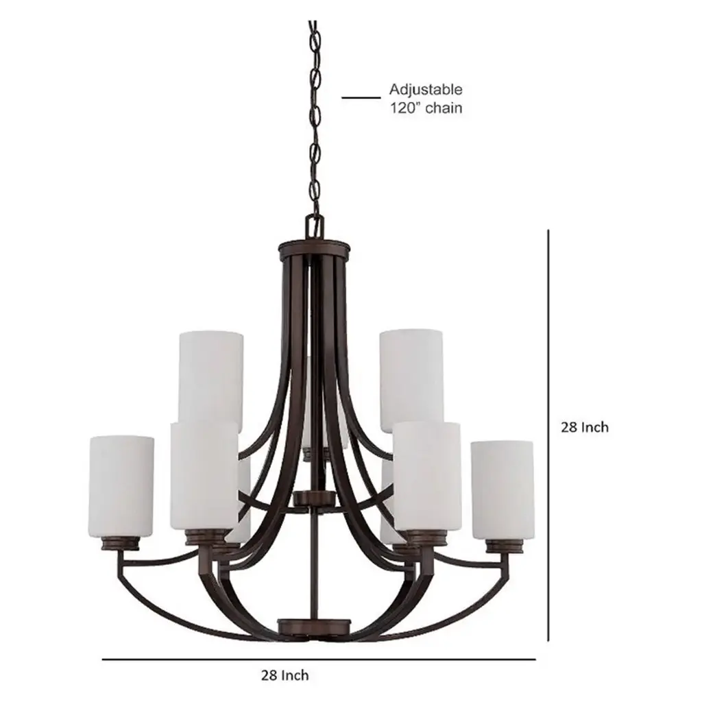 Sunset Lighting Dalton 9-Light Two-Tier Chandelier, Bronze, Opal Etched Glass Bring a warm, modern-farmhouse touch to large rooms with Dalton’s sculpted two-tier frame finished in bronze. Nine opal etched glass cylinders diffuse light into a soft, inviting glow. The fixture is dimmer-compatible and includes an adjustable chain for easy mounting on standard, sloped, or vaulted ceilings. Key Features: • Transitional farmhouse design with antique-inspired bronze finish • Two tiers with 9 opal etched glass shades for even, welcoming light • Dimmable with compatible bulbs/switch (not included) • Adjustable hanging height with included 10-ft chain and 12.5-ft wire • Dry-location rated for indoor spaces like living rooms, foyers, and dining rooms Specifications: • Brand/Manufacturer: Sunset Lighting (Luminance) • Model/Part Number: F18009-64 (Dalton) • Fixture Type: Chandelier (Two Tier, Uplight) • Style: Modern Farmhouse / Transitional • Finish: Bronze (Antique) • Materials: Iron, Glass • Shade: Opal Etched Glass cylinders (each ~4.25" Dia × 5.875" H) • Number of Lights: 9 • Wattage: 9 × 60W max (bulbs sold separately) • Power Source: Hardwired • Mounting: Hanging; adjustable chain (10 ft) and wire (12.5 ft) included • Dimensions: 28.125" L × 28.125" W × 29.375" H • Location Rating: Indoor, Dry • Certification: UL • Special Feature: Adjustable hanging length • Item Weight: 27 lb