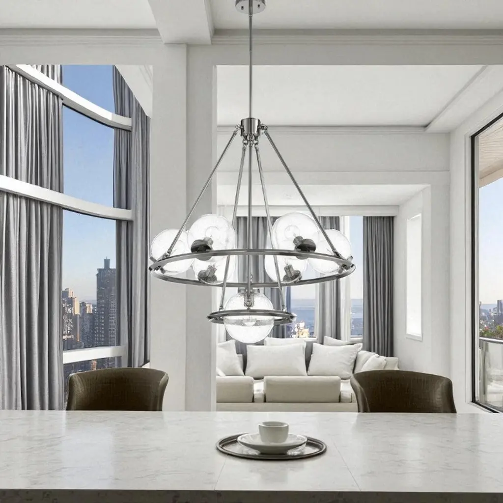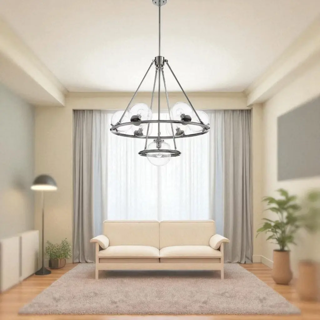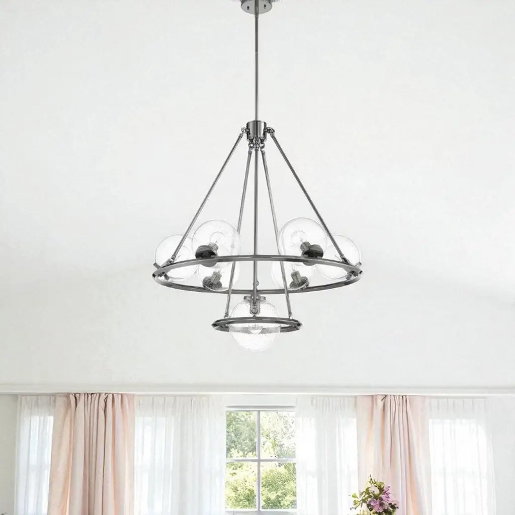 Sunset Lighting Messier 7-Light Chandelier, Clear Seeded Glass Globes, Antique Gunmetal Bring modern-transitional elegance to large rooms with Messier’s striking seven-light silhouette and sparkling clear seeded glass globes. Finished in Antique Gunmetal, this statement chandelier delivers bright, even illumination and is dimmable to set the perfect mood. Dry-location rated and UL Listed for peace of mind. Key Features: • Transitional 7-light chandelier with clear seeded glass globe shades • Antique Gunmetal finish complements a wide range of interiors • Dimmable with compatible bulbs/dimmer (sold separately) • Ideal centerpiece for dining rooms, great rooms, and foyers • UL Listed; rated for dry indoor locations Specifications: • Manufacturer: Luminance (Sunset Lighting) • Model/Part Number: F26117-57 (Messier) • Fixture Type: Chandelier • Finish: Antique Gunmetal • Material: Iron • Number of Lights: 7 • Bulb Wattage: 7 × 60W max (sold separately) • Dimensions: 31.75" L × 31.75" W × 80.75" H • Location Rating: Dry • Certification: UL Listed
