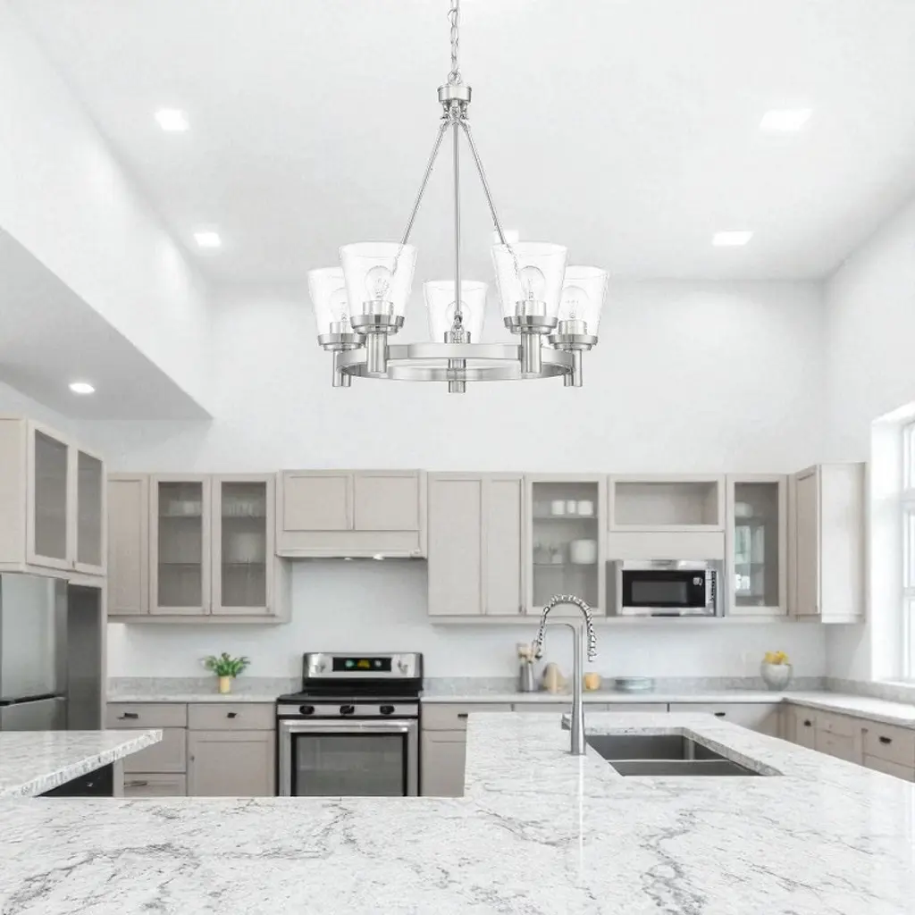 Sunset Lighting Riella 5-Light Chandelier with Clear Seeded Glass, Bright Satin Nickel A modern take on a classic silhouette, Riella pairs a Bright Satin Nickel finish with clear seeded glass shades for bright, sparkling illumination. Perfect for dining rooms, kitchens, and foyers, its balanced five-light design anchors the space with clean lines and timeless appeal. Key Features: • Contemporary 5-light chandelier with clear seeded glass shades • Bright Satin Nickel finish complements modern and transitional décor • Even, room-filling illumination ideal for dining areas and entryways • Standard medium-base sockets for easy bulb selection and replacement Specifications: • Model/Part Number: F24015-80 (Riella) • Fixture Type: Chandelier • Finish: Bright Satin Nickel • Dimensions: 24" L × 24" W × 24" H • Number of Bulbs: 5 (not included) • Maximum Wattage: 5 × 100W (E26/Medium Base) • Voltage: 120V • Glass: Clear Seeded • Shipping Dimensions: 3.71" L × 27.17" W × 9.1" H