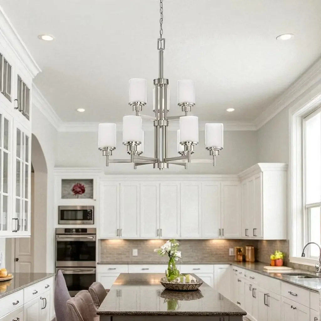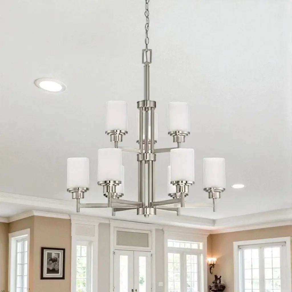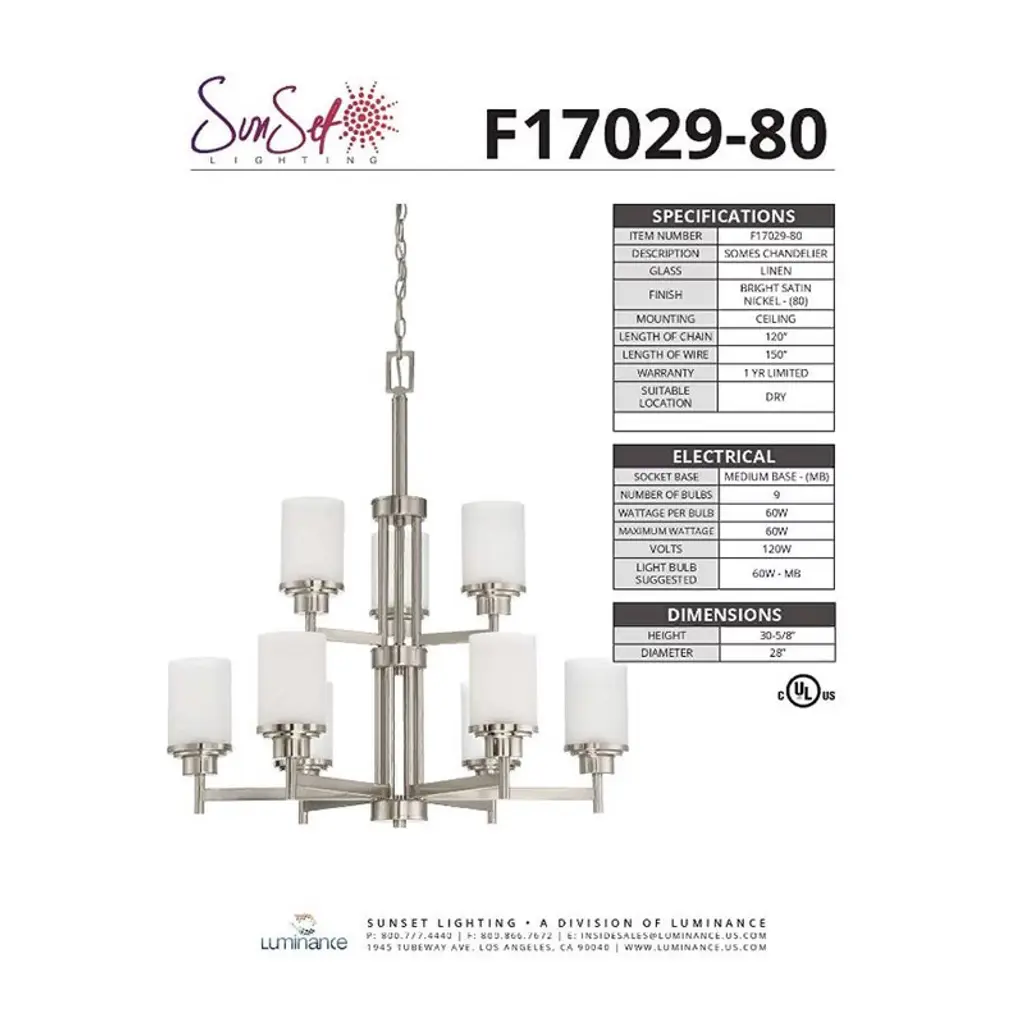 Sunset Lighting Somes 9-Light Two-Tier Chandelier, Linen Glass, Bright Satin Nickel Make a grand statement with the Somes two-tier chandelier. Nine lights with linen glass shades cast a warm, even glow, while the Bright Satin Nickel finish complements both modern and transitional interiors. Ideal for dining rooms, great rooms, and foyers with higher ceilings. Key Features: • Two-tier design with 9 lights for room-filling illumination • Linen glass shades provide soft, glare-reduced uplighting • Bright Satin Nickel finish suits modern and classic décor • Dimmable with compatible bulbs/switch (not included) to fine-tune ambiance • Easy ceiling-mount installation for indoor, dry locations Specifications: • Brand: Luminance Brands (Sunset Lighting) • Model/Part Number: F17029-80 (Somes) • Fixture Type: Chandelier (Two Tier, Uplight) • Finish: Bright Satin Nickel • Materials: Glass, Nickel • Number of Light Sources: 9 (bulbs not included) • Light Source Type: Medium Base Light Bulbs • Wattage: 60 watts • Voltage: 120V • Power Source: Corded Electric • Mounting Type: Ceiling Mount (Indoor, Dry Rated) • Included Components: Instructions, Fixture • Product Dimensions: 28" L × 28" W × 30.63" H • Item Weight: 23 lb