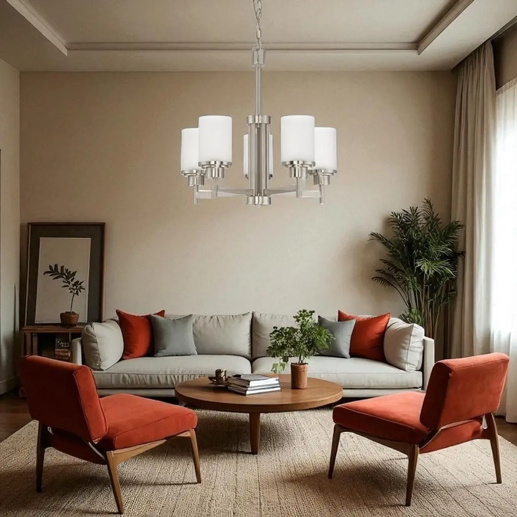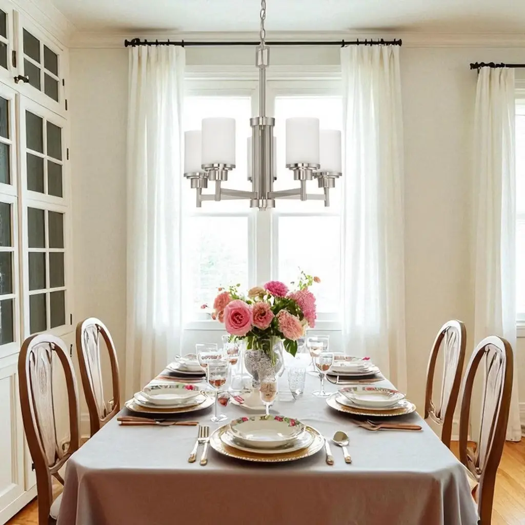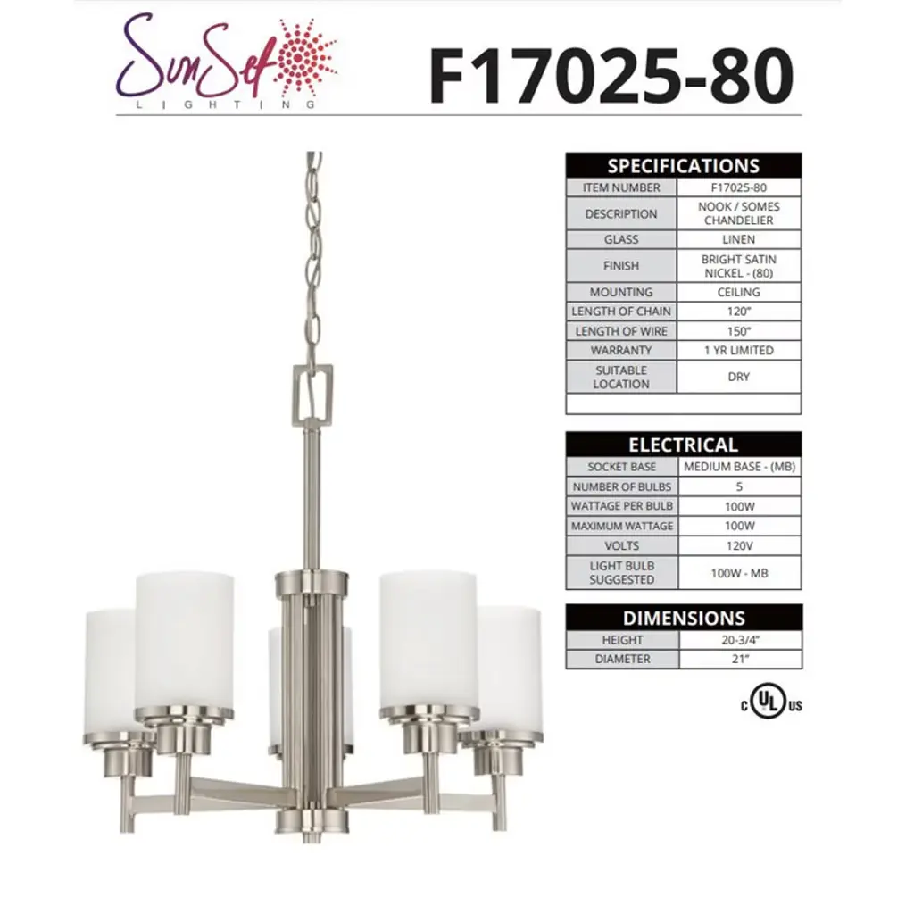 Sunset Lighting Somes 5-Light Chandelier, Linen Glass, Bright Satin Nickel A refined five-light chandelier from the Somes (Nook/Somes) collection, finished in Bright Satin Nickel and paired with linen glass shades for a soft, welcoming glow. Ideal for dining rooms, living spaces, and bedrooms, the generous 120" chain and 150" wire make installation simple on a variety of ceiling heights. Key Features: • Transitional 5-light chandelier with linen glass for softly diffused light • Bright Satin Nickel finish complements modern and classic décor • Dimmable design (with compatible bulbs/dimmer, not included) to set the perfect ambiance • Ceiling-mount installation with 120" chain and 150" wire for flexible hanging • Uses common medium-base (MB/E26) bulbs for easy replacement Specifications: • Item Number: F17025-80 • Description: Nook / Somes Chandelier • Brand: Sunset Lighting (Luminance) • Glass: Linen • Finish: Bright Satin Nickel (80) • Mounting: Ceiling • Chain Length: 120" • Wire Length: 150" • Suitable Location: Dry • Socket Base: Medium Base (MB/E26) • Number of Bulbs: 5 • Wattage per Bulb: 100W (max 100W each) • Voltage: 120V • Suggested Bulb: 100W MB/E26 (not included) • Height: 20-3/4" • Diameter: 21"