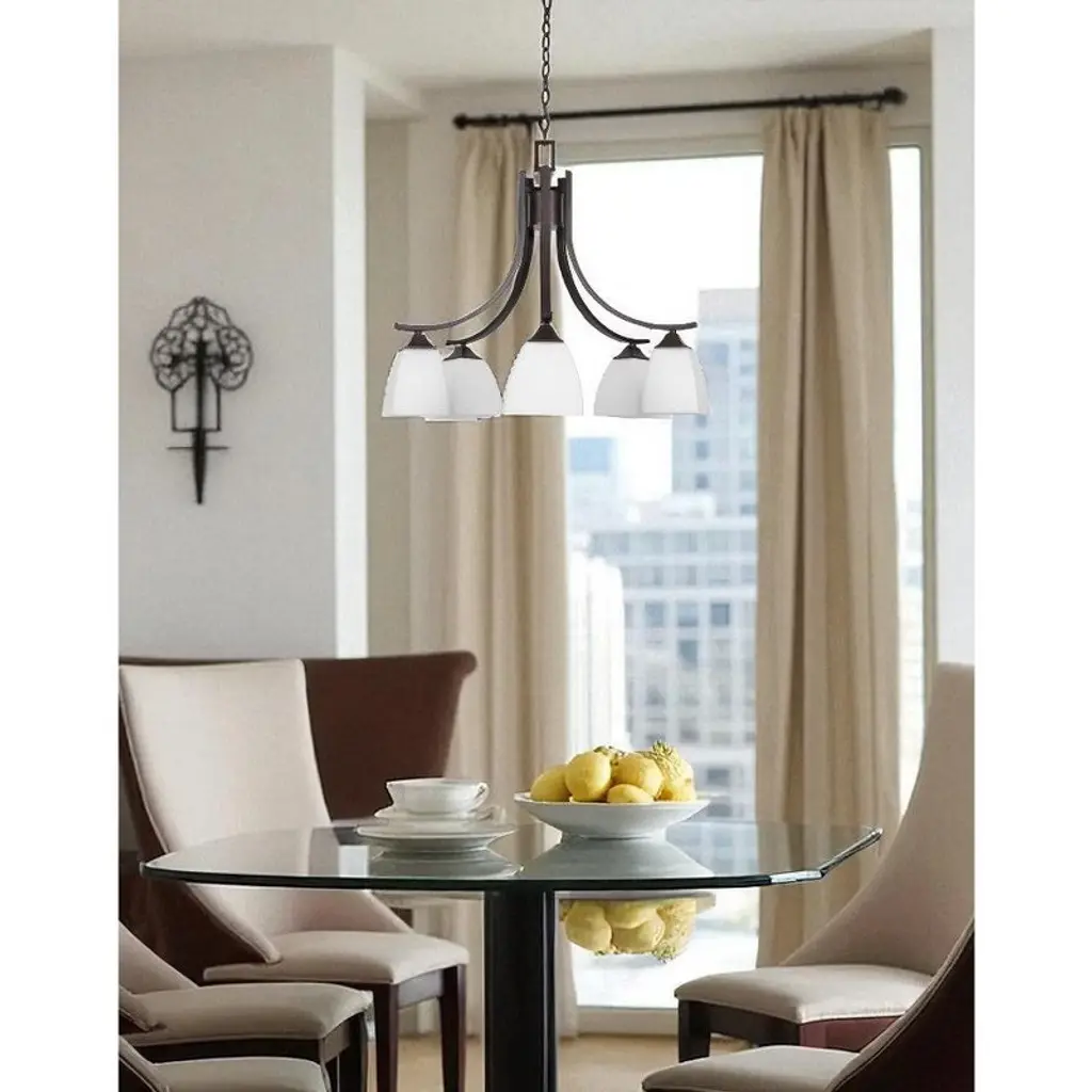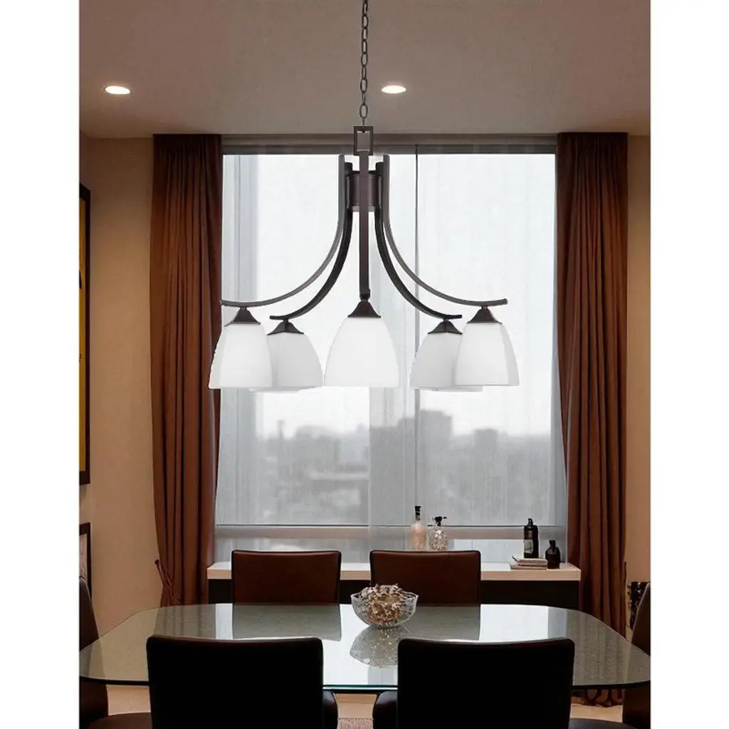 Sunset Lighting Starling 5-Light Down Chandelier, Provincial Bronze with Frosted Opal Glass Bring inviting, glare-softened illumination to dining rooms and foyers with the Starling chandelier. Its rich Provincial Bronze finish pairs with frosted opal glass bowls in a classic down-light design, delivering bright, comfortable light and timeless appeal for traditional or transitional interiors. Key Features: • Classic 5-light down chandelier for bright, comfortable room lighting • Provincial Bronze finish complements traditional and transitional décor • Frosted opal glass shades diffuse light for a warm, even glow • Uses medium-base bulbs for easy replacement Specifications: • Model/Part Number: F19006-64 (Starling) • Fixture Type: 5-Light Down Chandelier • Finish: Provincial Bronze • Glass: Frosted Opal • Dimensions: 25" Diameter × 23.5" Height • Sockets/Base: Medium Base (MB) • Wattage: 5 × 100W max (bulbs not included)