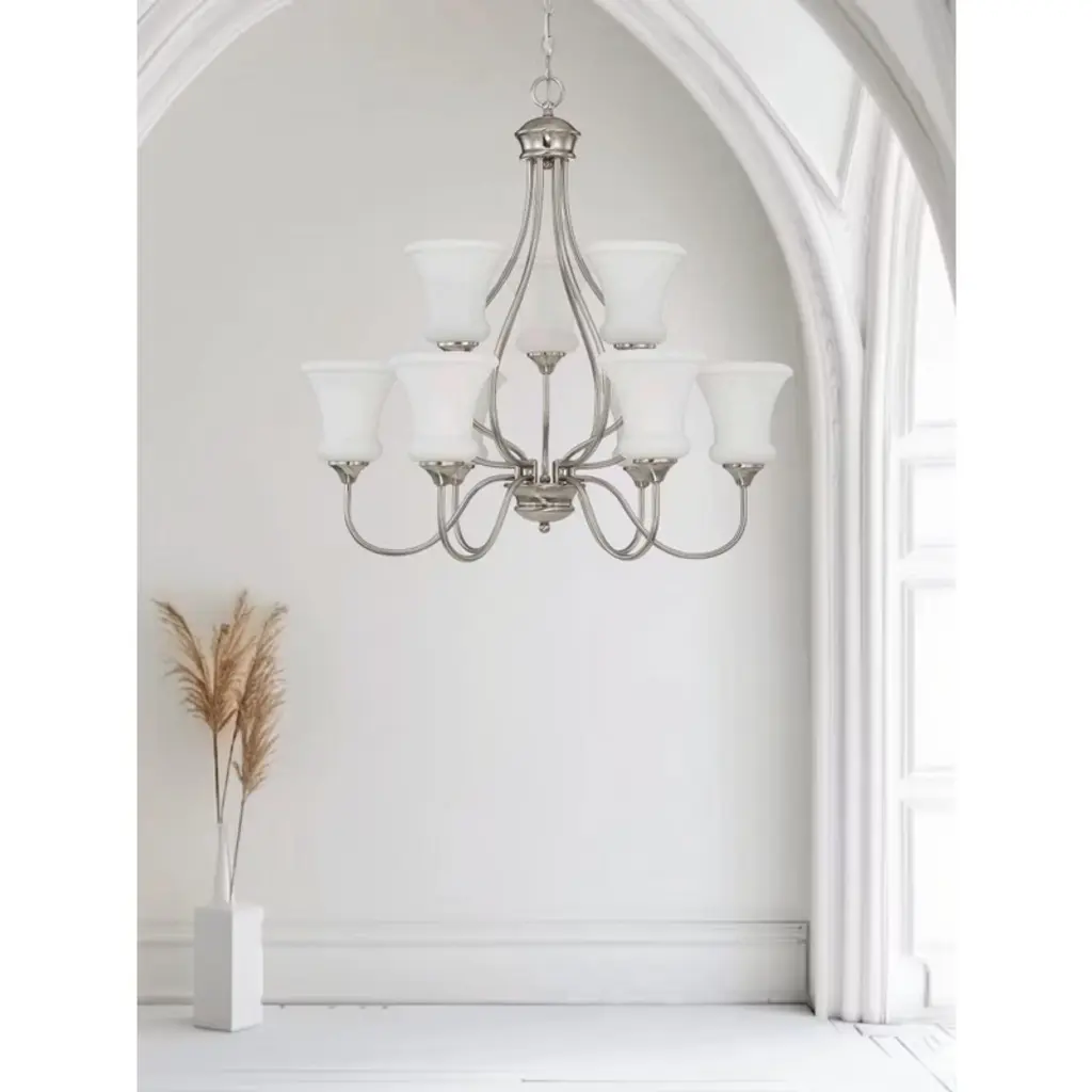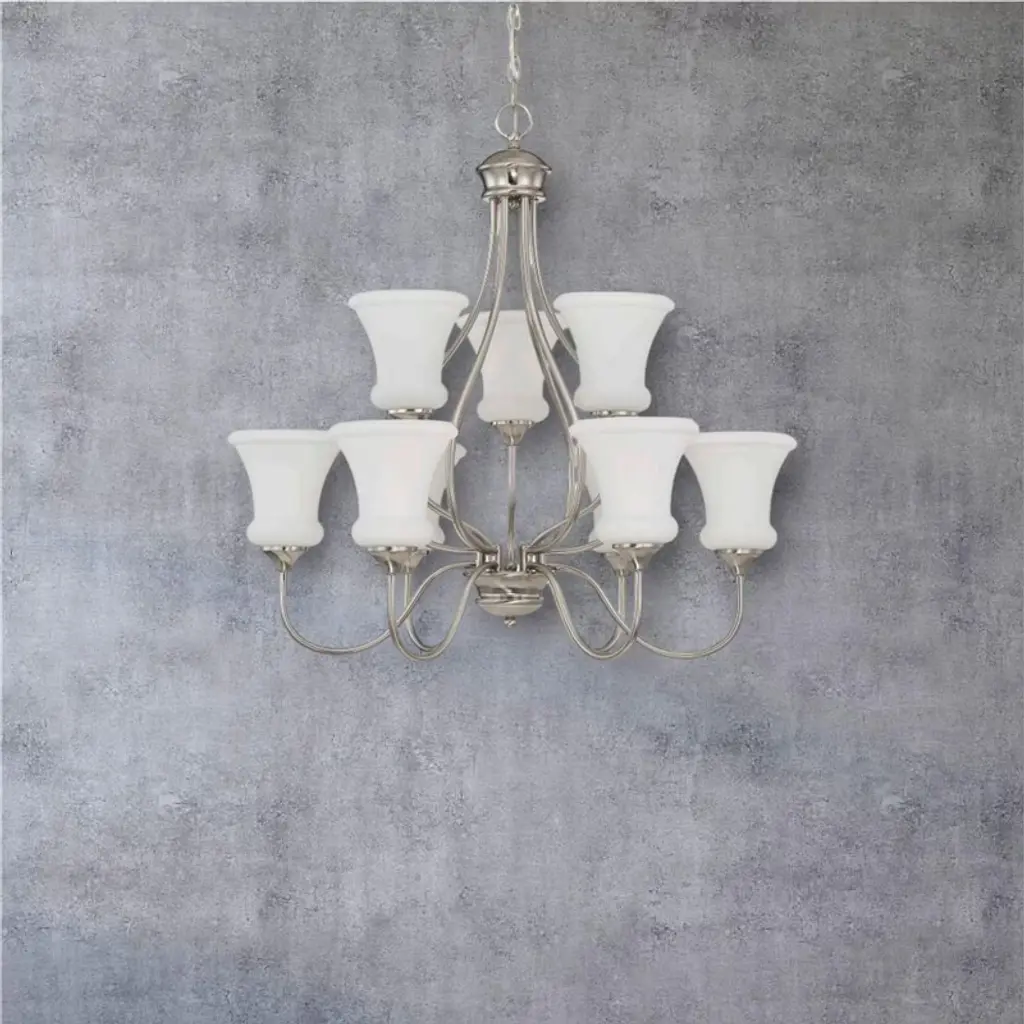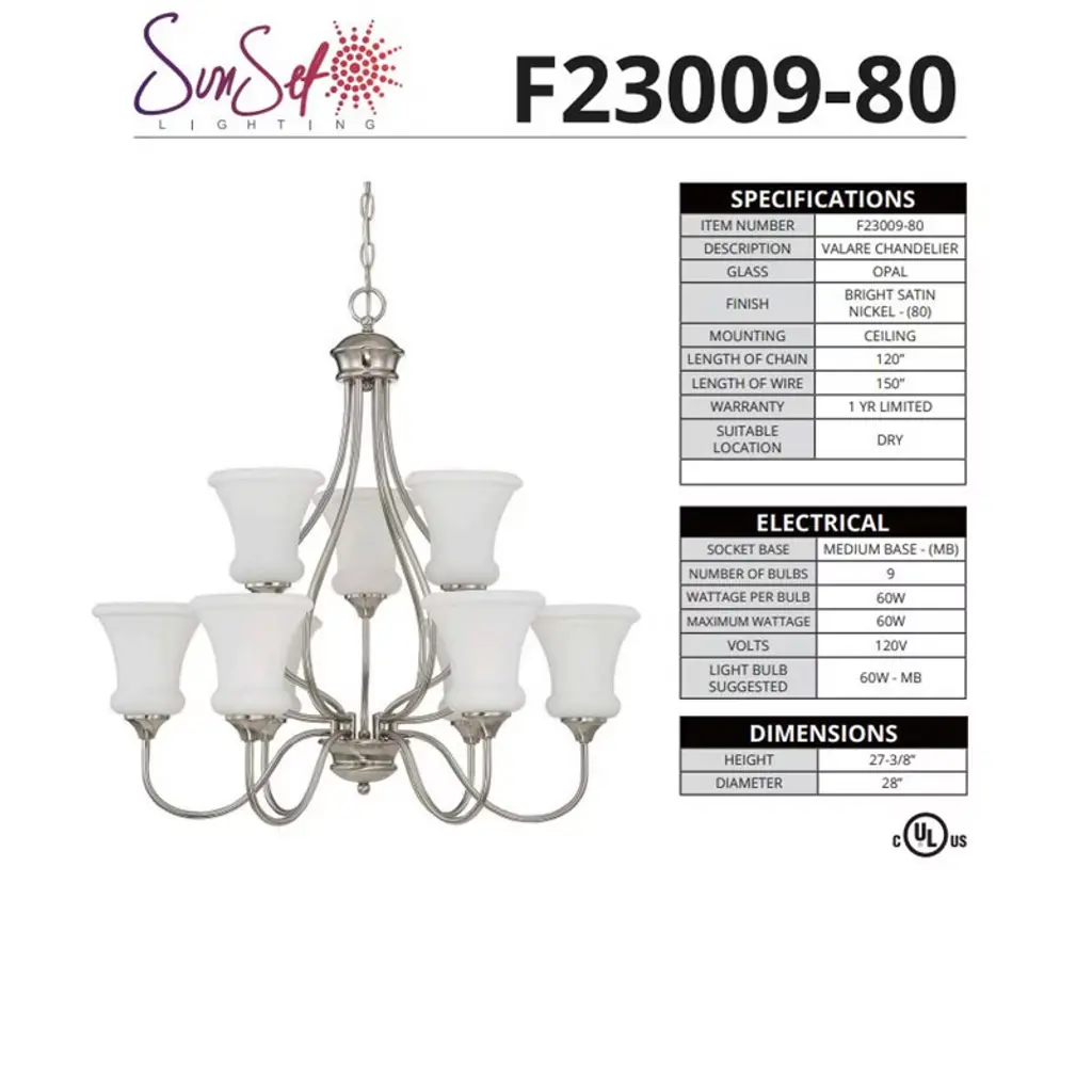 Sunset Lighting Valare 9-Light Two-Tier Chandelier, Opal Glass, Bright Satin Nickel (Dimmable) A sleek two-tier chandelier from the Valare collection that pairs a Bright Satin Nickel finish with smooth opal glass for soft, even illumination. Ideal for dining rooms, great rooms, and tall foyers, it installs easily with generous chain and wire lengths and works with dimmers for tailored ambiance. Key Features: • Two-tier, 9-light design for room-filling brightness • Opal glass shades provide soft, glare-reduced light • Bright Satin Nickel finish complements modern and transitional décor • Dimmable with compatible bulbs/switch (not included) • Adjustable hanging height with 120" chain and 150" wire; dry-location rated Specifications: • Item Number: F23009-80 (Valare Chandelier) • Finish: Bright Satin Nickel • Glass: Opal • Mounting: Ceiling • Suitable Location: Dry (Indoor) • Chain Length: 120" • Wire Length: 150" • Socket Base: Medium Base (MB / E26) • Number of Bulbs: 9 • Wattage per Bulb: 60W (max 60W each) • Voltage: 120V • Dimensions: 28"D × 27-3/8"H • Suggested Bulb: 60W MB / E26 (not included)