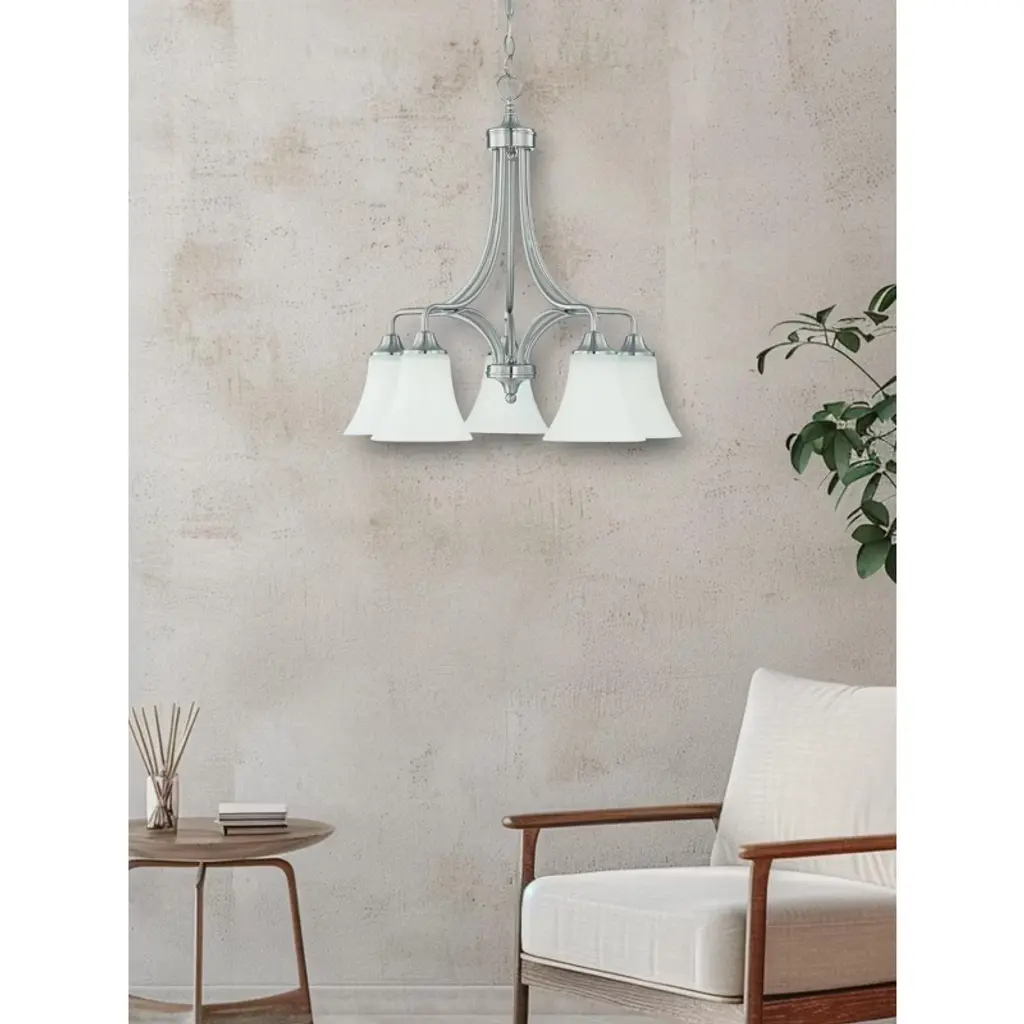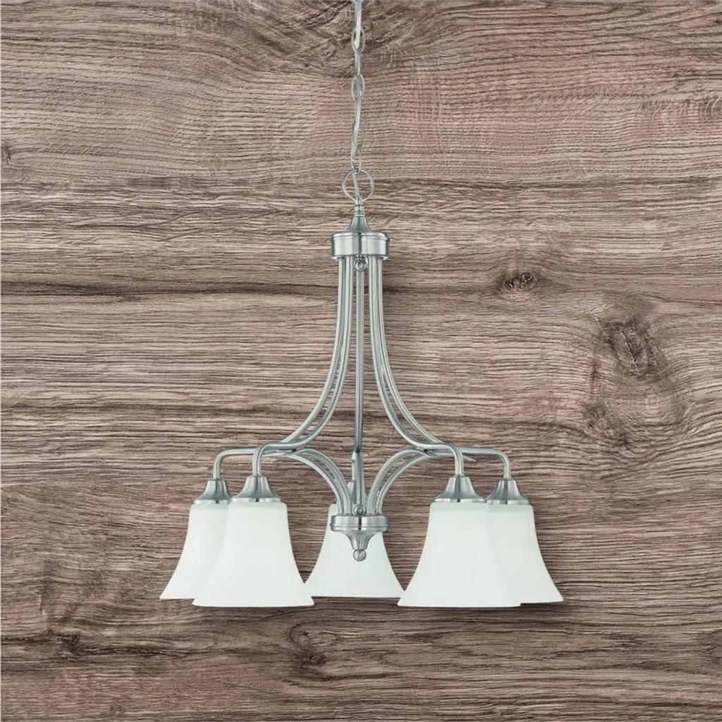 Sunset Lighting Darby 5-Light Down Chandelier, Opal Etched Glass, Bright Satin Nickel (100W MB) A clean, transitional five-light down chandelier featuring a Bright Satin Nickel finish and opal etched glass shades for soft, comfortable illumination—perfect over dining tables and kitchen islands. Key Features: • Five-light down configuration for bright, task-friendly lighting • Opal etched glass shades provide soft, even glow • Medium base (MB/E26) sockets; dimmer-friendly with compatible bulbs/switch (not included) Specifications: • Model/Part Number: F18056-80 (Darby) • Finish: Bright Satin Nickel • Glass: Opal Etched • Dimensions: 23-1/2"D × 23-1/2"H • Number of Lights: 5 • Socket/Base: Medium Base (MB/E26) • Wattage: 5 × 100W max (bulbs not included)