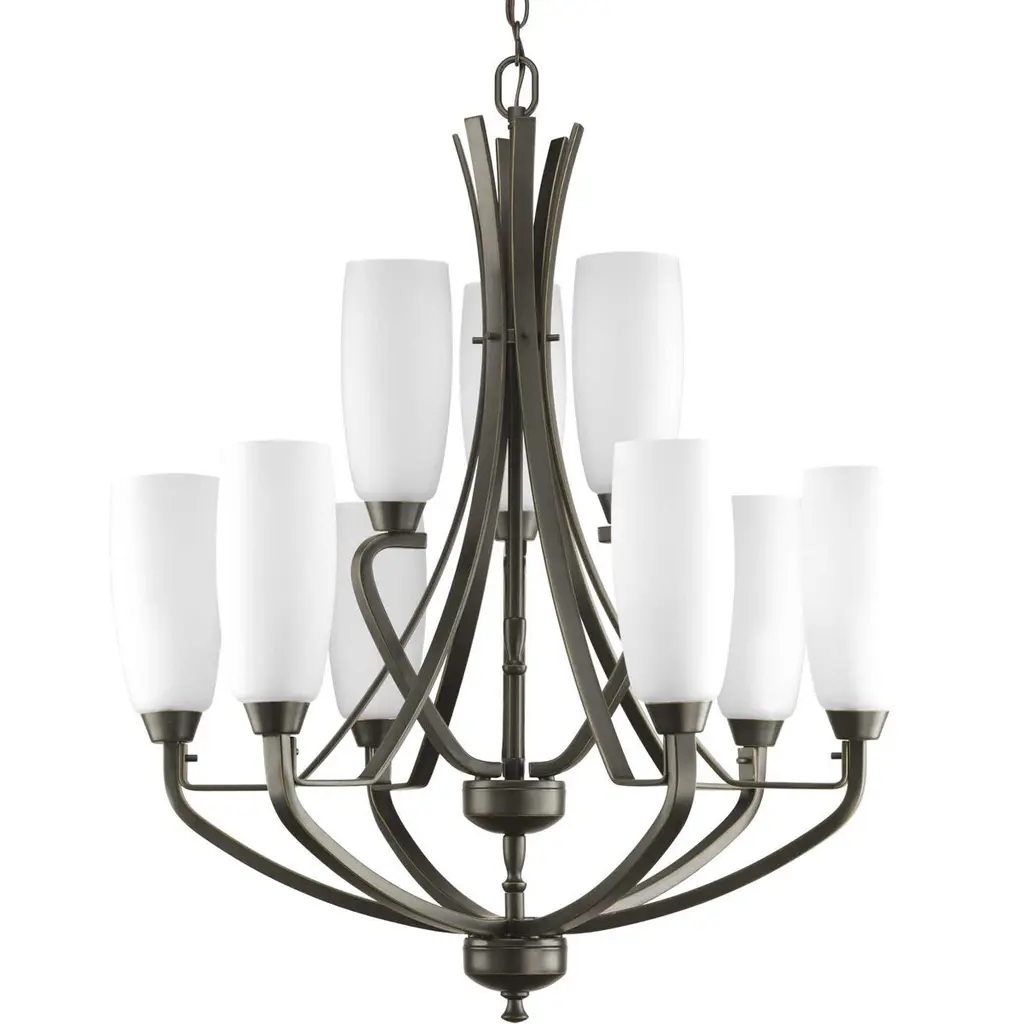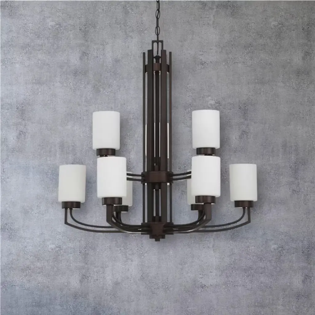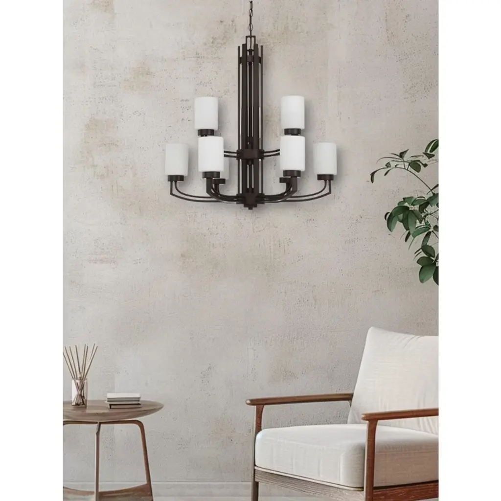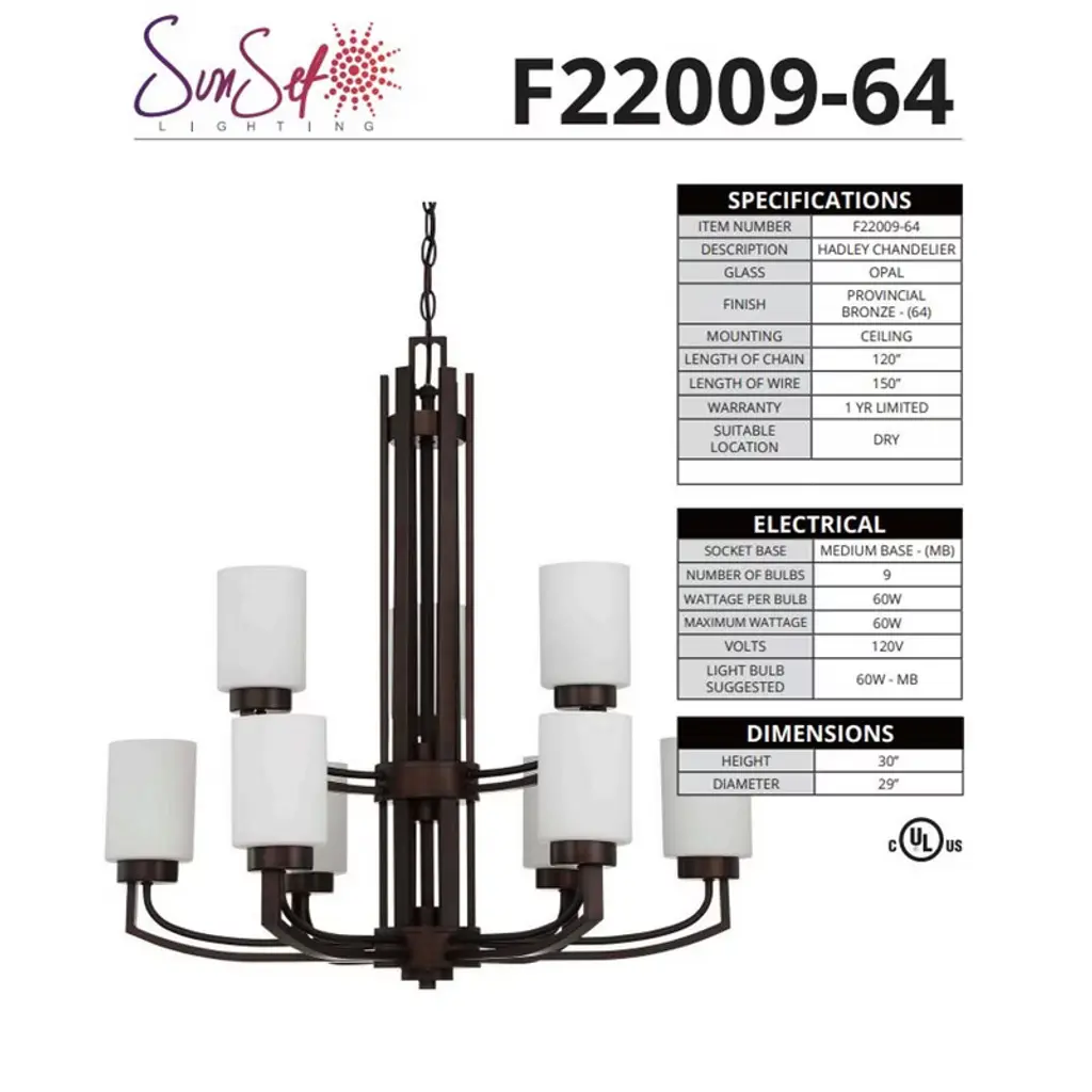 Sunset Lighting Hadley 9-Light Two-Tier Chandelier, Opal Glass, Provincial Bronze (Dimmable) A classic two-tier chandelier from the Hadley collection featuring rich Provincial Bronze metalwork and smooth opal glass shades. Ideal for grand entryways and dining rooms, its nine-light design delivers warm, even illumination and installs easily with generous chain and wire lengths. Key Features: • Two-tier, 9-light chandelier for room-filling ambiance • Provincial Bronze finish with opal glass diffusers • Dimmable with compatible bulbs and wall dimmer (not included) • Medium-base (MB/E26) sockets for easy bulb selection • Adjustable hanging height with 120" chain and 150" wire; dry-location rated Specifications: • Item Number: F22009-64 (Hadley Chandelier) • Finish: Provincial Bronze (64) • Glass: Opal • Mounting: Ceiling • Suitable Location: Dry (Indoor) • Chain Length: 120" • Wire Length: 150" • Socket Base: Medium Base (MB/E26) • Number of Bulbs: 9 • Wattage per Bulb: 60W (max 60W each) • Voltage: 120V • Dimensions: 29"D × 30"H • Suggested Bulb: 60W MB/E26 (not included)