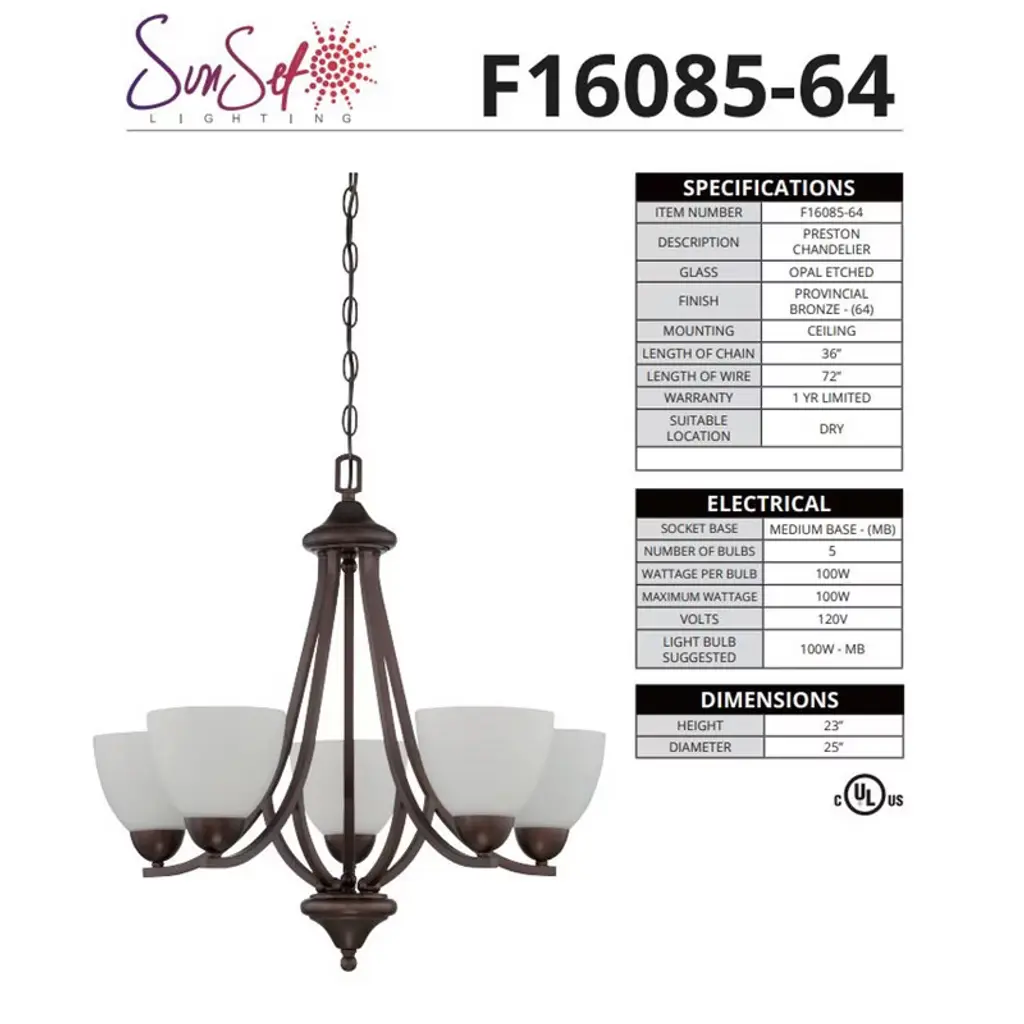 Sunset Preston 5-Light Ceiling Chandelier, Provincial Bronze with Opal Etched Glass Warm and welcoming, the Preston chandelier pairs a rich Provincial Bronze finish with opal etched glass shades to deliver soft, even illumination. Ideal for dining rooms, kitchens, and living spaces, it includes adjustable hanging hardware for a tailored installation in dry indoor locations. Key Features: • Classic 5-light chandelier from the Preston collection • Provincial Bronze finish with opal etched glass shades • Dimmable with compatible bulbs/switch (bulbs not included) • Adjustable hanging height with 36" chain and 72" wire • Medium-base (MB/E26) sockets for easy bulb selection Specifications: • Item Number: F16085-64 • Description: Preston Chandelier • Finish: Provincial Bronze • Glass: Opal Etched • Mounting: Ceiling • Suitable Location: Dry (Indoor) • Chain Length: 36" • Wire Length: 72" • Socket Base: Medium Base (MB/E26) • Number of Bulbs: 5 • Wattage per Bulb: 100W (max 100W each) • Voltage: 120V • Suggested Bulb: 100W MB/E26 (not included) • Height: 23" • Diameter: 25"