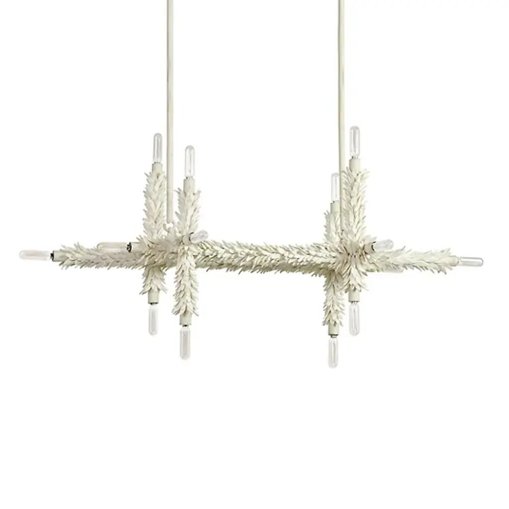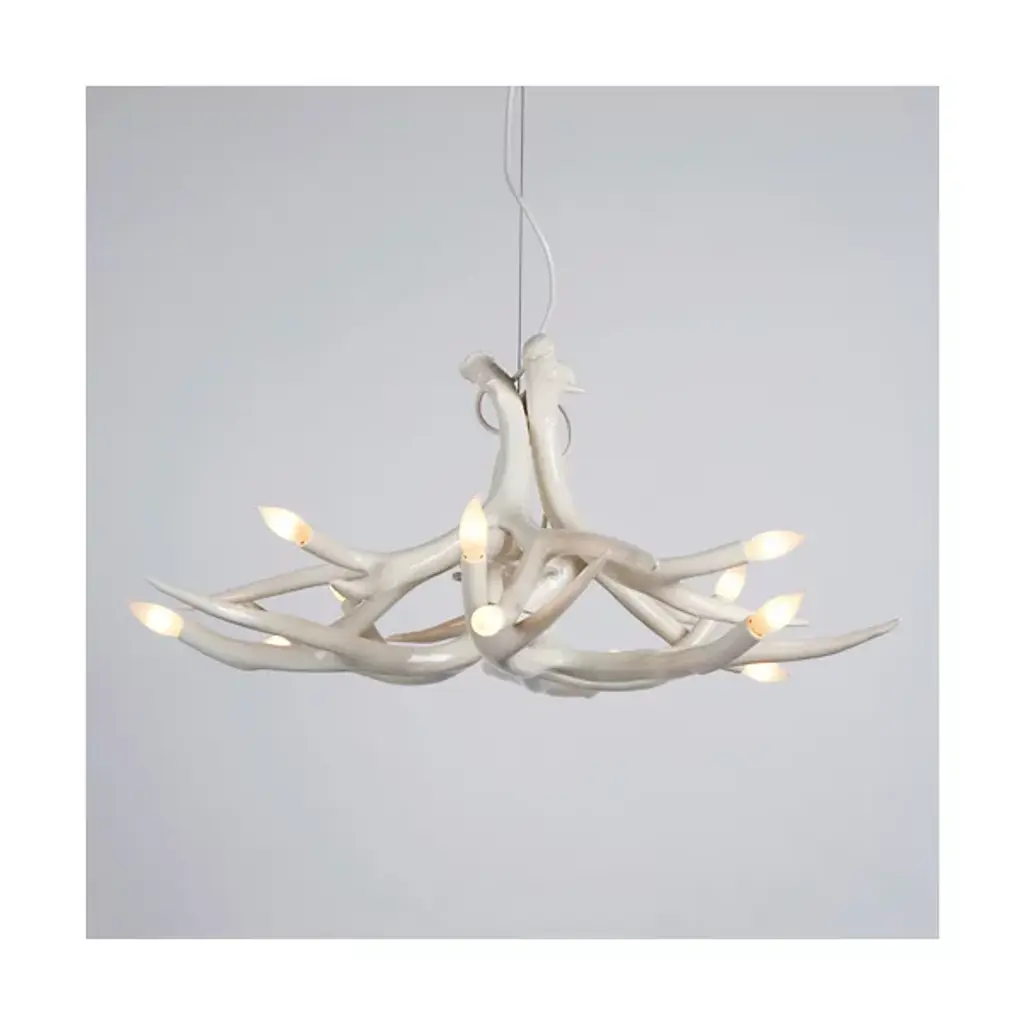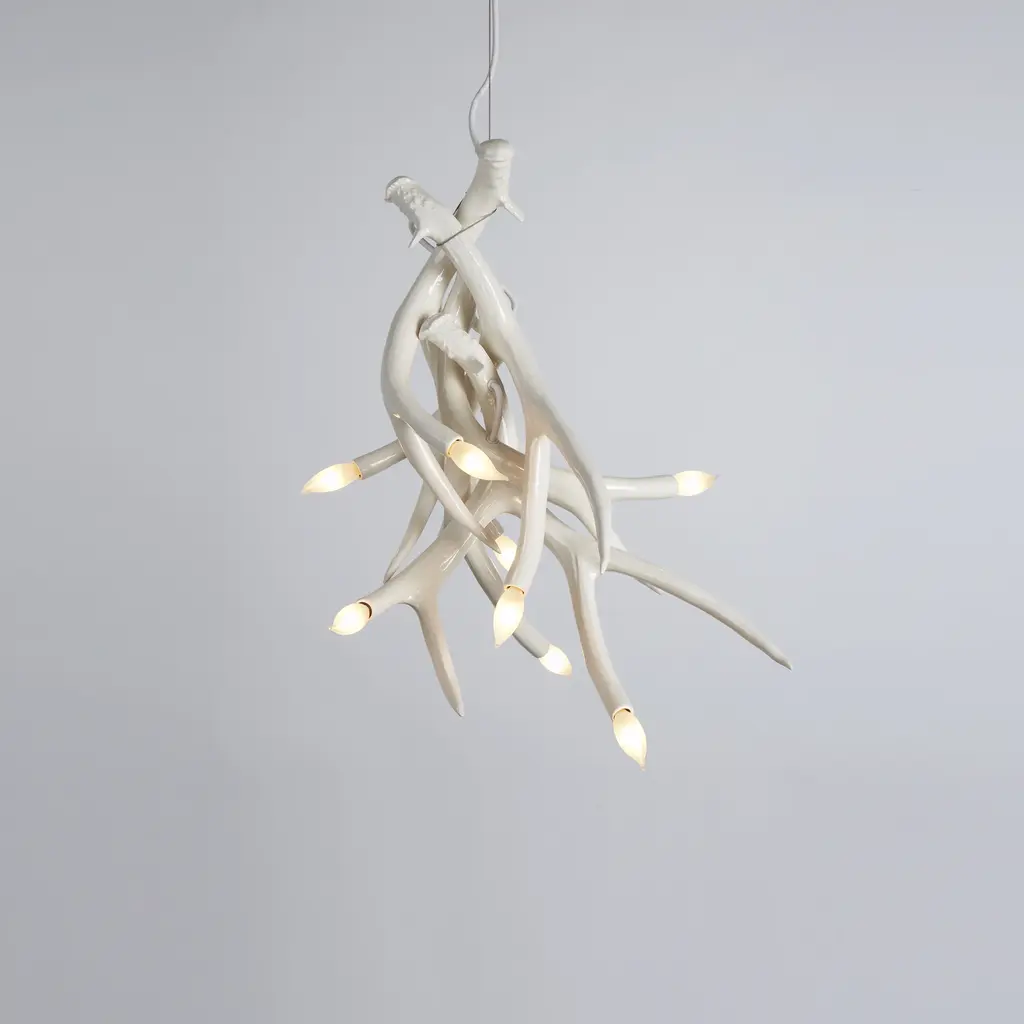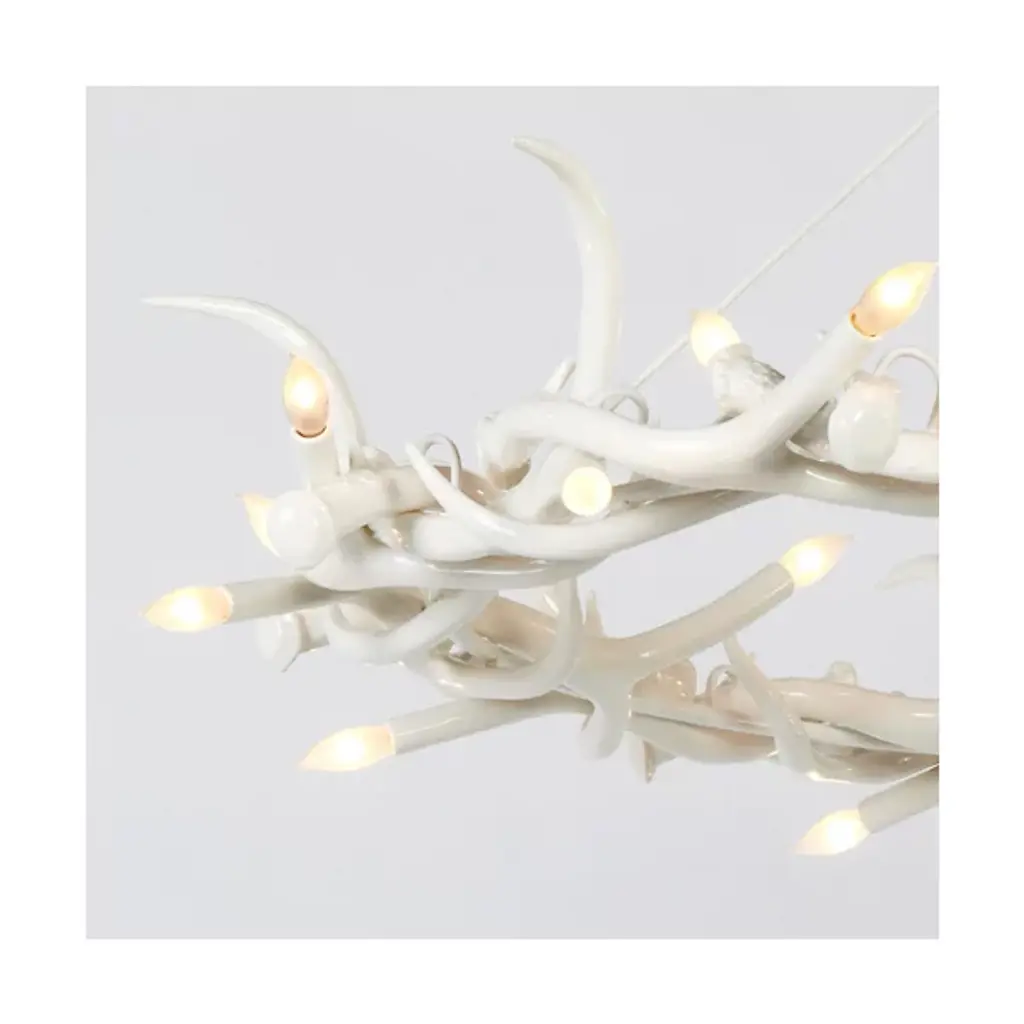 The Superordinate Antler Chandelier - 27 Antler Ring by Roll & Hill brings a stunning, rustic touch to the home. From designer Jason Miller, this captivating fixture evokes the look of a winter cabin while showcasing a sharp, modern design. A large ring made of ceramic antlers hovers in place, suspended by a set of cables. Flame tip frosted lamps emit warm light at the end of each piece, offering a blanketing ambiance that transforms a space.