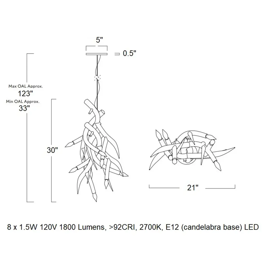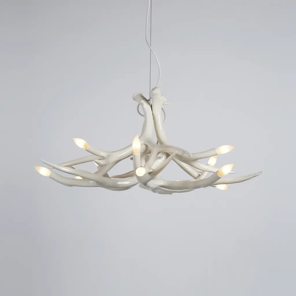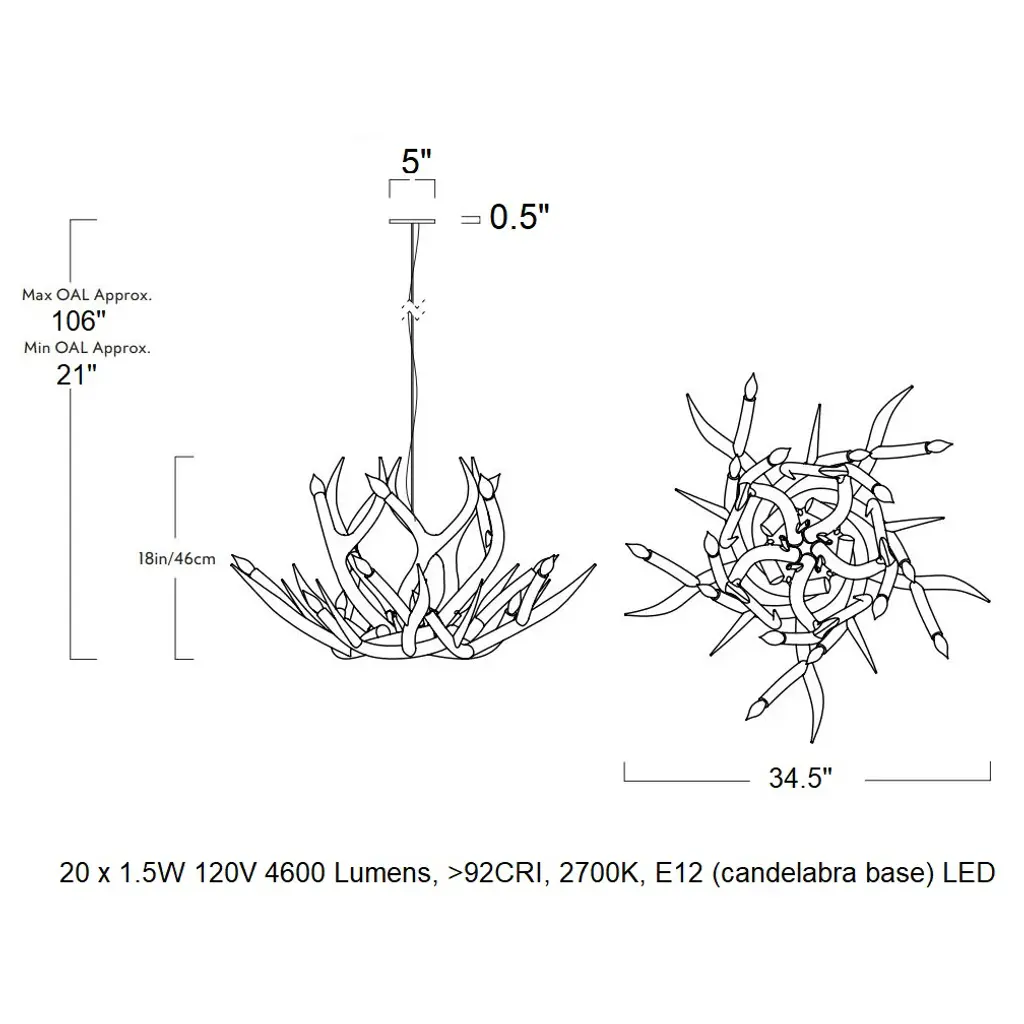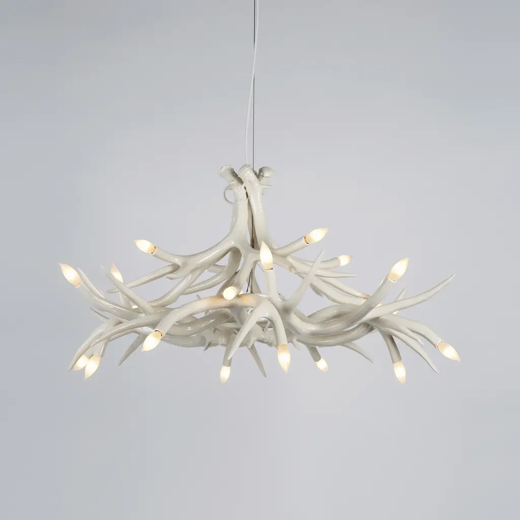 Indulge in the rustic elegance of the Superordinate Antler LED Chandelier from Roll & Hill. Crafted by designer Jason Miller, this ceramic fixture exudes a modern and distinctive allure with its sharp antlers suspended from a slender cord. The flame tip frosted lamps at the end of each piece emit a warm and inviting glow, making this chandelier ideal for any winter cabin or upscale home. Highlights