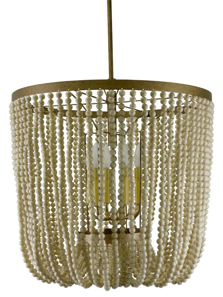 Inspired by the ballroom fixtures of a bygone era, this chandelier in antiqued gold iron glimmers in cascading cream beads that taper in a removable wooden tassel accent.