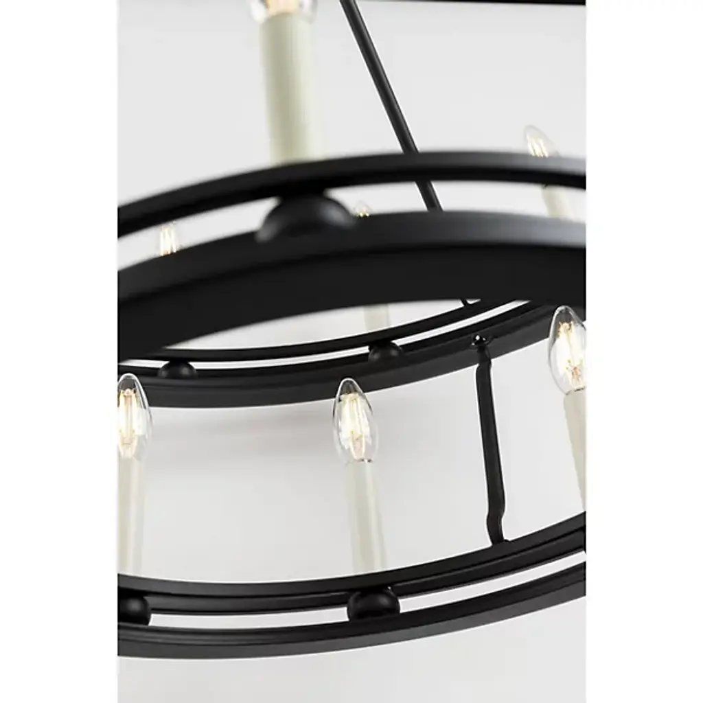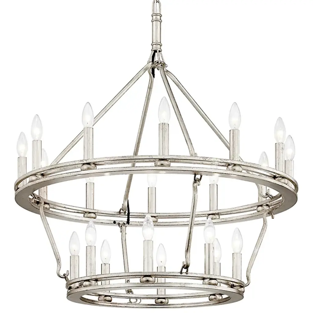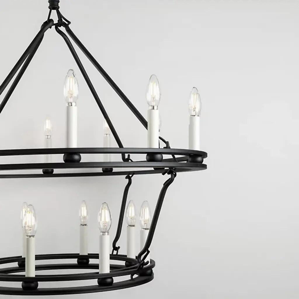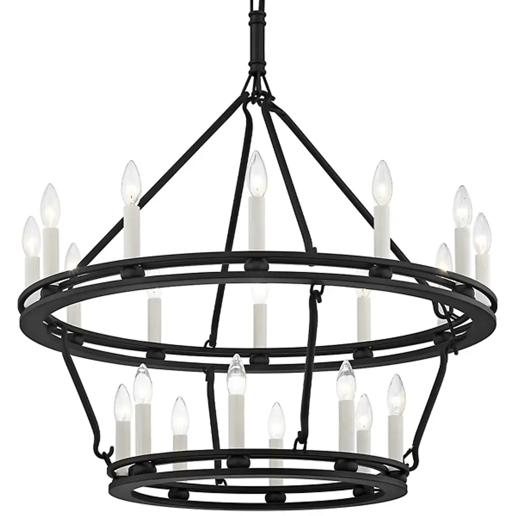 A large presence for open areas, the Sutton Tiered Chandelier by Troy Lighting offsets its large framing with a simple motif that makes it a modern favorite for a variety of uses. Key to its minimalist look is the ensemble of naked candelabra lights, which ring large hand-worked Iron hoops. For large foyers and formal dining rooms, it offers a handsome throwback look that's still well defined by its modern look.