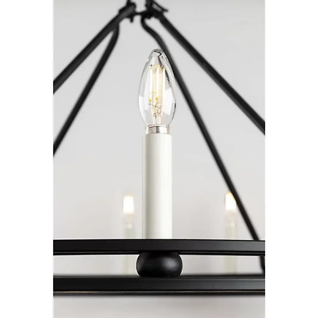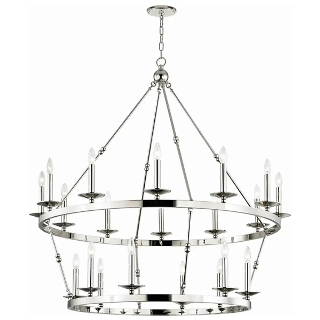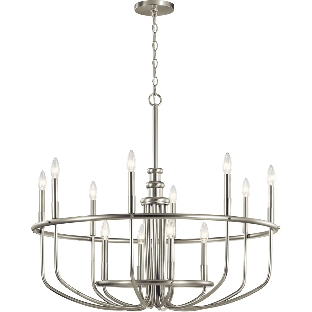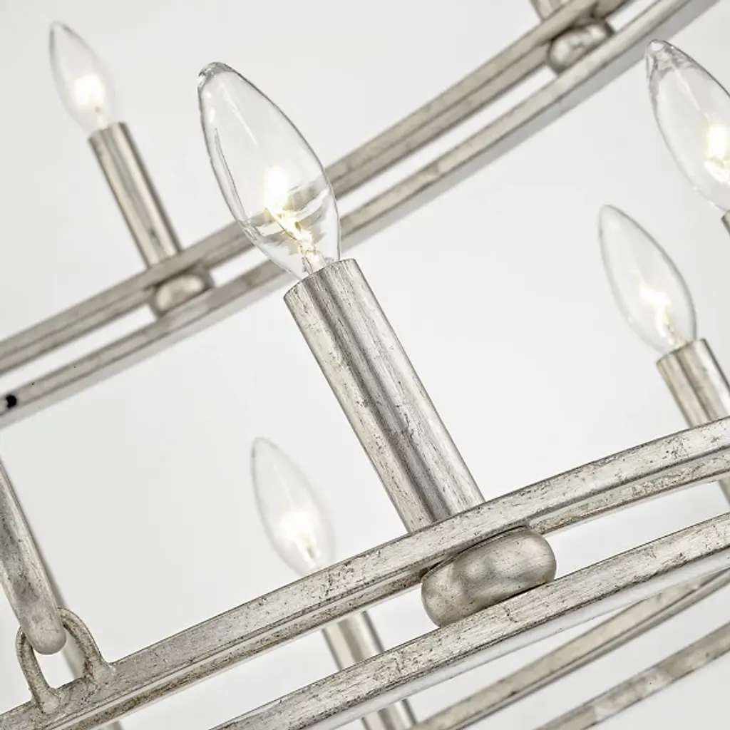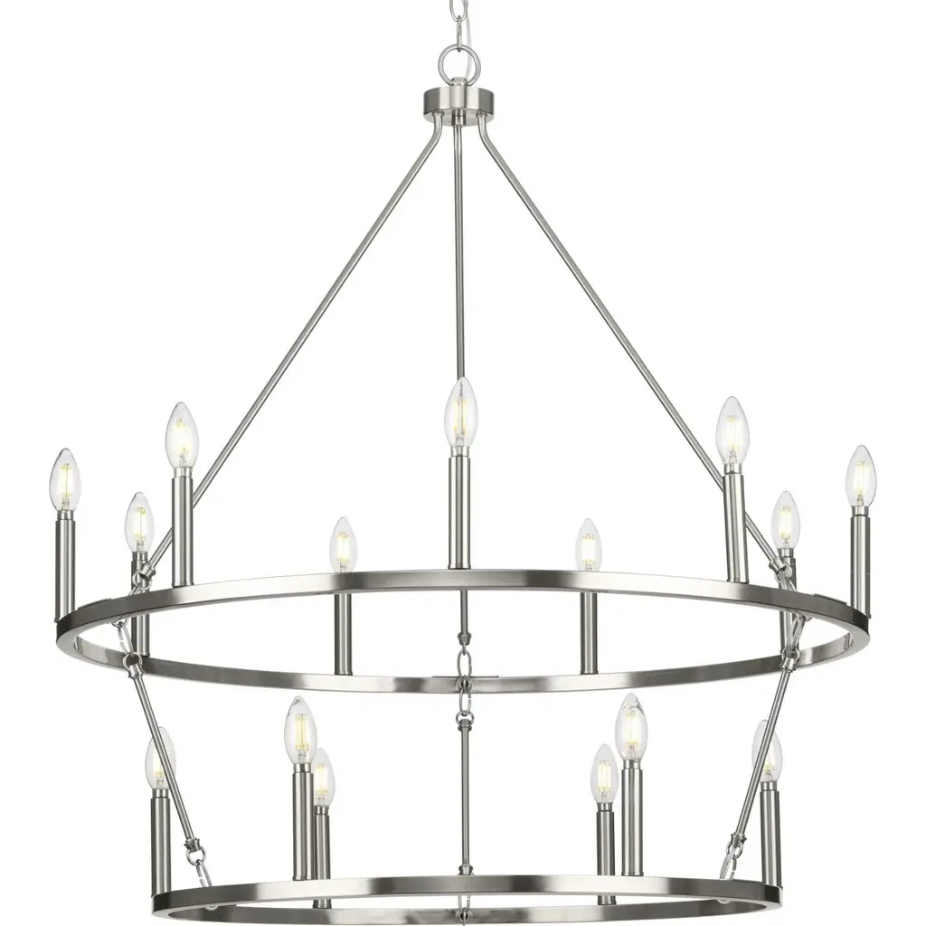 A large presence for open areas, the Sutton Tiered Chandelier by Troy Lighting offsets its large framing with a simple motif that makes it a modern favorite for a variety of uses. Key to its minimalist look is the ensemble of naked candelabra lights, which ring large hand-worked Iron hoops. For large foyers and formal dining rooms, it offers a handsome throwback look that's still well defined by its modern look.