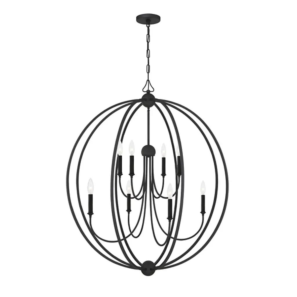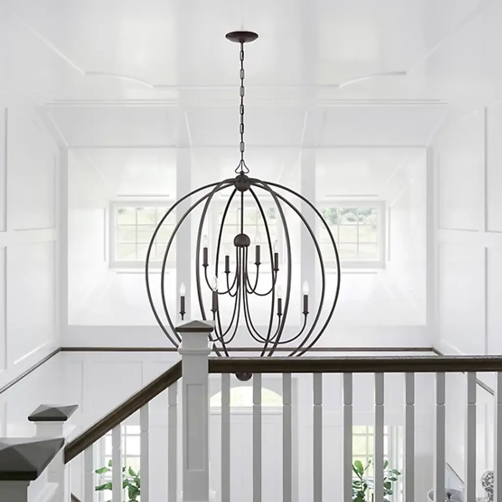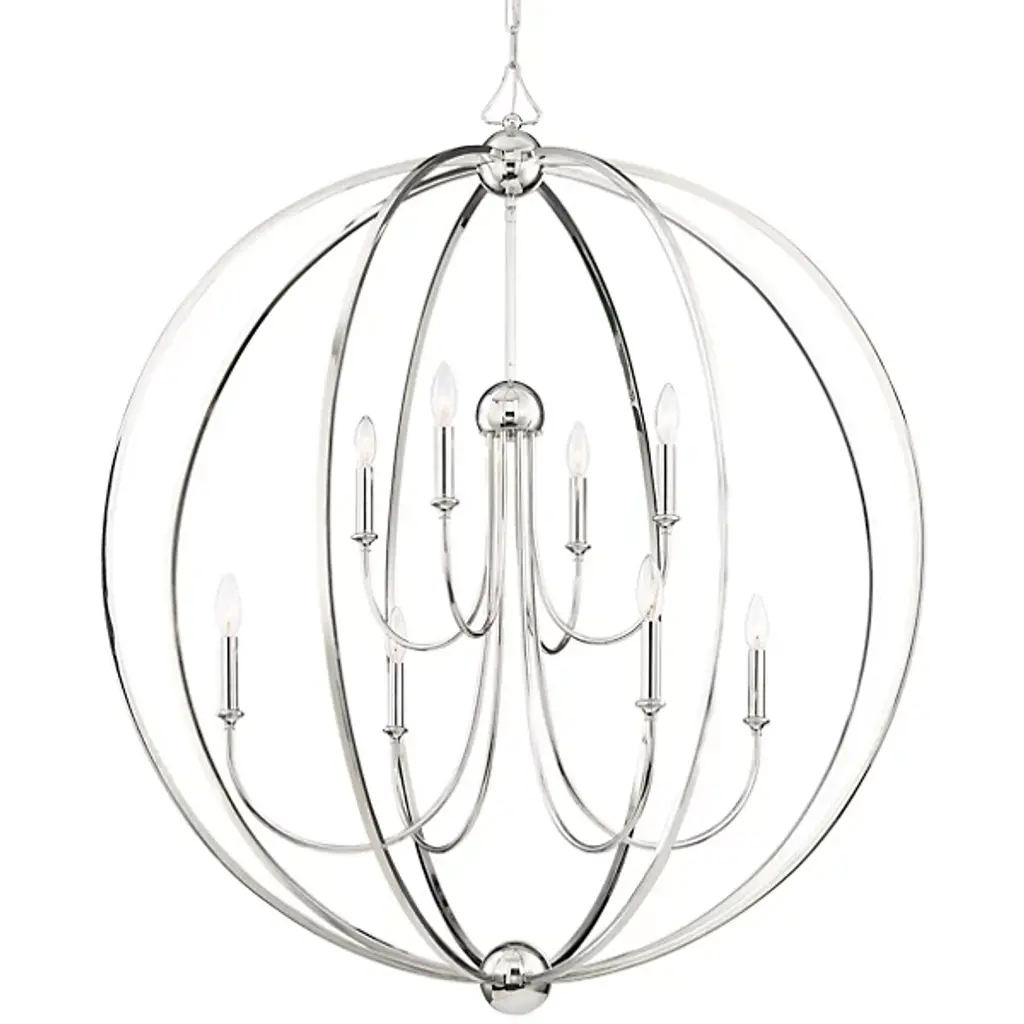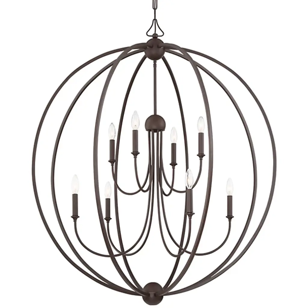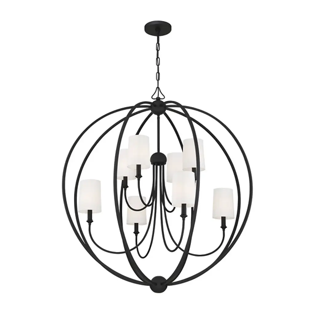 That special decorative detail. The Sylvan 8-Light Chandelier by Crystorama makes an impact. Its spherical caged frame surrounding a tiered candelabra looks striking even when it's not illuminated. Crafted of steel and done in a rich metal finish, it's a timeless design perfect for contemporary or transitional homes. White cylindrical lamp shades complete this ceiling fixture and allow for diffused ambient lighting in a stylish dining room or living space.