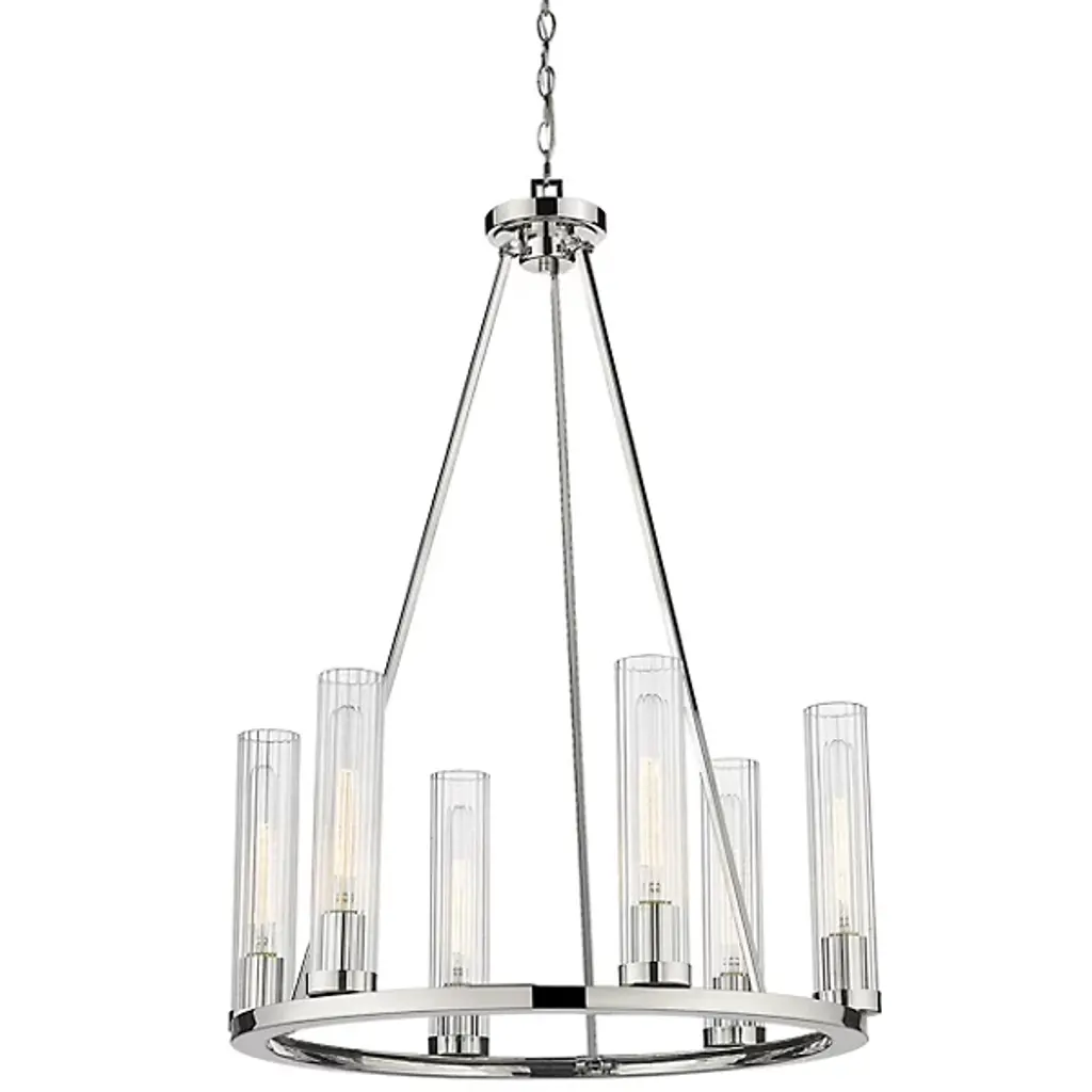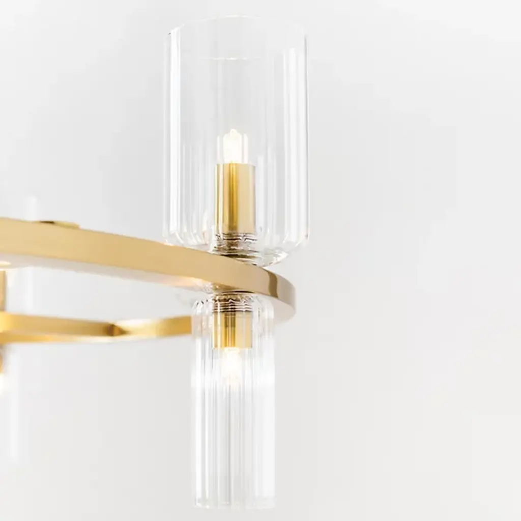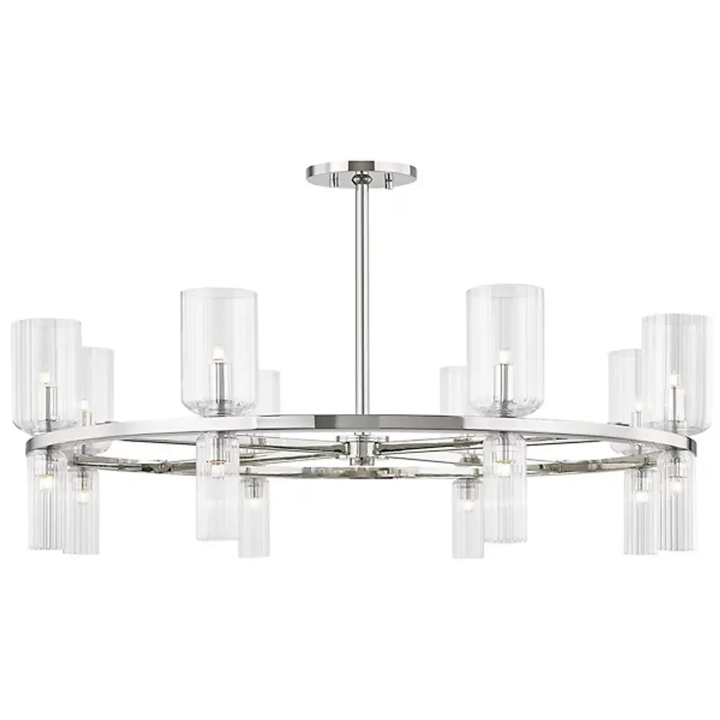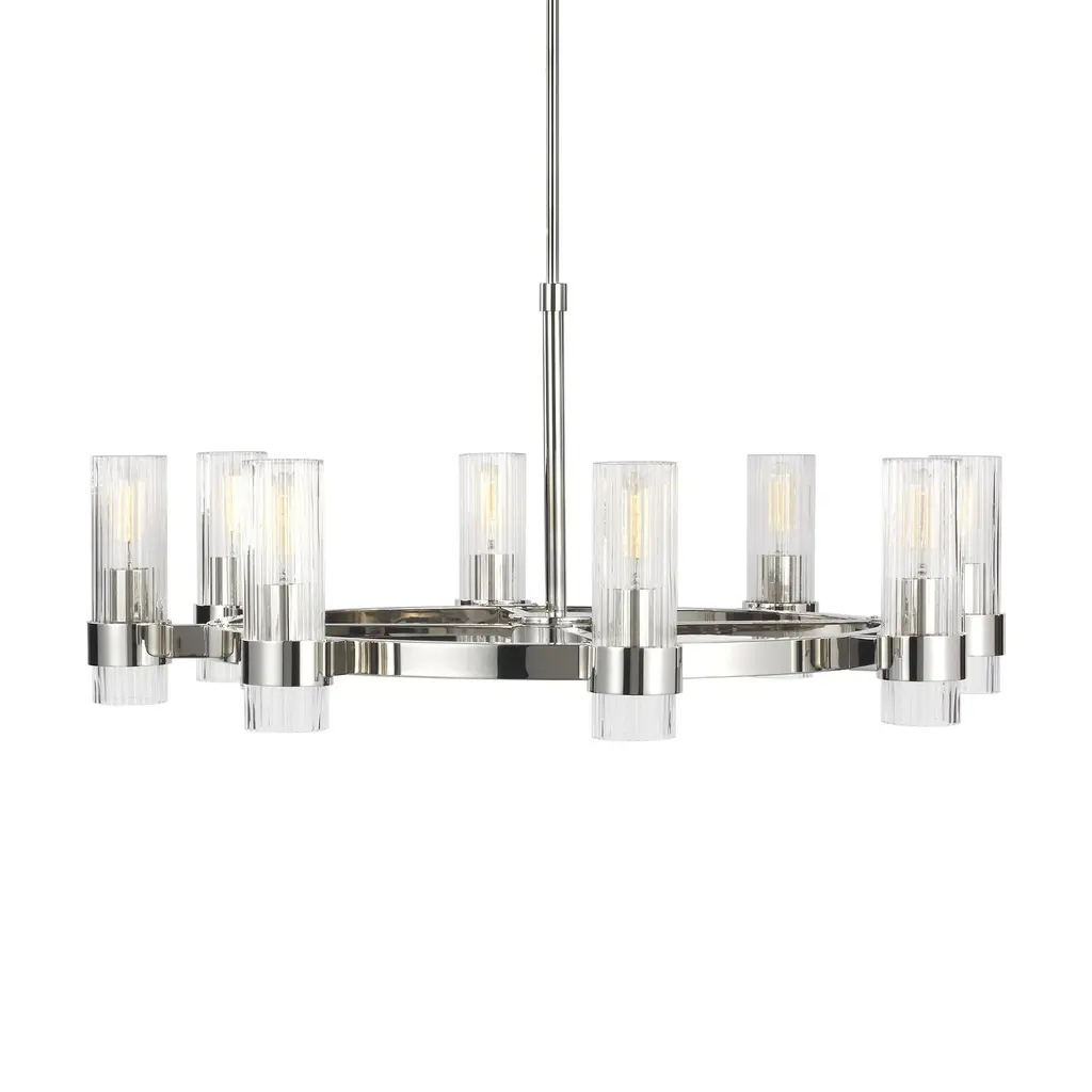 The stylish and modern Tabitha Chandelier from Mitzi incorporates a series of classic forms in a decidedly modern way, introducing a new look to big statement spaces like foyers and dining rooms with ease. It starts by building a frame on a classic Steel hoop, which is finished in a modern tone with a sturdy rod suspension. This frame is adorned with a collection of Clear Glass cloche shades, set on both the top and bottom of the frame in differing sizes with a set of candelabra bulbs to enhance its light effect. The result is a stylish contemporary lamp that has strong roots in traditional style—a timeless favorite with an architectural quality that defines a room.