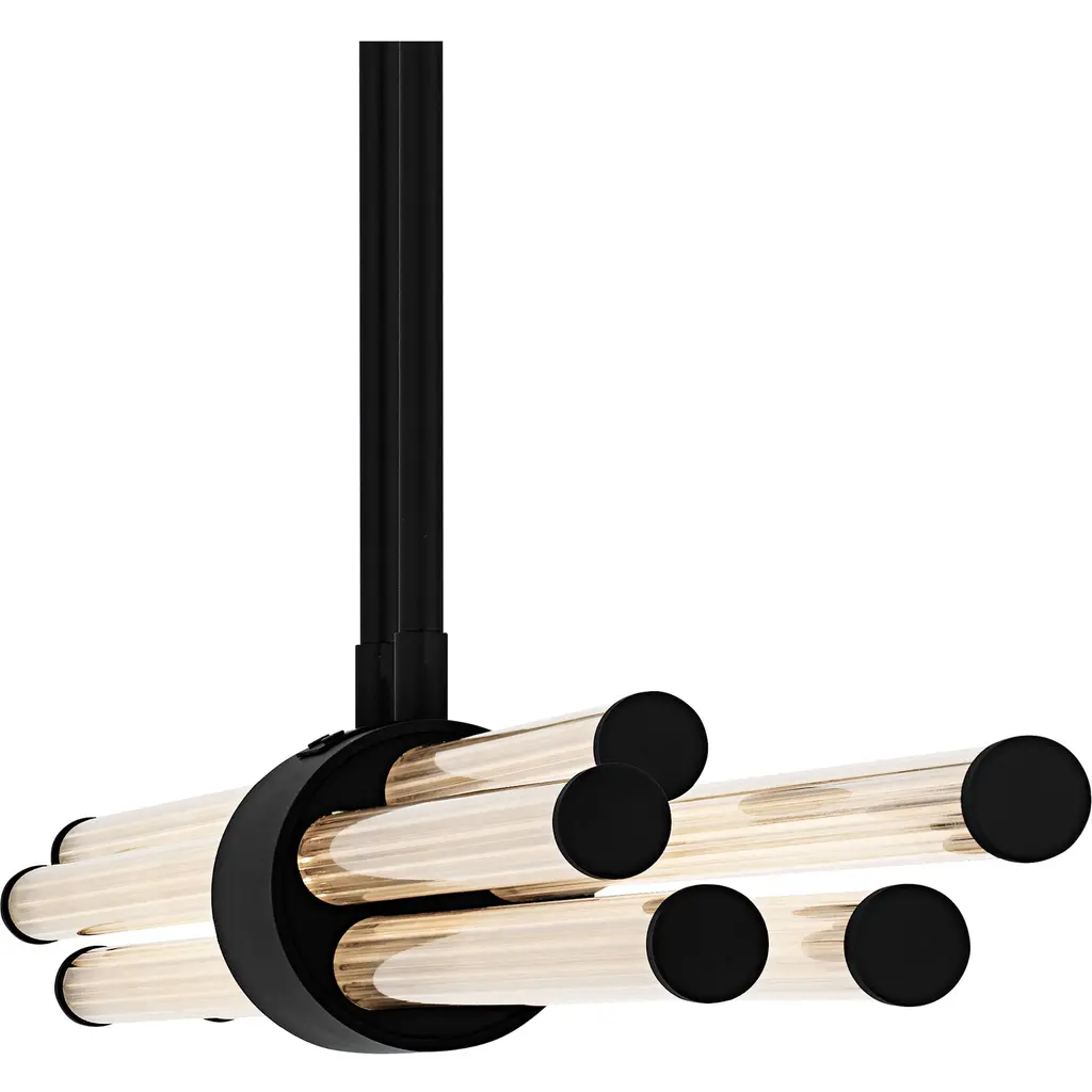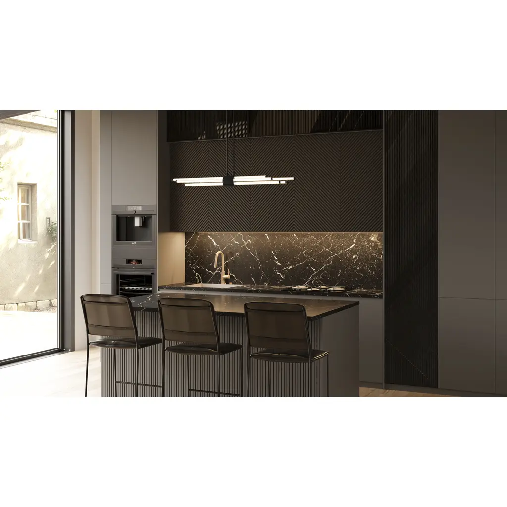 The Talbott island chandelier features a striking modern design with a sleek, minimalist aesthetic. The rectangular canopy contrasts with the series of parallel cylindrical acrylic rods, creating a unique and eye-catching visual. Each rod houses an integrated LED light for maximum light output and energy efficiency. Talbott is available in matte black or brushed gold to suit various home decor styles.
