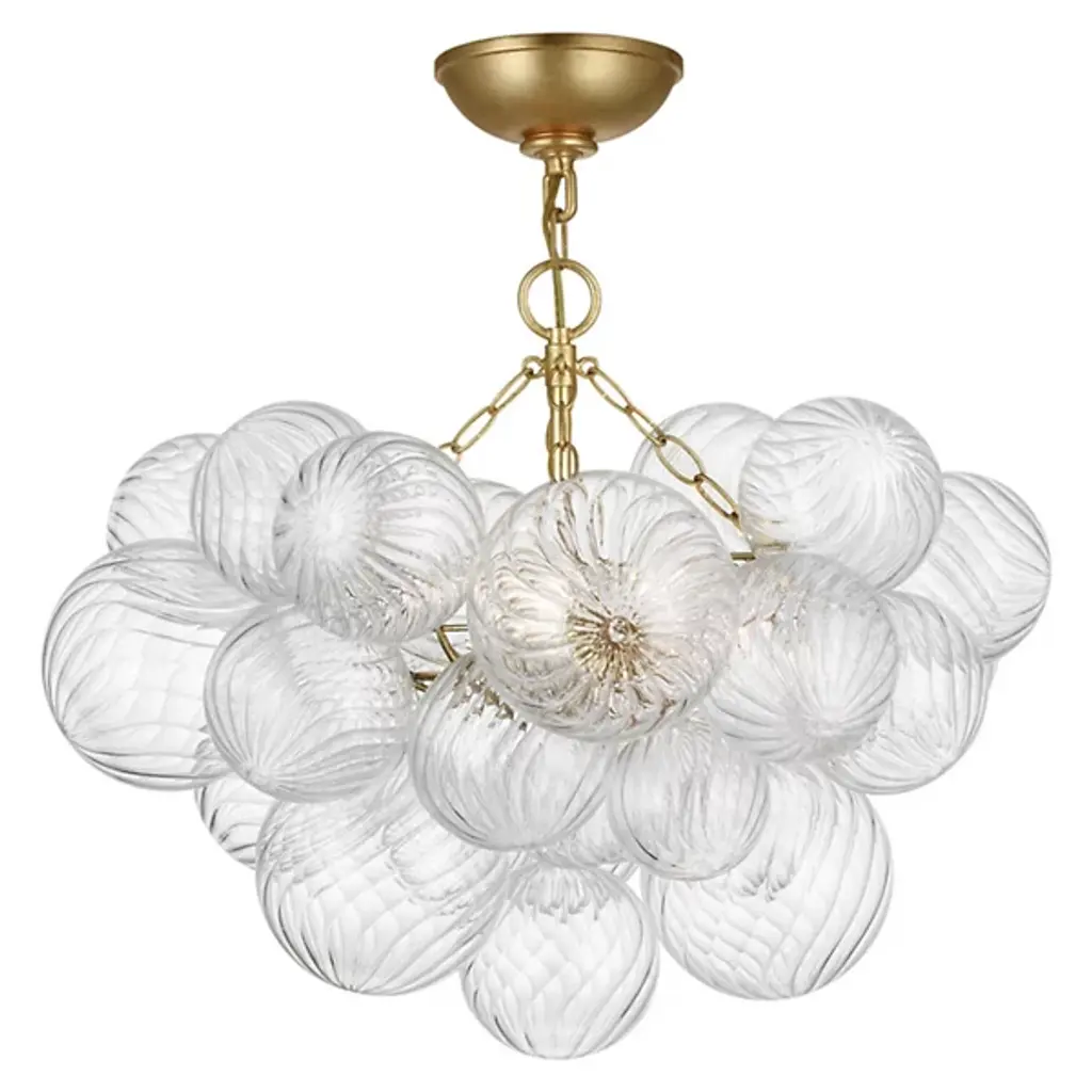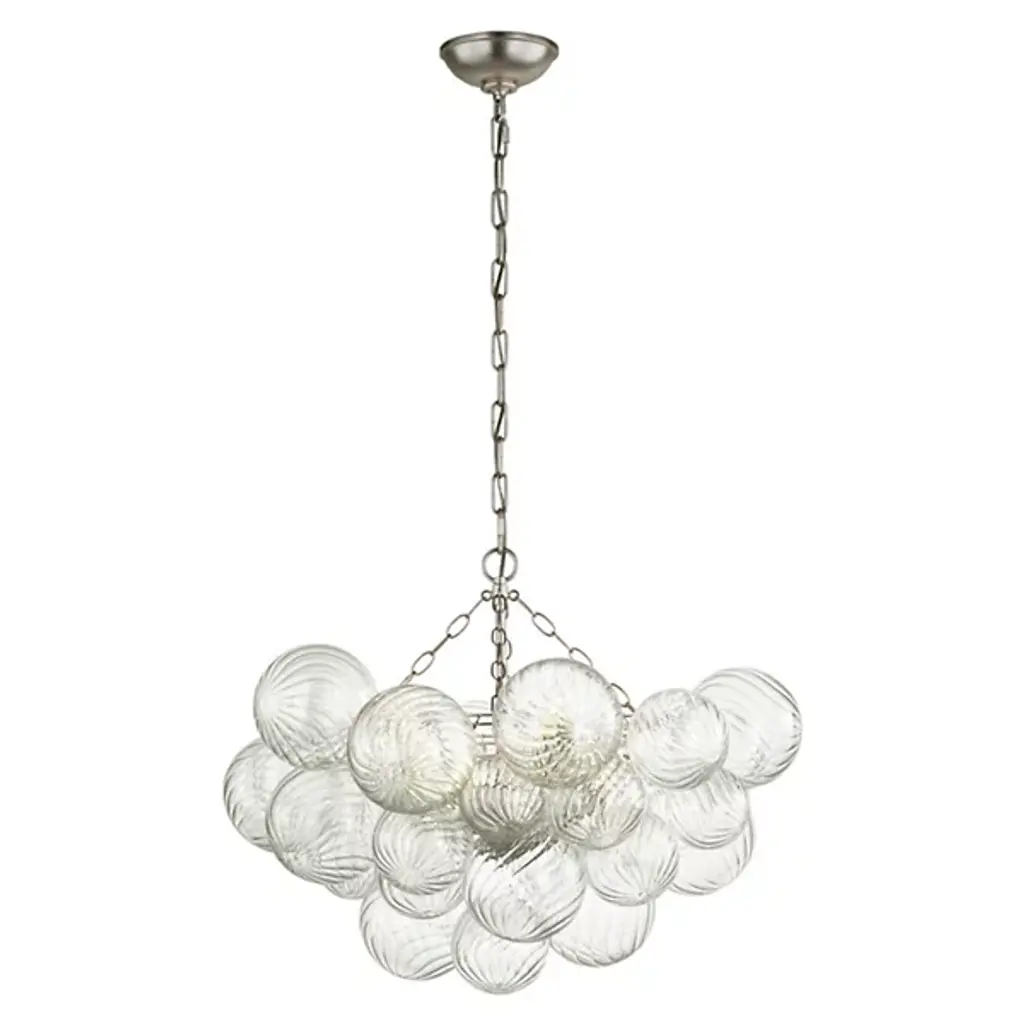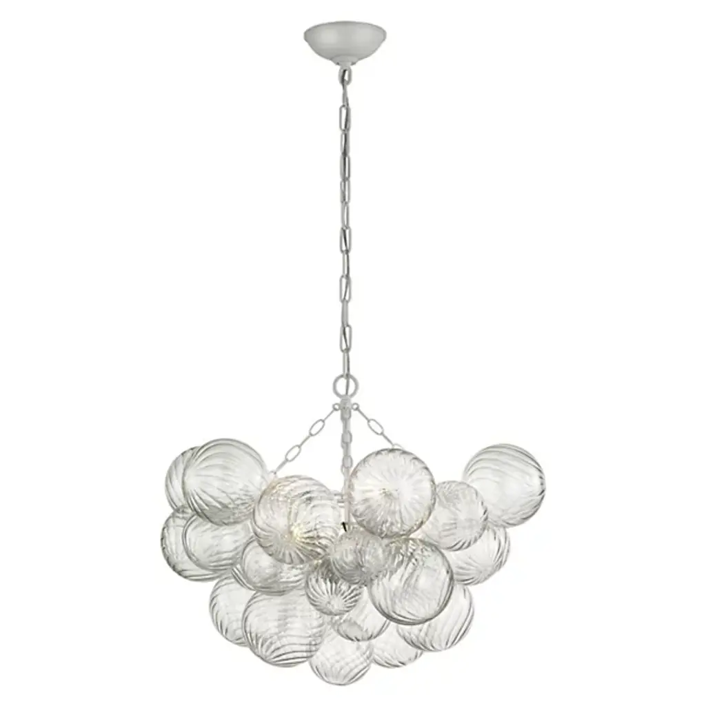 Organic shapes call to mind with the bright, lively display of the Talia Chandelier from Visual Comfort Signature. The sculptural piece underscores designer Julie Neill's love of art and bespoke craftsmanship. This focal point makes an entrance with an elegant chain-link suspension. A minimal frame rests below, holding one's lamping behind the clustered shades to minimize glare. Artisans create a swirled glass globe arrangement for a warm aura and mesmerizing display of fine highlights