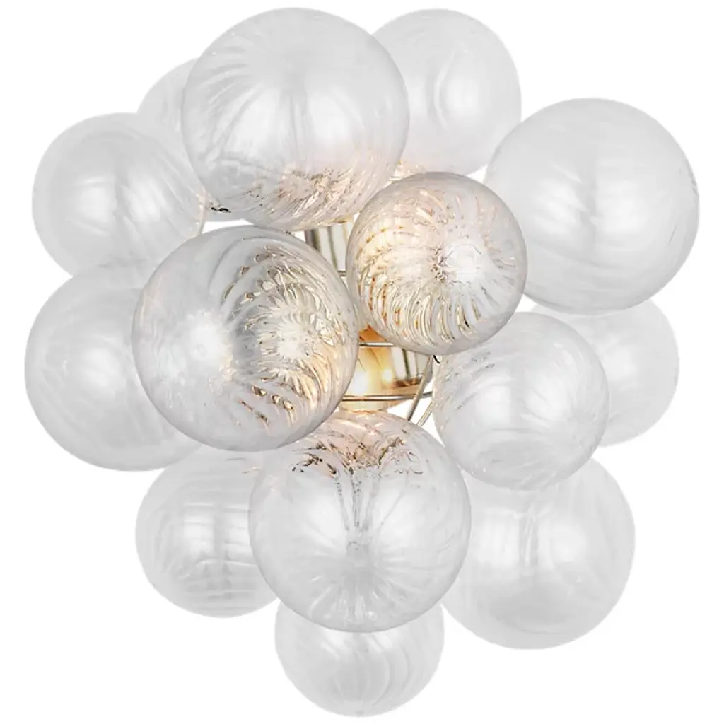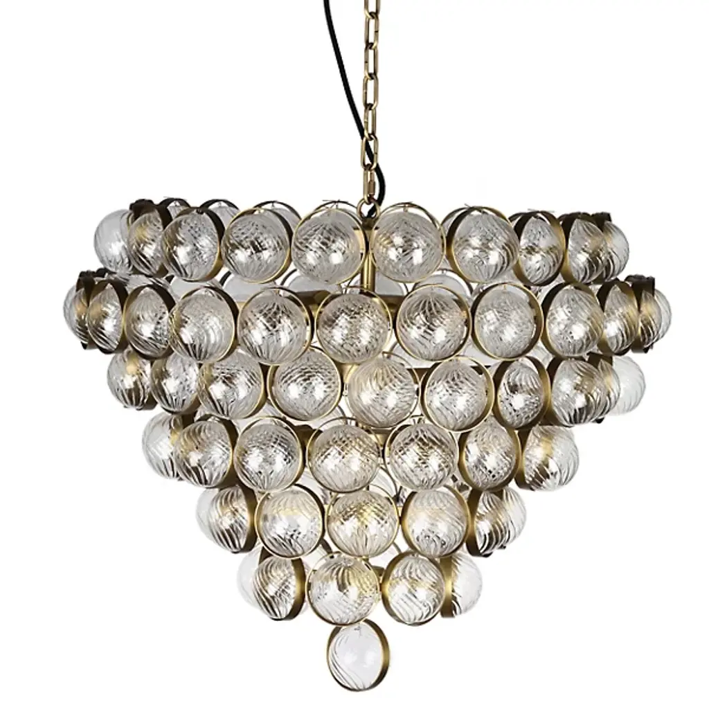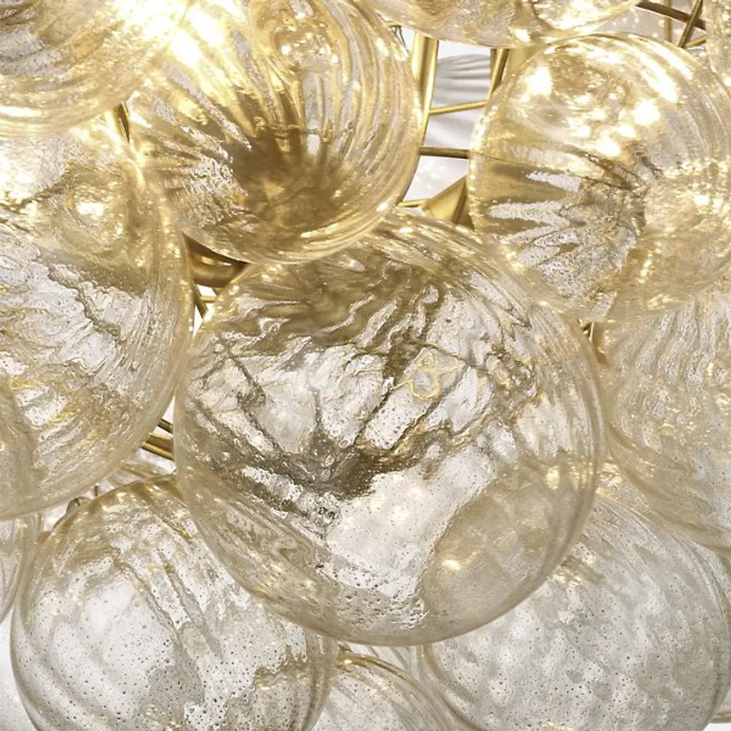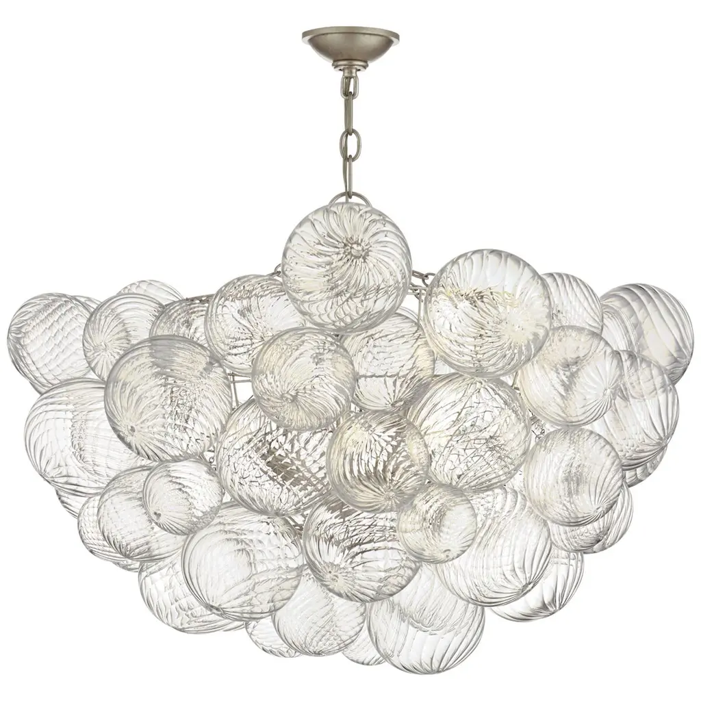 Add a stylish spectacle to inside ceilings with the Talia Large Chandelier from Visual Comfort Signature, formerly known as Visual Comfort. Retained from above by a dome-shaped steel canopy, it transmits a length of chain down to candelabra lamping surrounded by a metal dome structure supporting contoured glass orbs. The lamping blazes out from within the interspersed, differently-sized orbs, adding a sculptural appeal while obscuring direct light below, adding a twinkling spectacle to the fixture’s surroundings.