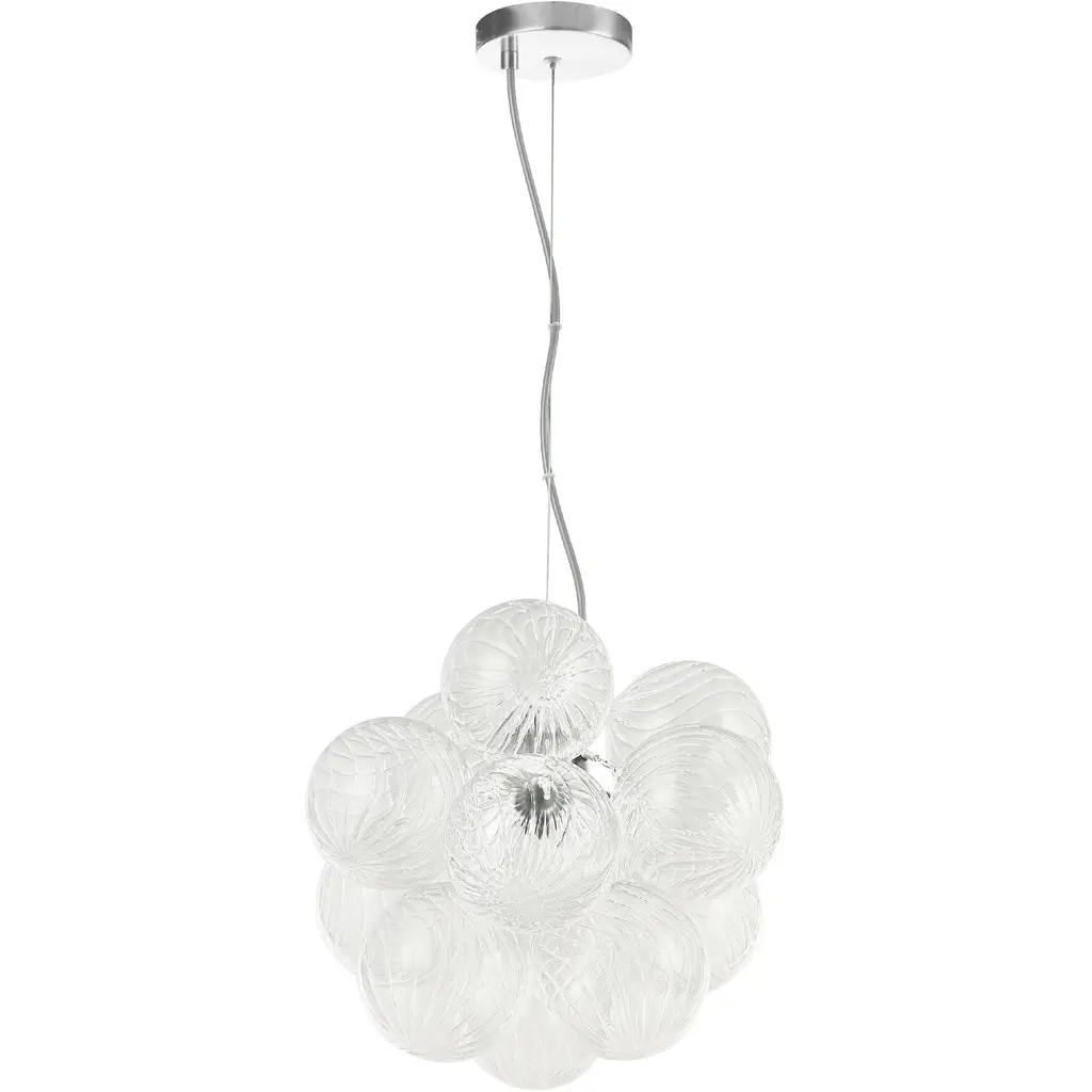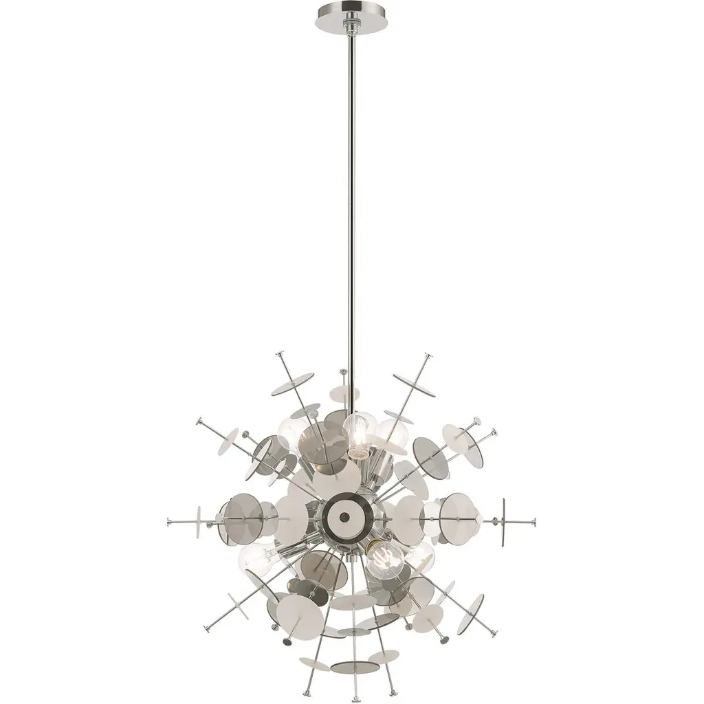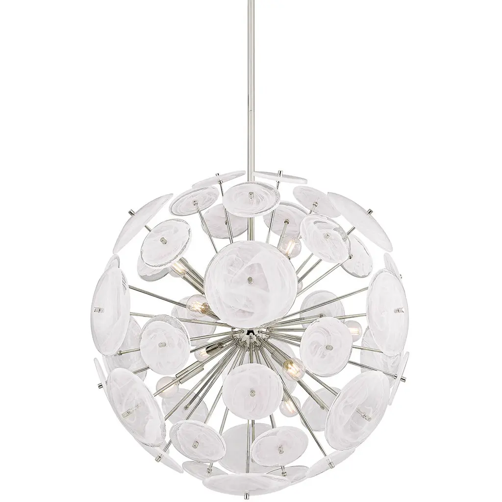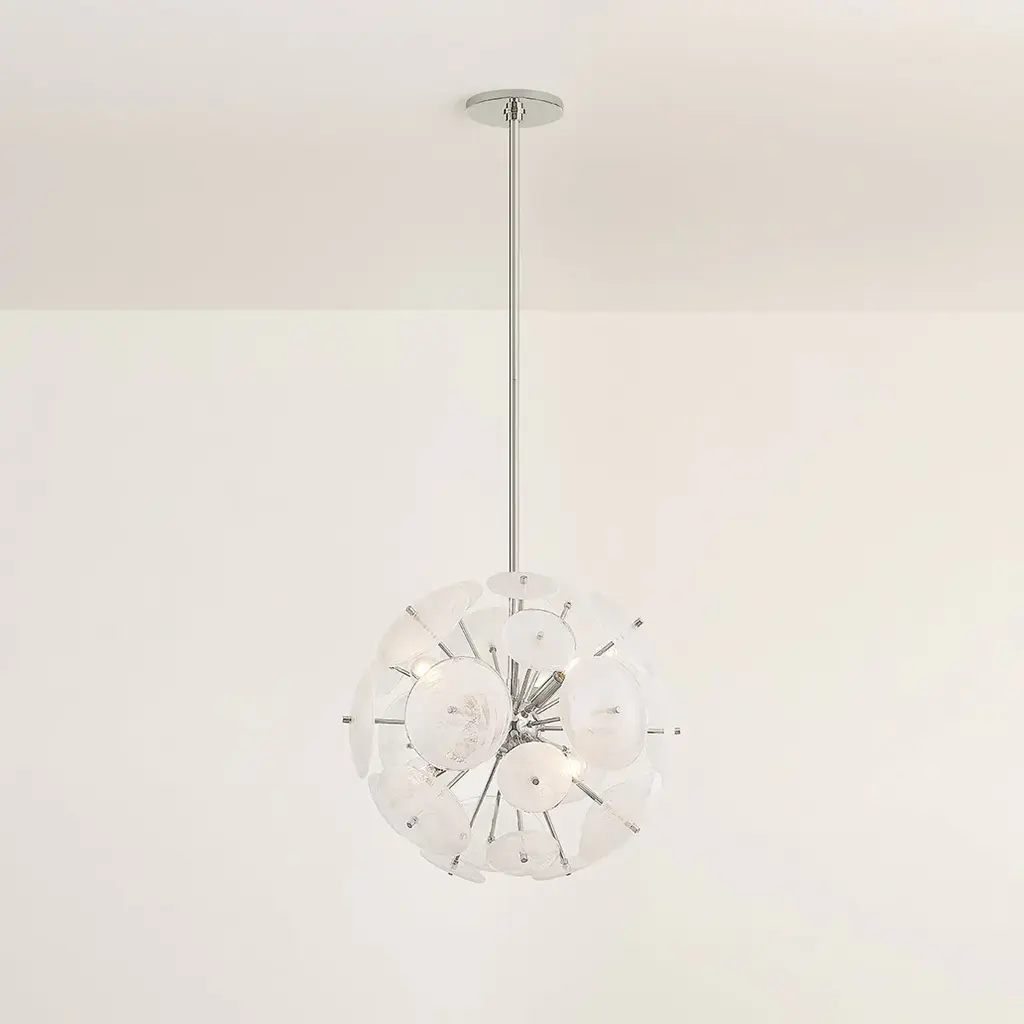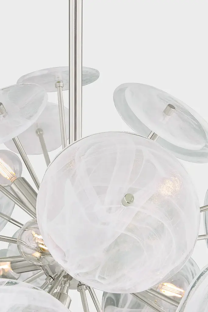 Harmonizing linear and organic shapes, the Tamara chandelier provides an artful update to a mid-century sputnik design. Cast from Remolino Blanco glass, the discs feature milky white swirls that gently diffuse light. Slender Aged Brass stems support the composition, providing a counterpoint to the softness of the rounded glass forms. Available with 6 or 9 lights, Tamara is a luminous conversation piece in a living or dining space.