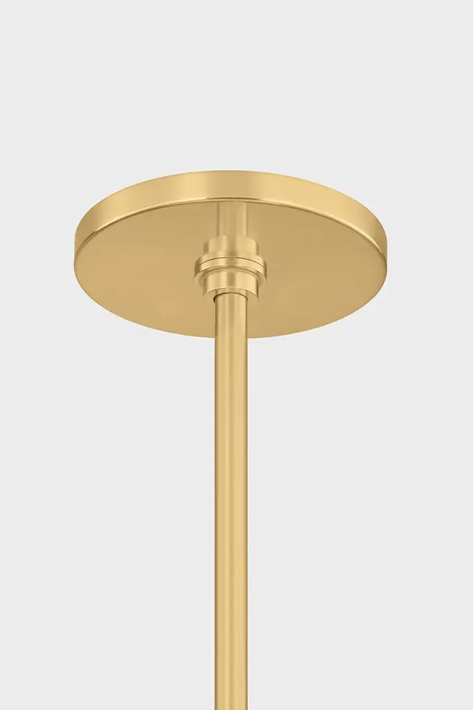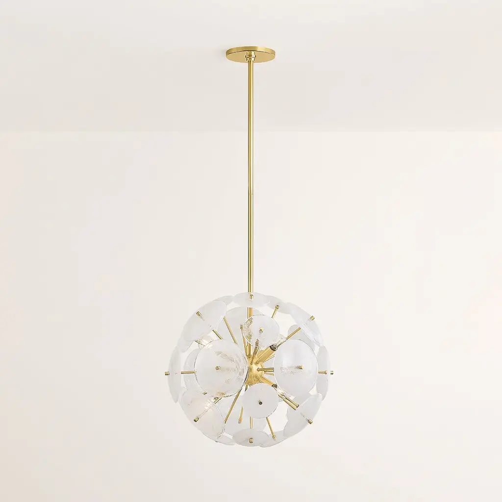 Harmonizing linear and organic shapes, the Tamara chandelier provides an artful update to a mid-century sputnik design. Cast from Remolino Blanco glass, the discs feature milky white swirls that gently diffuse light. Slender Aged Brass stems support the composition, providing a counterpoint to the softness of the rounded glass forms. Available with 6 or 9 lights, Tamara is a luminous conversation piece in a living or dining space.