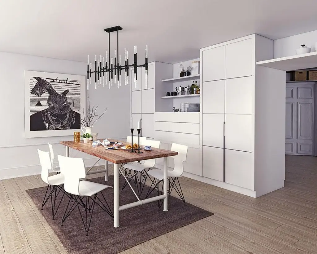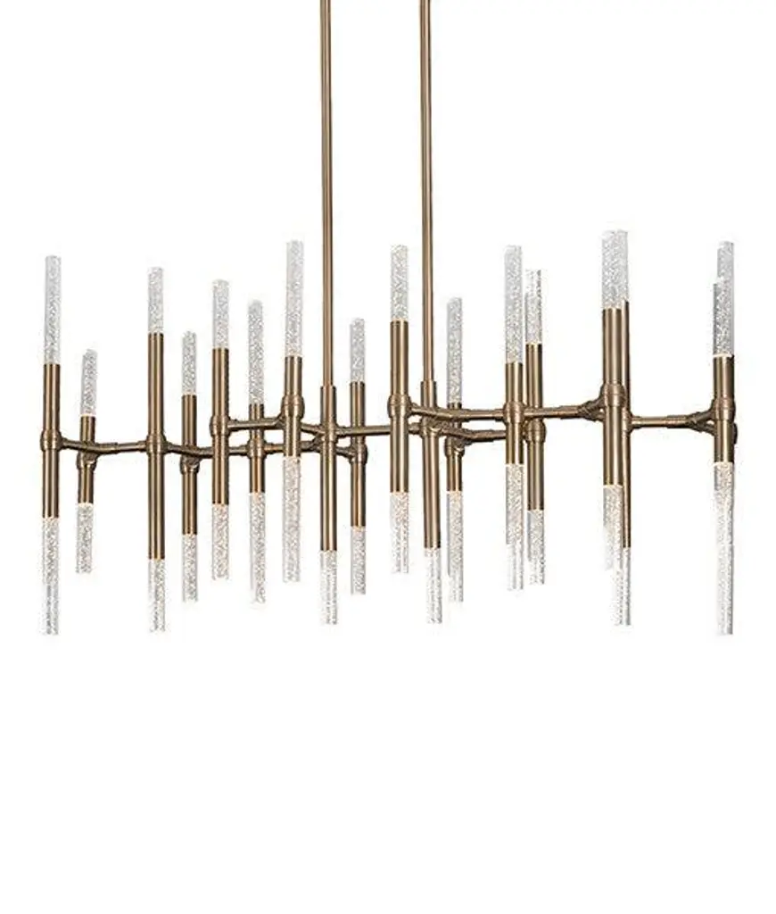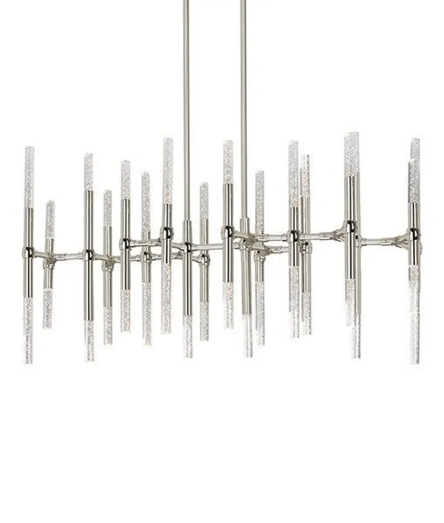 Twin-stem mounted interior pendant with obround ceiling plan. 18 parallel pipes, vertically arranged, deliver up/down illumination from its champagne-bubbled acrylic ends.18 downlights plus 16 uplights hung from the oversized canopy result in a source of light for any room that demands elegance.