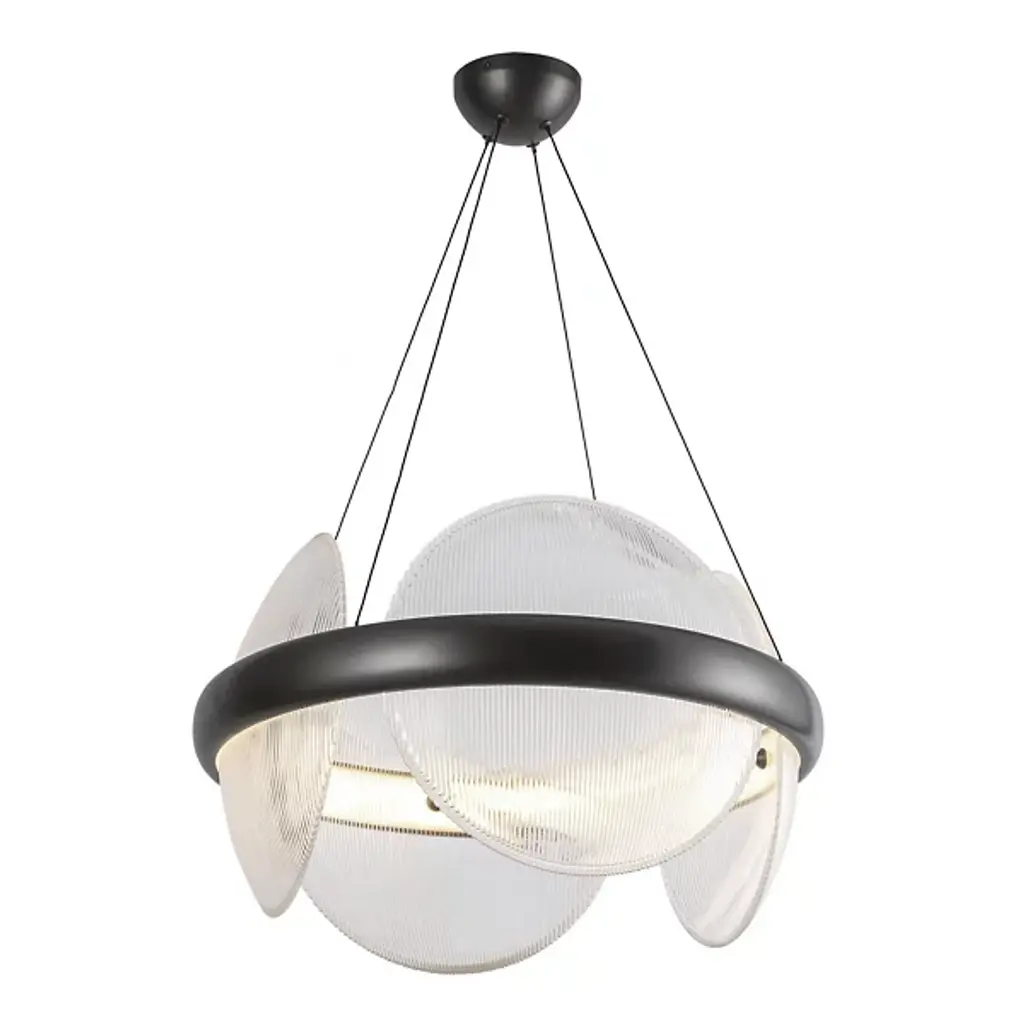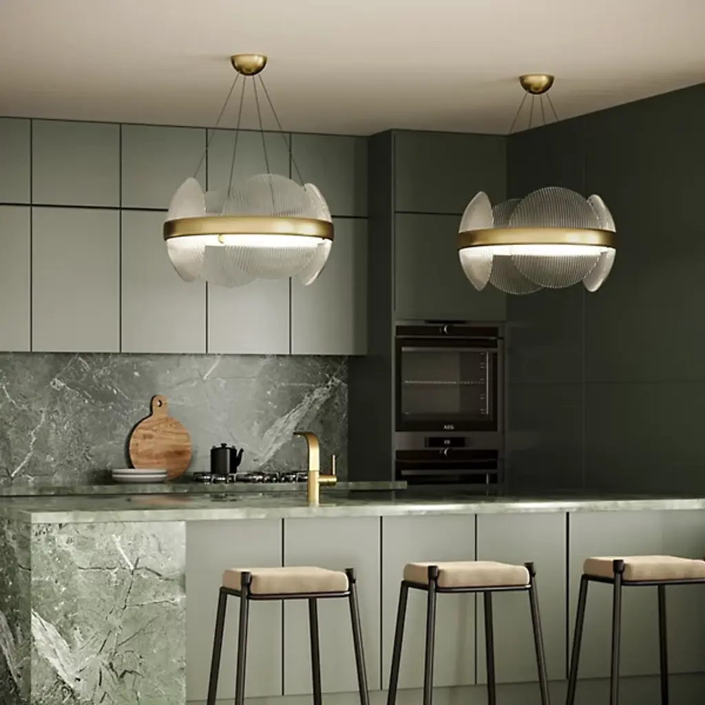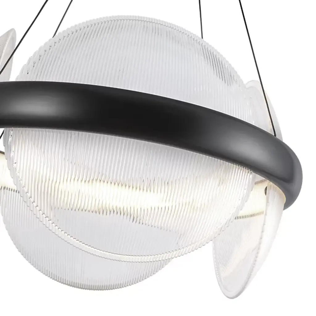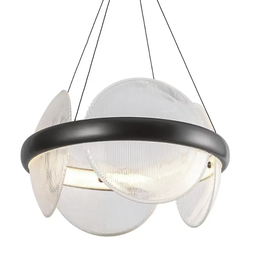 The Taurus LED Chandelier from Kuzco Lighting suspends ribbed glass pendants that scatter light in all directions throughout living spaces. Wire-hung from an aluminum base, this Kuzco Studio fixture adapts to sloped ceilings while maintaining its distinctive Art Deco influence. The clear glass elements catch and refract integrated LED illumination, creating dynamic light patterns on surrounding surfaces. This energy-efficient design eliminates bulb replacements while providing ample illumination for dining rooms, foyers, and gathering areas. The minimal metal framework emphasizes the intricate glass detailing, making this chandelier an attention-drawing element for transitional and modern interiors alike.