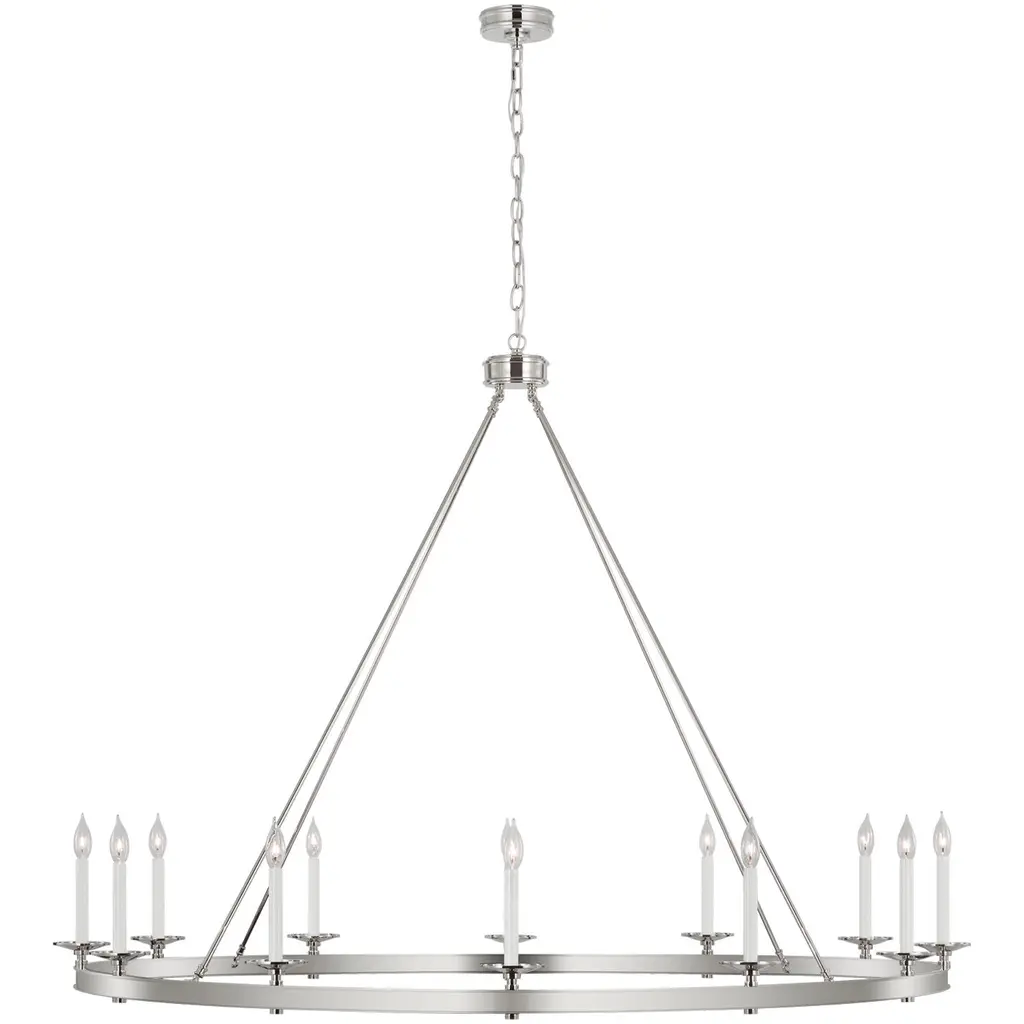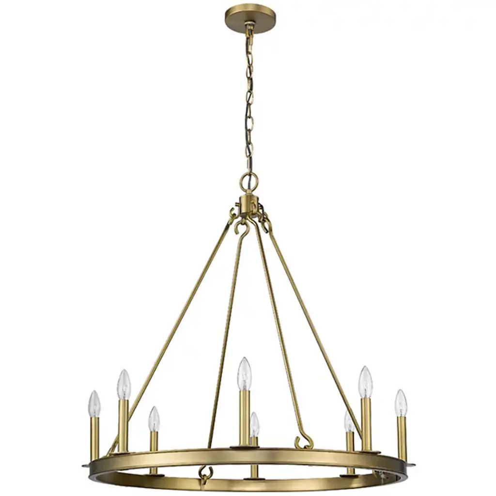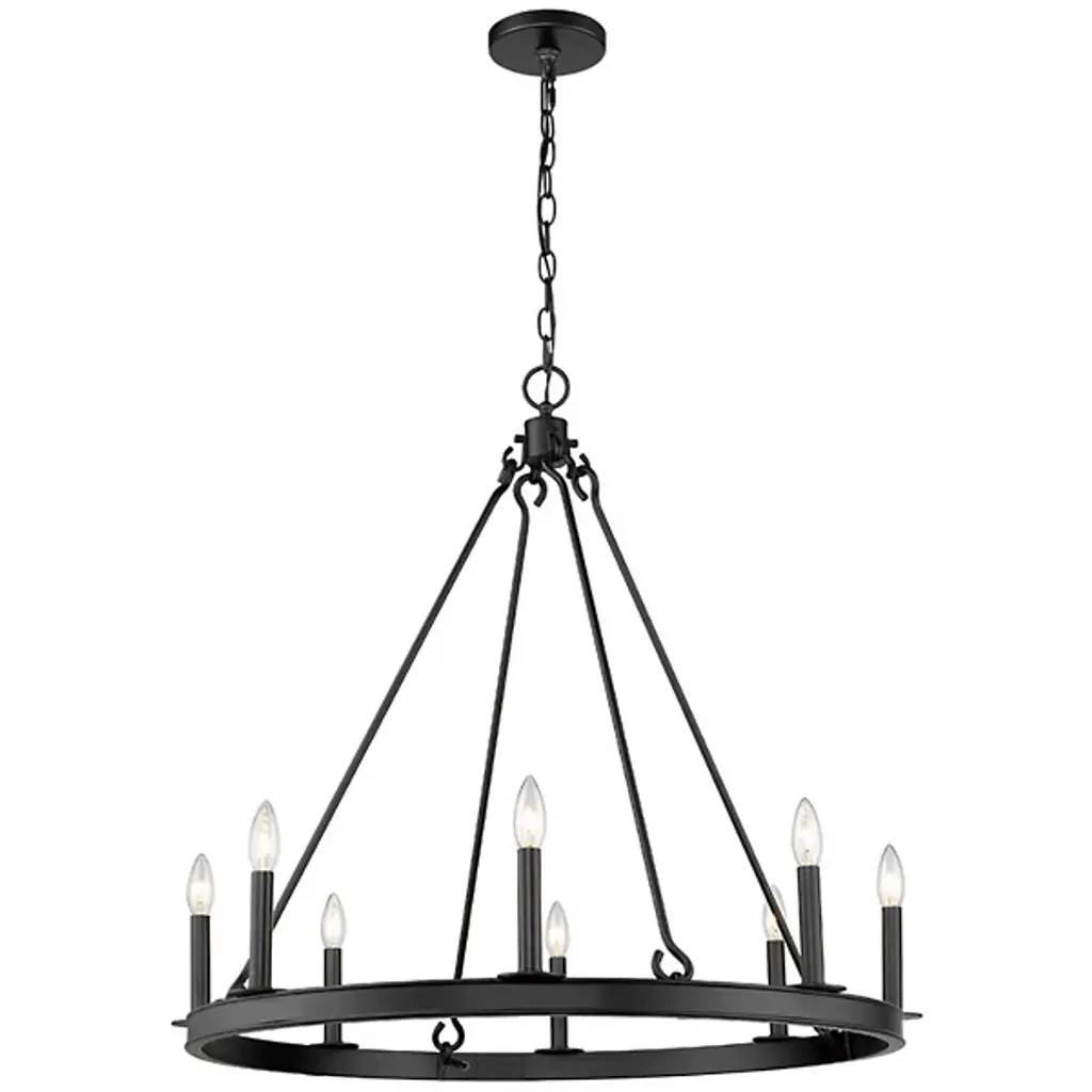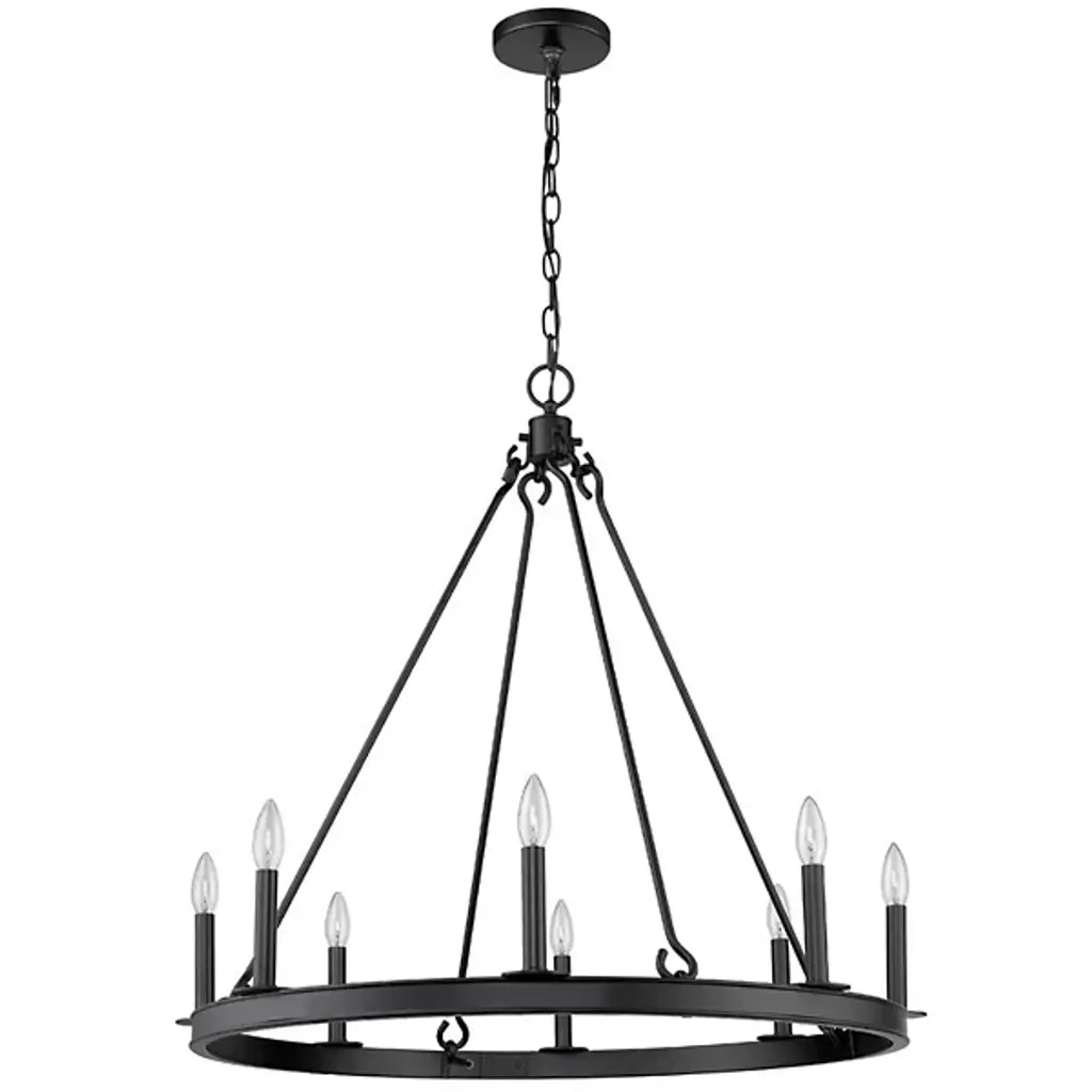 The Taylor Ring Chandelier from Alder & Ore boasts a ceiling canopy that secures a chain of links that gives way to a tapered hook, culminating in the form of a slender rod. Serving as a focal point, a ring-shaped frame of steel with cylindrical encasements house vibrant LED lights equidistantly spaced around the ring. The lovely candle-shaped lights suspended by the ring cast brilliant ambient light throughout your environment.