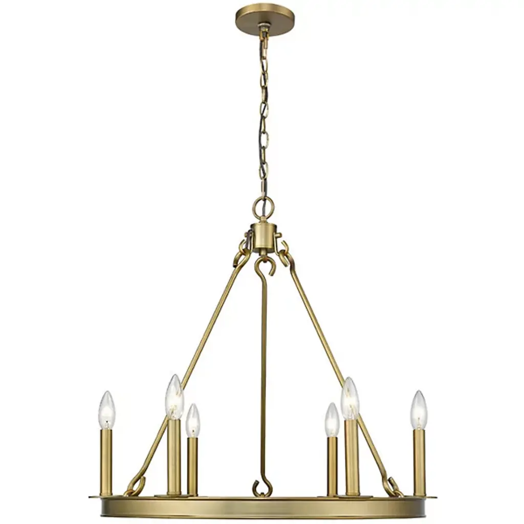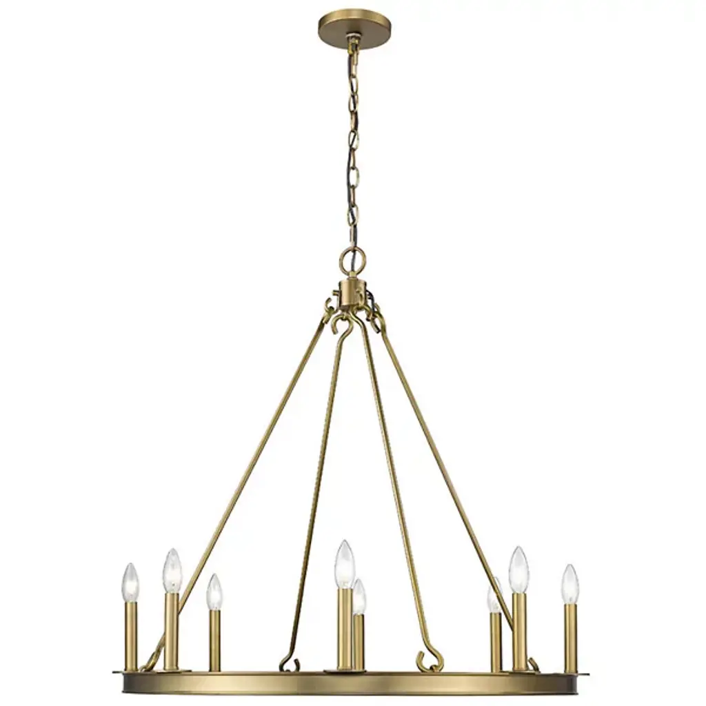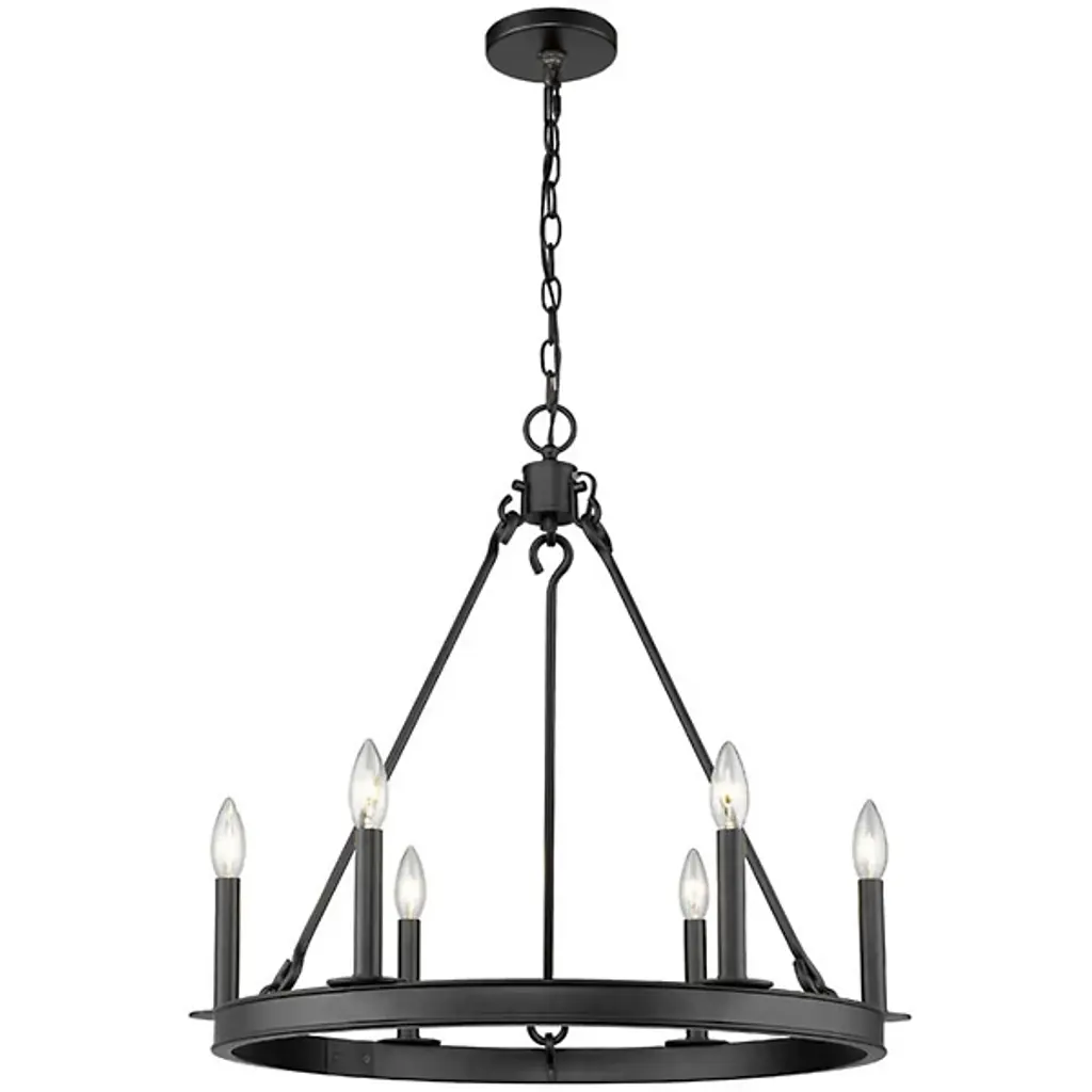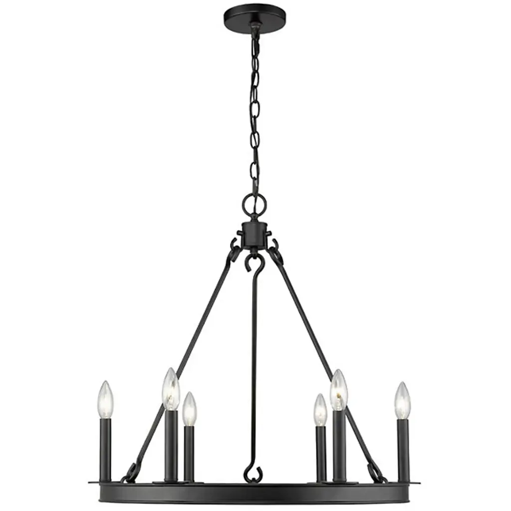 The Taylor Ring Chandelier from Alder & Ore boasts a ceiling canopy that secures a chain of links that gives way to a tapered hook, culminating in the form of a slender rod. Serving as a focal point, a ring-shaped frame of steel with cylindrical encasements house vibrant LED lights equidistantly spaced around the ring. The lovely candle-shaped lights suspended by the ring cast brilliant ambient light throughout your environment.