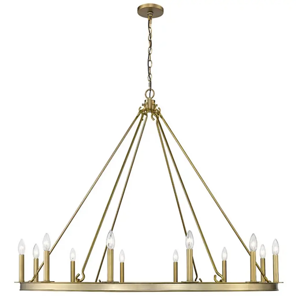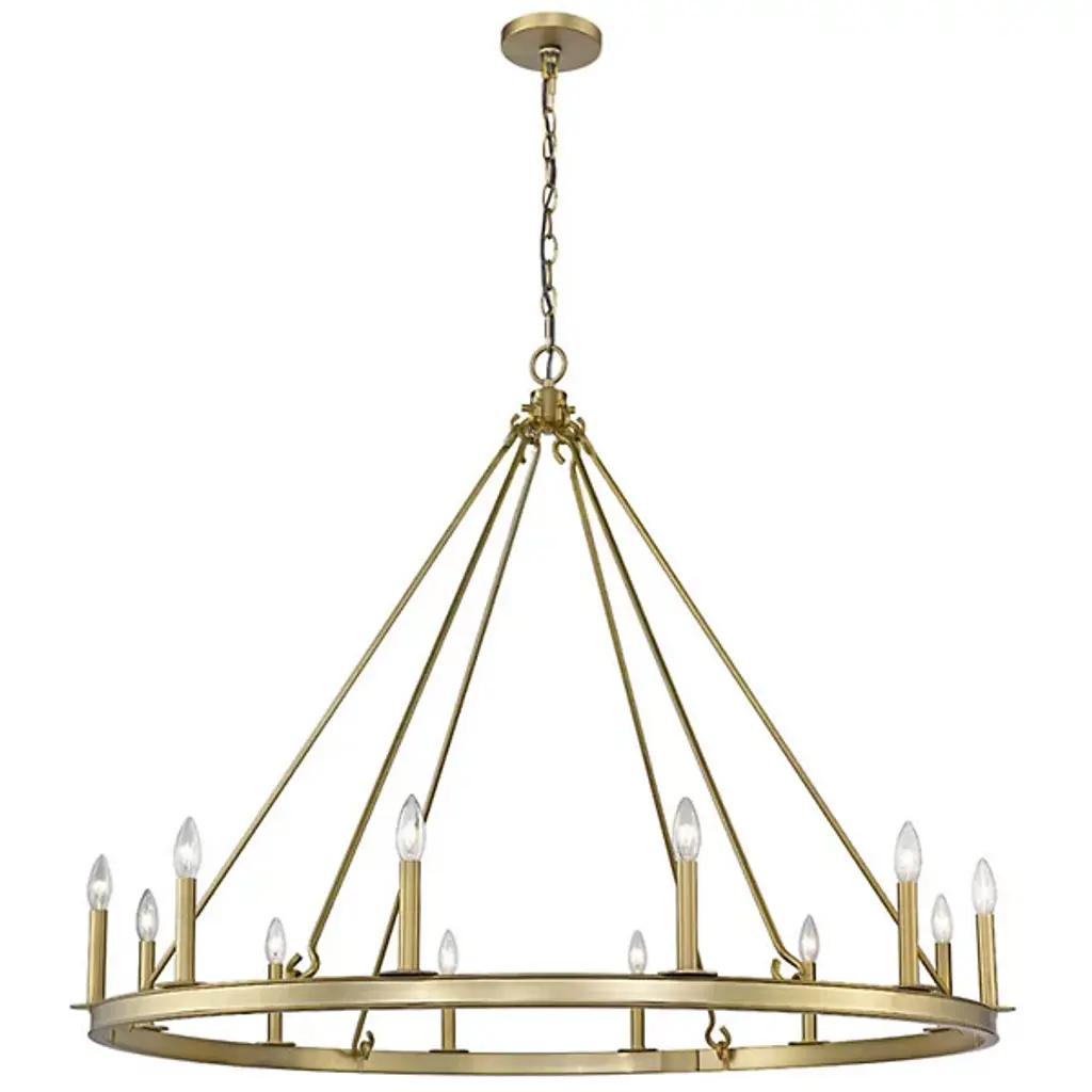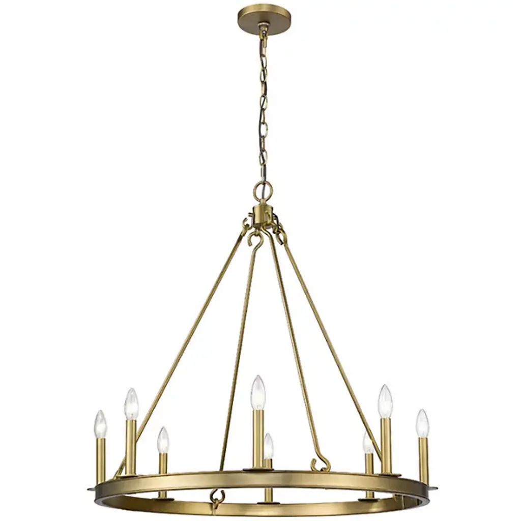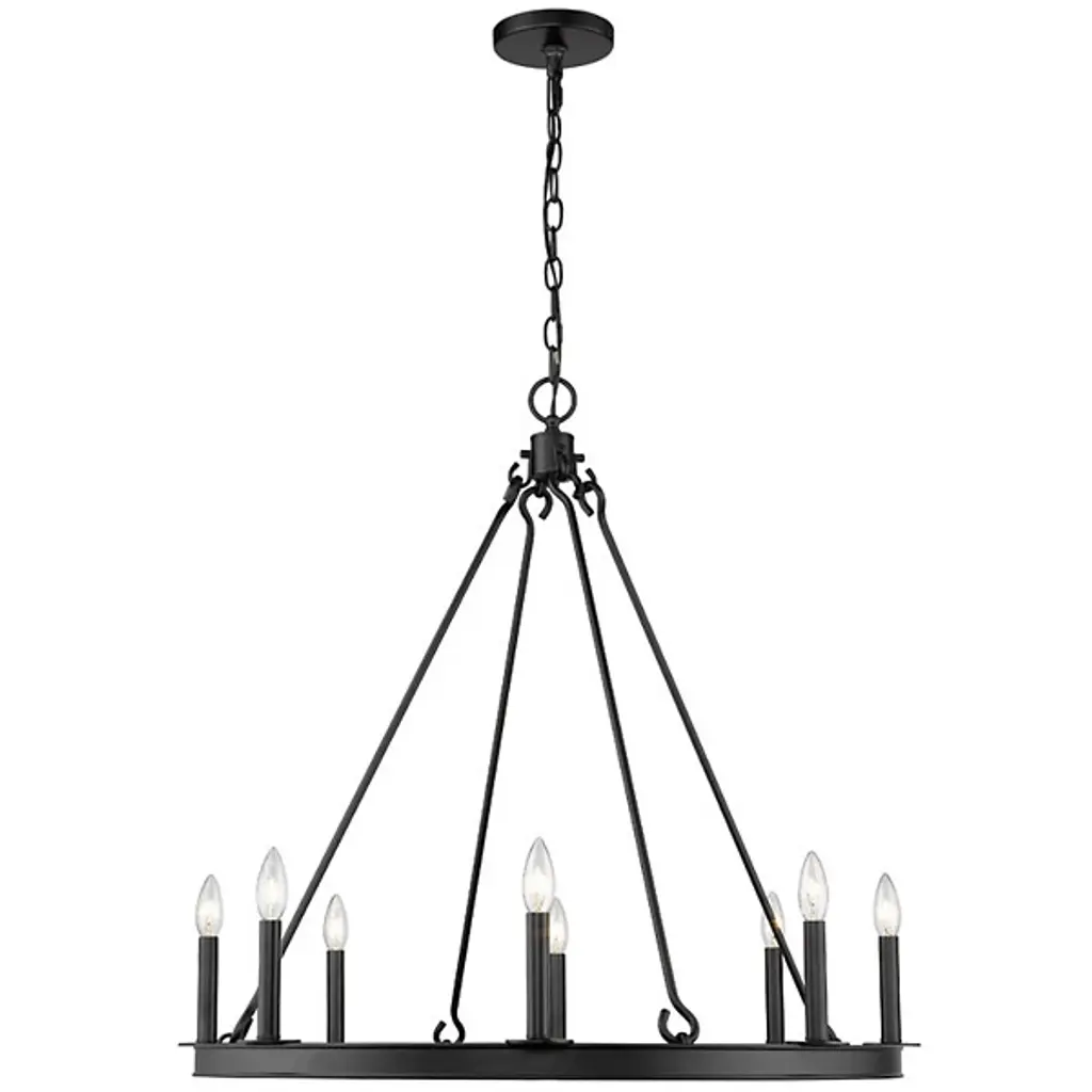 The Taylor Ring Chandelier from Alder & Ore boasts a ceiling canopy that secures a chain of links that gives way to a tapered hook, culminating in the form of a slender rod. Serving as a focal point, a ring-shaped frame of steel with cylindrical encasements house vibrant LED lights equidistantly spaced around the ring. The lovely candle-shaped lights suspended by the ring cast brilliant ambient light throughout your environment.