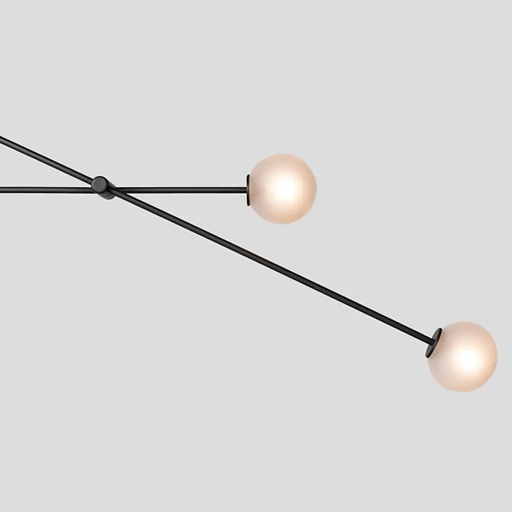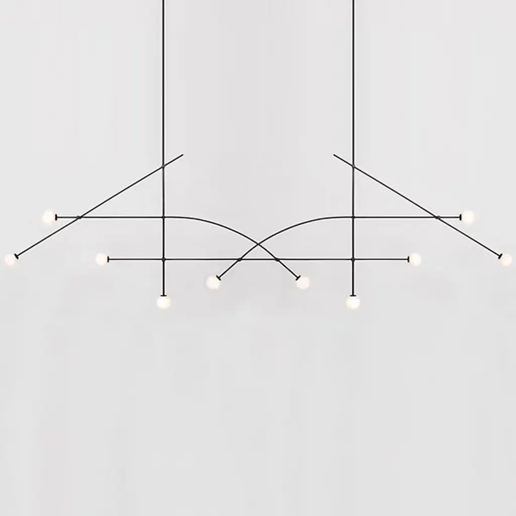 A delicate and airy statement piece for modern homes. The Tempo Chandelier 12’ from ATELIER de TROUPE has the power to transfix through its unique and expressive silhouette. Two slender rods drop from an elongated canopy above. Each rod supports a series of additional rods, creating a symmetrical structure that spans widely through straight and curved lines. At the end of each rod is a handblown glass orb containing an integrated LED light, emitting a warm, ambient illumination.