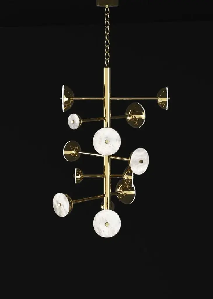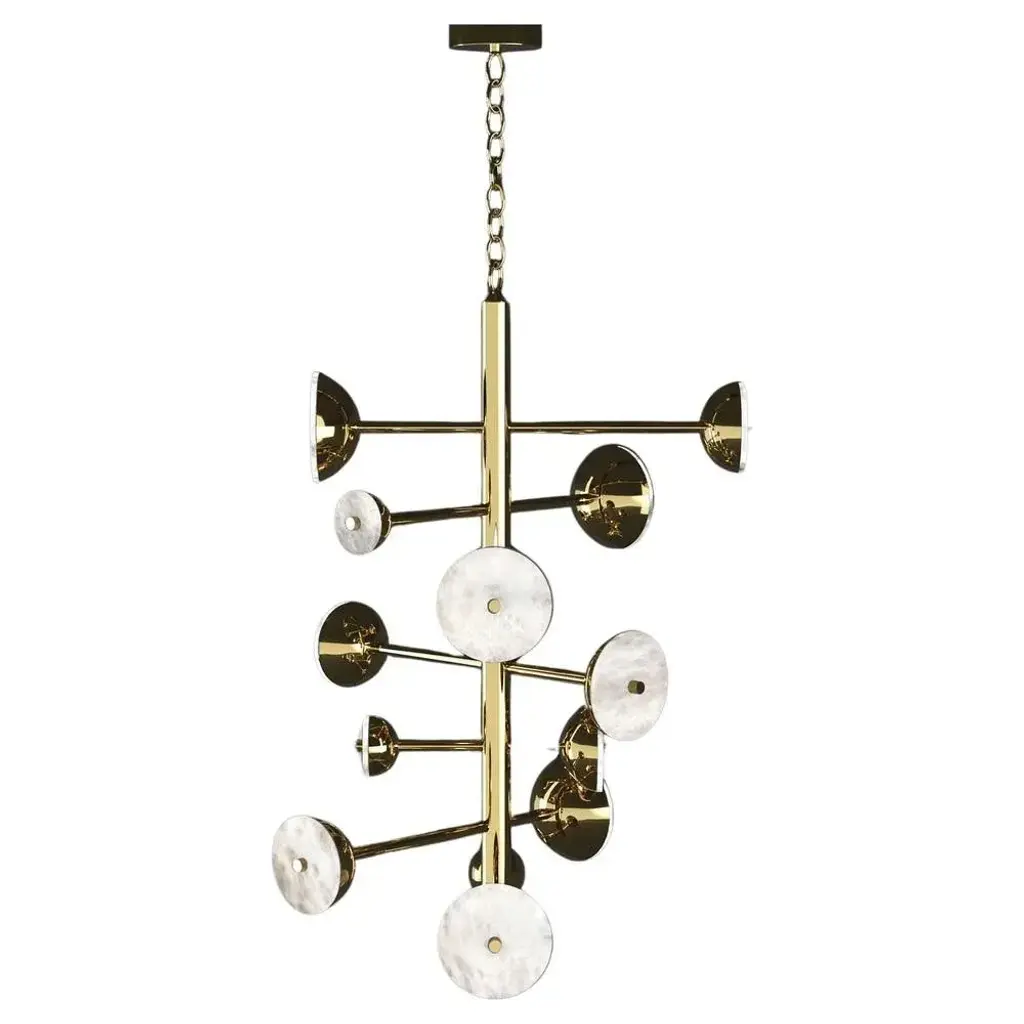 Teti shiny gold metal chandelier by alabastro italiano dimensions: d 74,5 x w 77,5 x h 110 cm. Materials: white alabaster and metal. Available in different finishes: shiny silver, bronze, brushed brass, ruggine of florence, brushed burnished, shiny gold, brushed black, freedom green, shiny black and copper. Please contact us. All our lamps can be wired according to each country. If sold to the usa it will be wired for the usa for instance. Teti was among the most beautiful nymphs in greek mythology, goddess of the sea and mother of 3,000 children, personifying the world’s rivers, springs and fountains. These series of parallel and perpendicular tubular arms represent the linearity and slow progress of river waters. After years of experience in the family business, which specializes in design and lighting, riccardo and alberto ongarato found the brand alabastro italiano. Each project is conceived and designed to give a strong sign of recognizability and uniqueness. The use of precious materials such as alabaster, brass, leather and blown glass, worked by the skilful hands of our craftsmen, are combined to create “timeless” objects. From the depths of the earth to the light of the sun. Alabastro italiano care about these extremes and transcends them in a creative dynamic that emphasizes simplicity and clean-cut lines. The company has created an entirely new project made in italy, revolutionizing the previously existing collections into eternal and evergreen lighting elements. By designing clean-cut and original lines, built-in with the latest technology and continuously innovating, alabastro italiano has never lost sight of its goal: perfection. The result of this work is an extraordinary collection of alabaster lightings. Alabaster needs human hands to come to life. The charm of these stone objects comes from their uniqueness, from the fact that they come from the hand of those who has left a mark and a memory with their work, each grain makes each piece unique. Alabaster needs human hands to come to life. The charm of these stone objects comes from their uniqueness, from the fact that they come from the hand of those who has left a mark and a memory with their work, each grain makes each piece unique. Alabaster is a material that leaves little traces of magic all around it. It is difficult to identify the exact point where the material ends and its reflection begins. It is impossible to understand how far the light sinks in its soft transparency. It changes according to the positions in which it is placed, depending on the point of view. Alabaster is a compact and rare stone that lays down very precise laws requires a familiarity that only italian craftsmen possess. Alabastro italiano collaborates with each client to create a unique project. Starting from the advice for better architectural lighting, it brings its know-how, materials, design and creative inspiration to interior architects and interior designers. up to 250v (europe/uk standard).