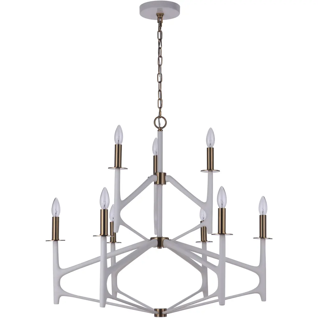 Symmetrical arches in a rich flat black or matte white finish accented with warm satin brass details create The Reserve collection that delivers impressive style . This stately collection includes a single tiered four, six and ten light chandelier, two-tiered nine light chandelier, two light wall sconce and ten light island fixture. The Reserve is damp rated for indoor or covered outdoor use.