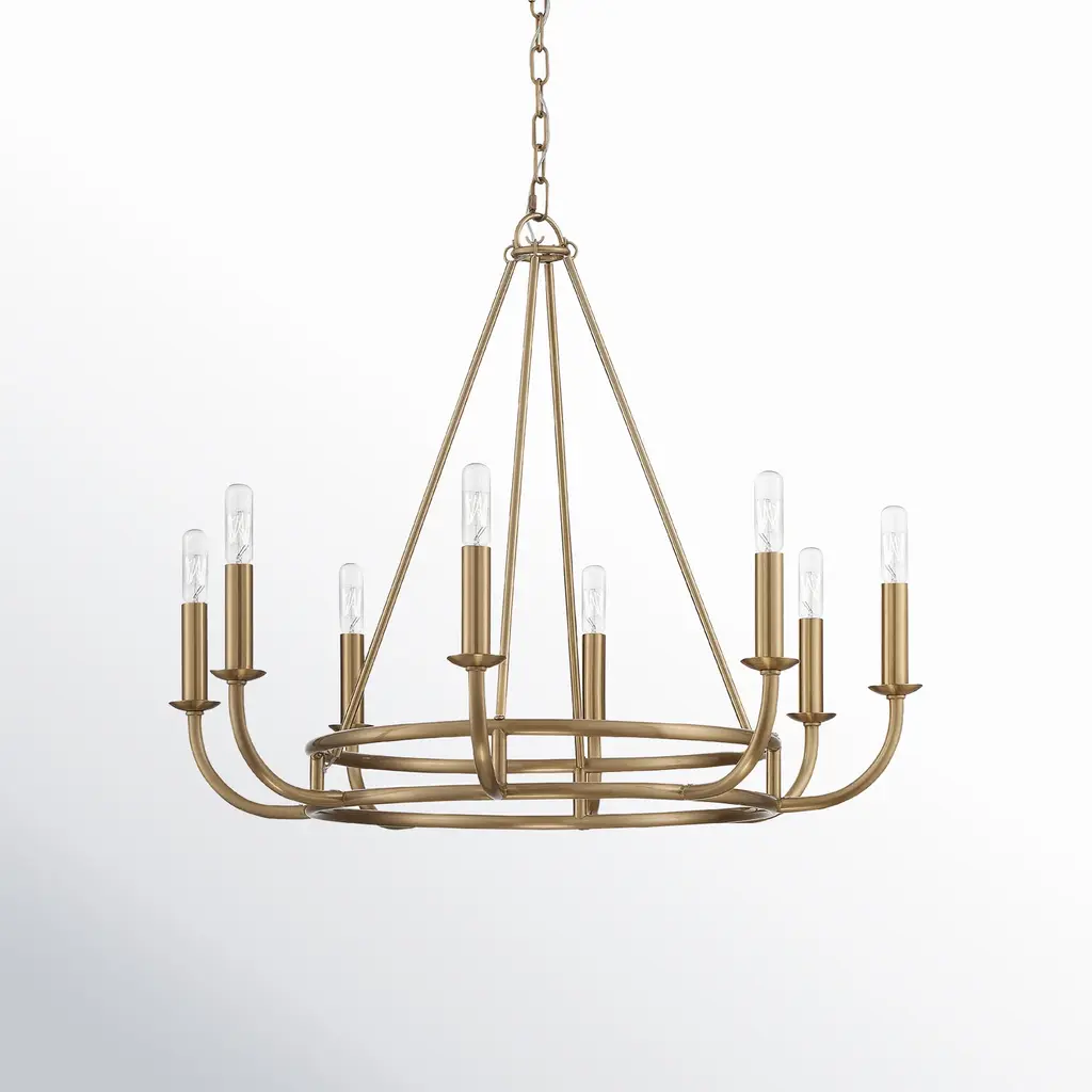 Symmetrical arches in a rich flat black or matte white finish accented with warm satin brass details create The Reserve collection that delivers impressive style . This stately collection includes a single tiered four, six and ten light chandelier, two-tiered nine light chandelier, two light wall sconce and ten light island fixture. The Reserve is damp rated for indoor or covered outdoor use.