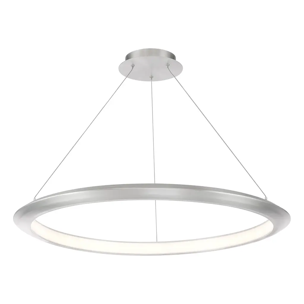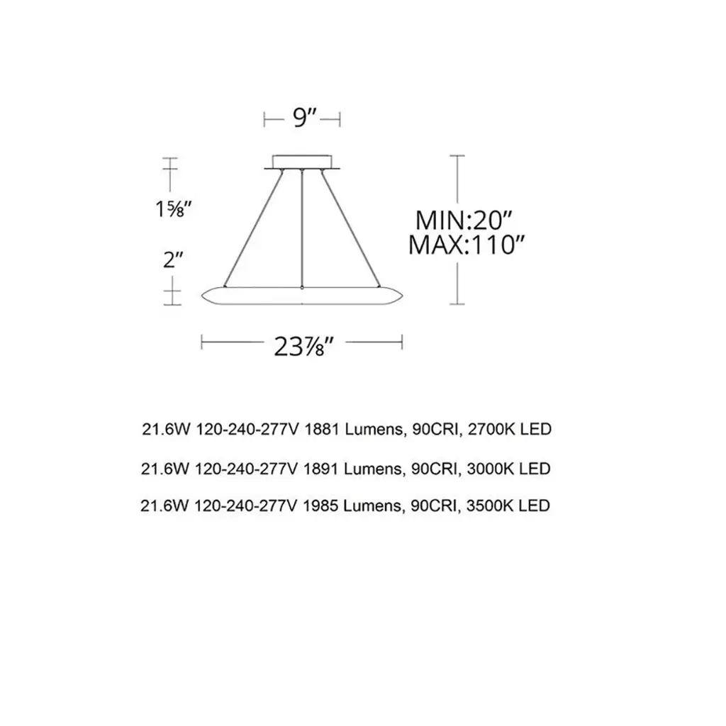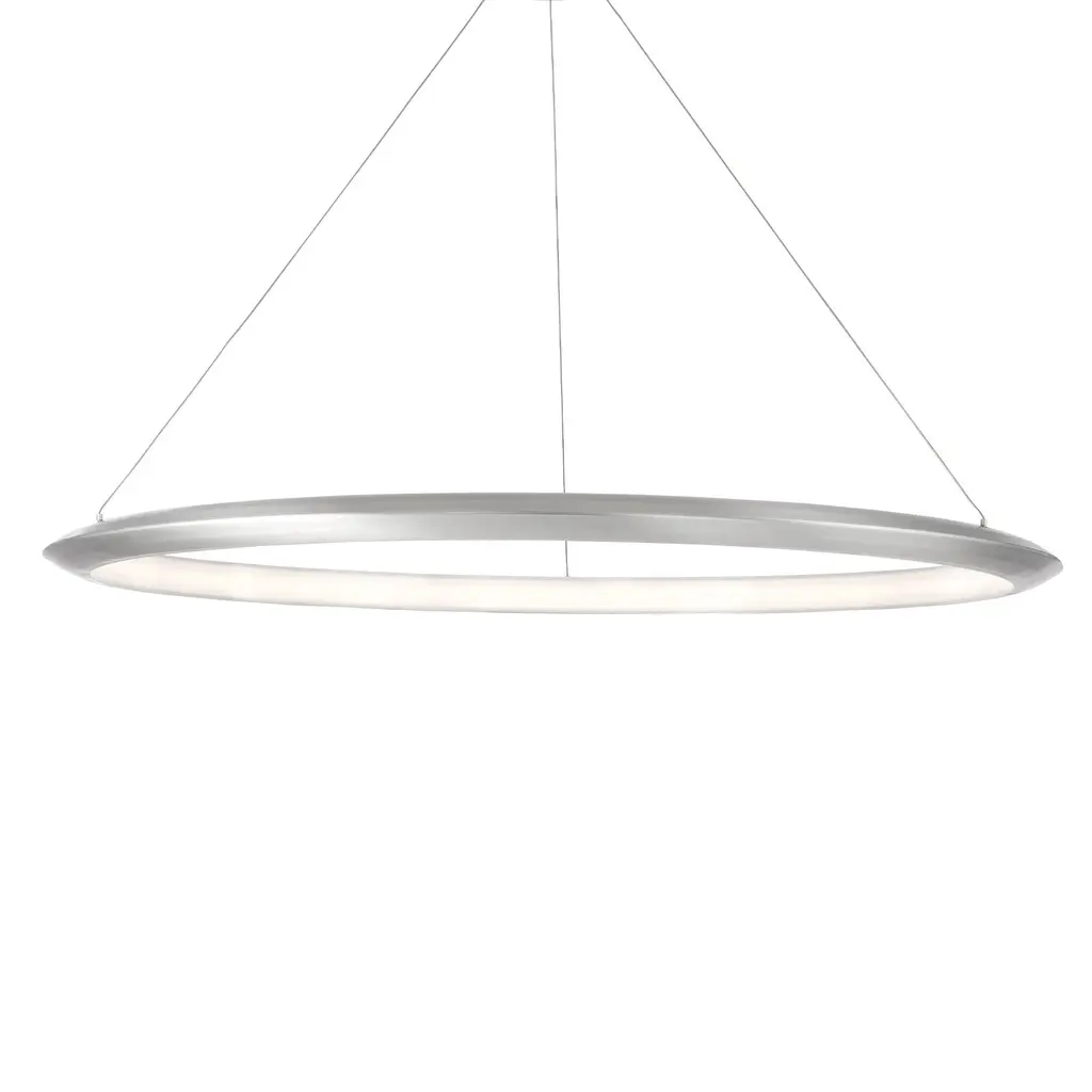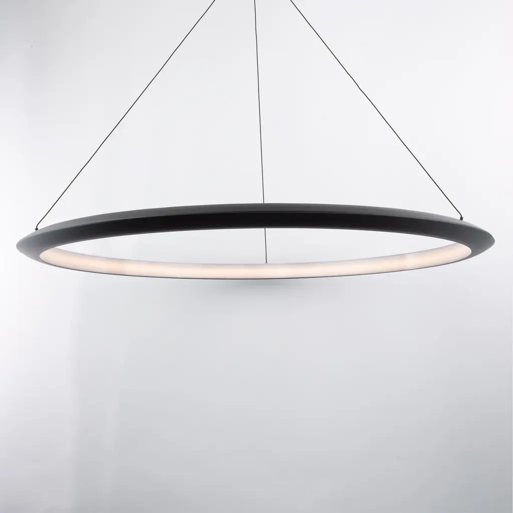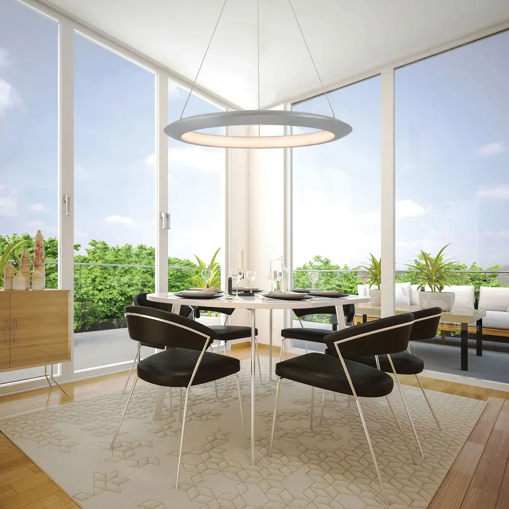 Simple yet refined. An elevated ring suspended above by its ultra-thin powered cables. Brushed aluminum or black finishes accentuate the tailored profile and seamless construction. Available in three CCT options with a 2700K-3000K-3500K CCT selectable switch located in the canopy. Features