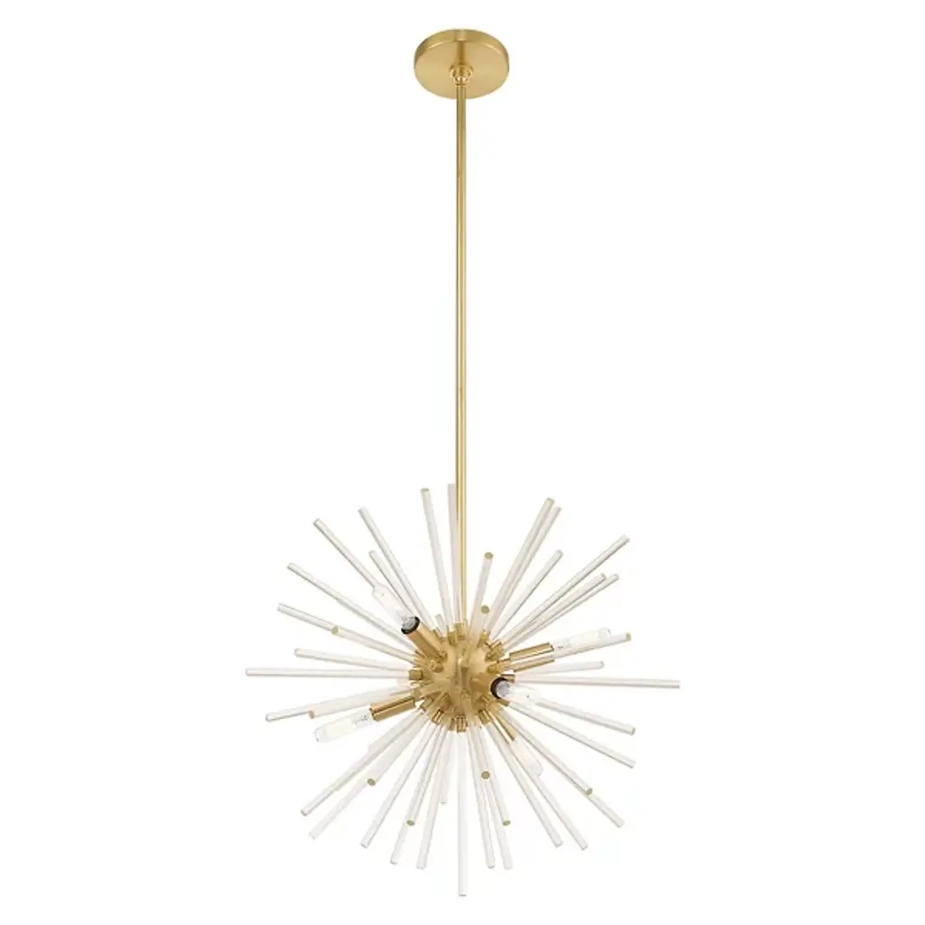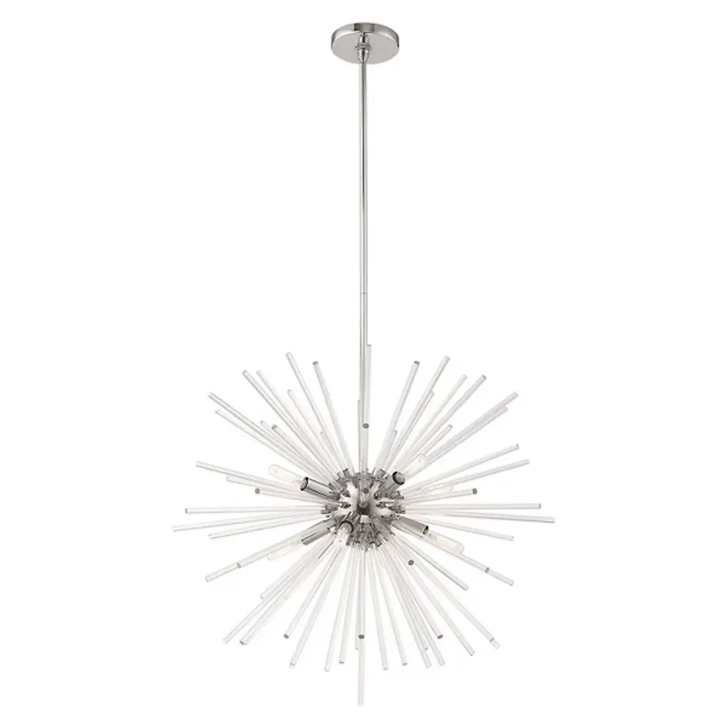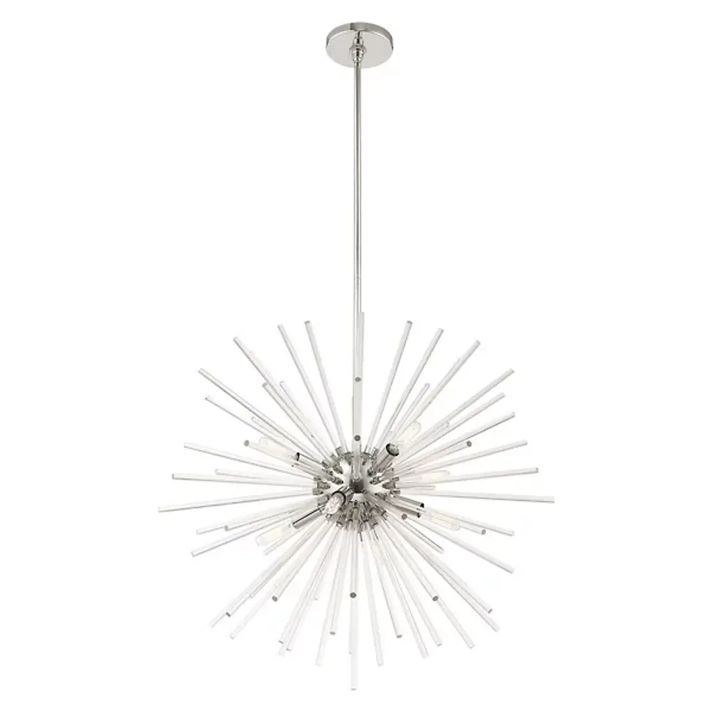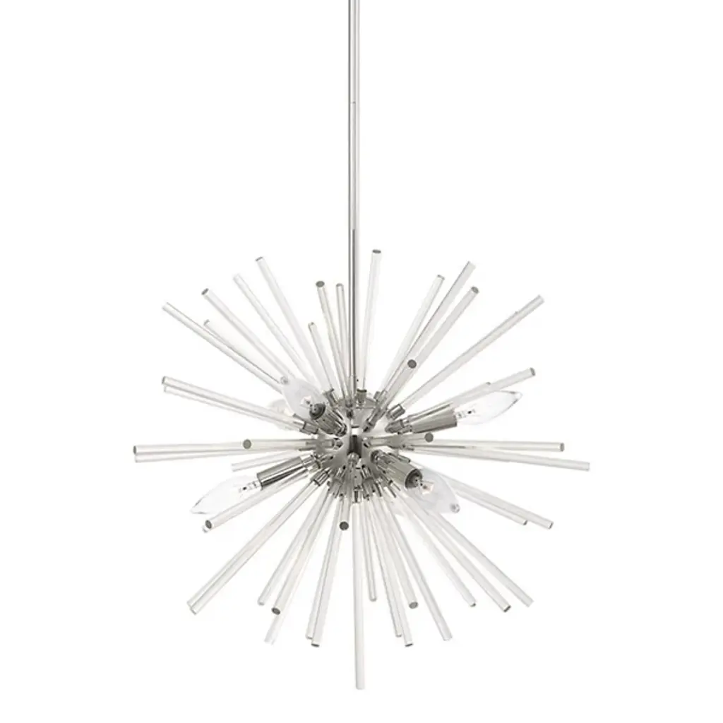 Expand your inside ceilings with the Theodore Chandelier from Alder & Ore, a contemporary arrangement with a splash of Sputnik style. A sleek circular canopy keeps everything in place and sends a central stem sweeping down to a spherical hub below. This hub anchors the fixture’s damp-listed lamping that extends evenly in all directions, blazing brightly and accompanied by an array of clear crystal rods that glitter elegantly with a reflected ambiance.