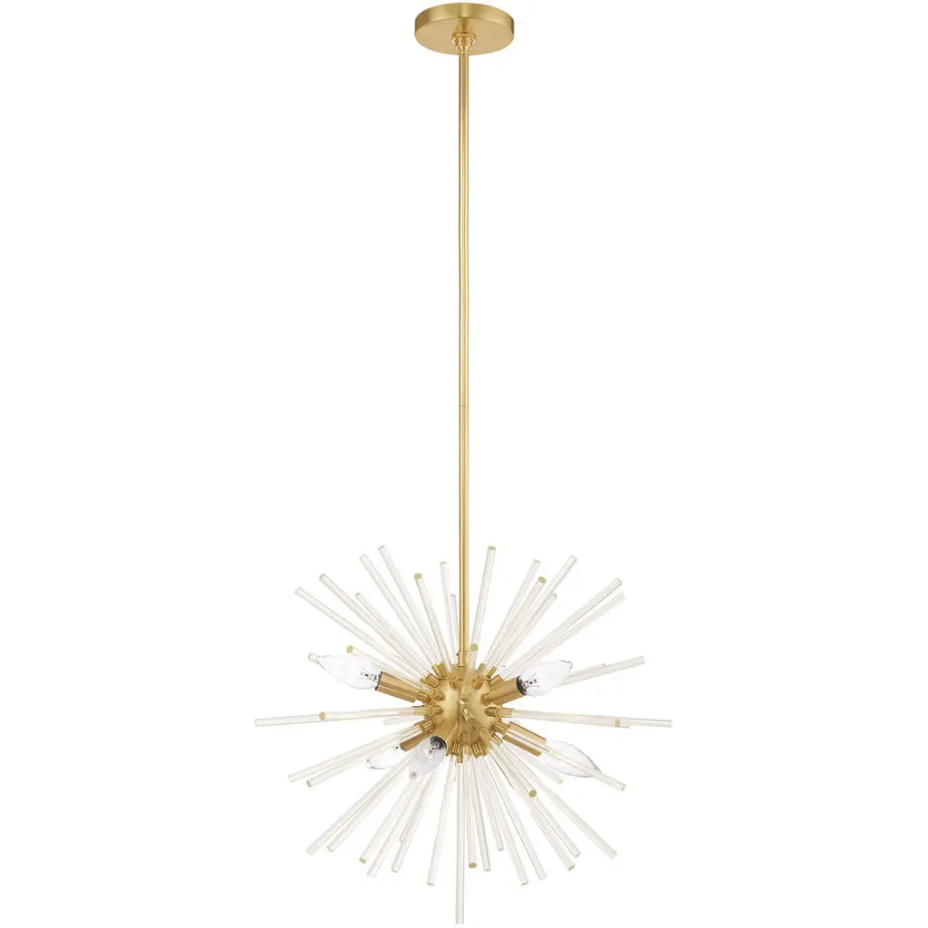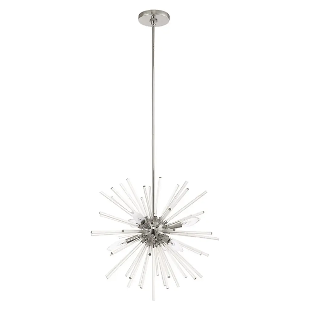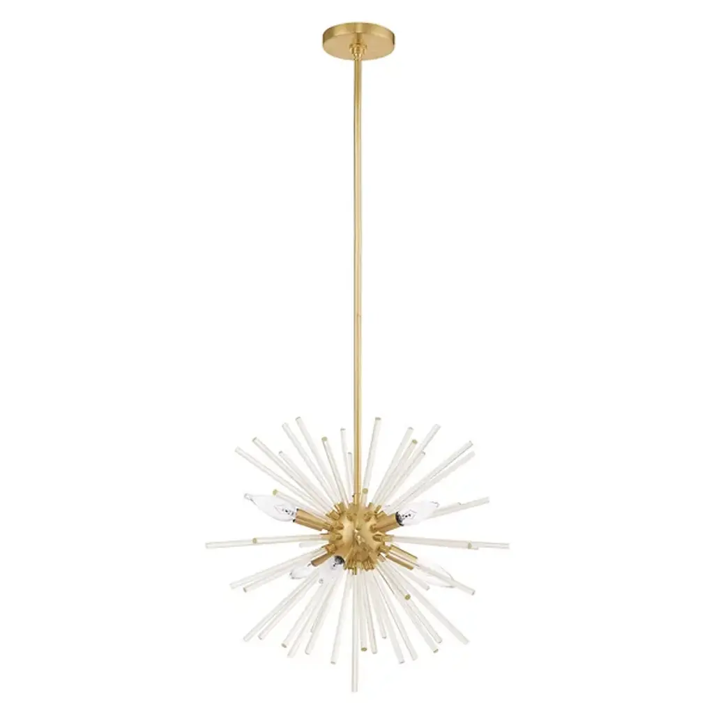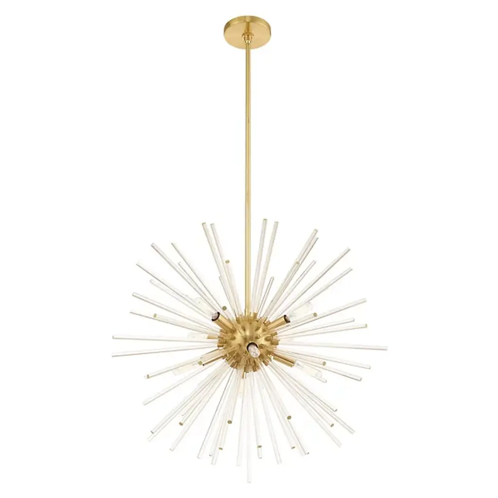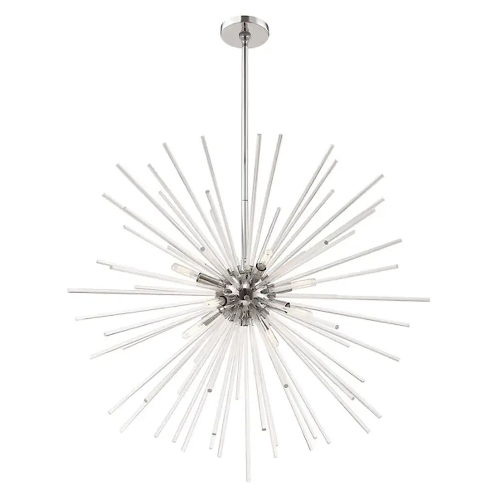 Expand your inside ceilings with the Theodore Chandelier from Alder & Ore, a contemporary arrangement with a splash of Sputnik style. A sleek circular canopy keeps everything in place and sends a central stem sweeping down to a spherical hub below. This hub anchors the fixture’s damp-listed lamping that extends evenly in all directions, blazing brightly and accompanied by an array of clear crystal rods that glitter elegantly with a reflected ambiance.