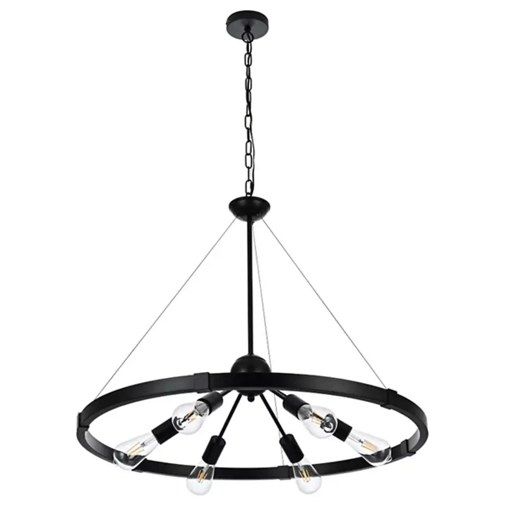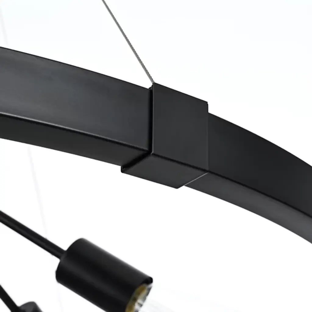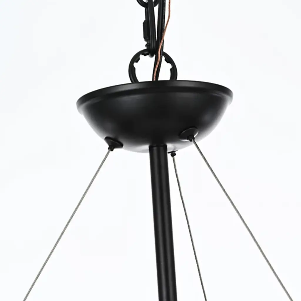 The Thera Chandelier from Huxe captures Mid-Century Modern and Transitional styles with its retro Sputnik-style design. A unique and memorable design suspended from a circle canopy by chain and then a rod, it sends wires down to a ring accent around open lamping. The durable iron construction ensures lasting quality and adds to its rugged industrial appeal to its otherwise retro aesthetic. At the same time, the fixture is also ETL-certified for safety, making it both stylish and reliable for high-ceilinged interiors.