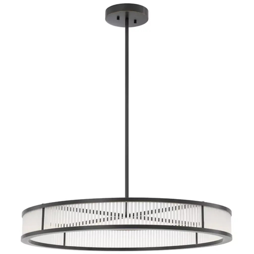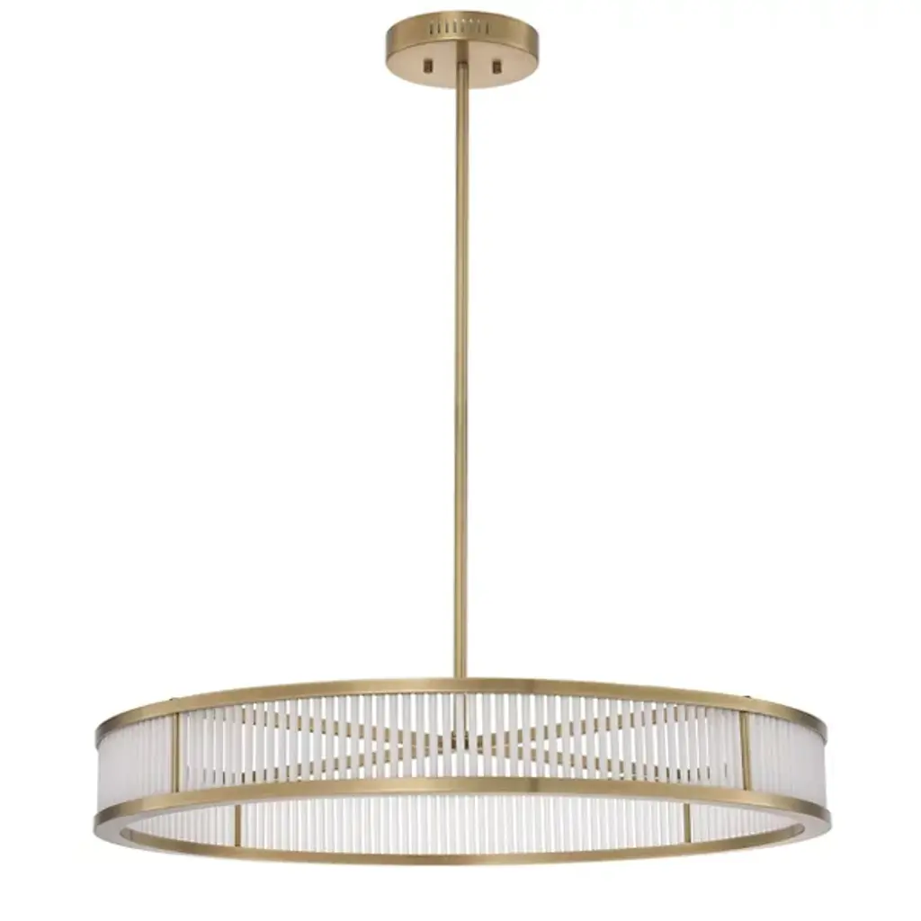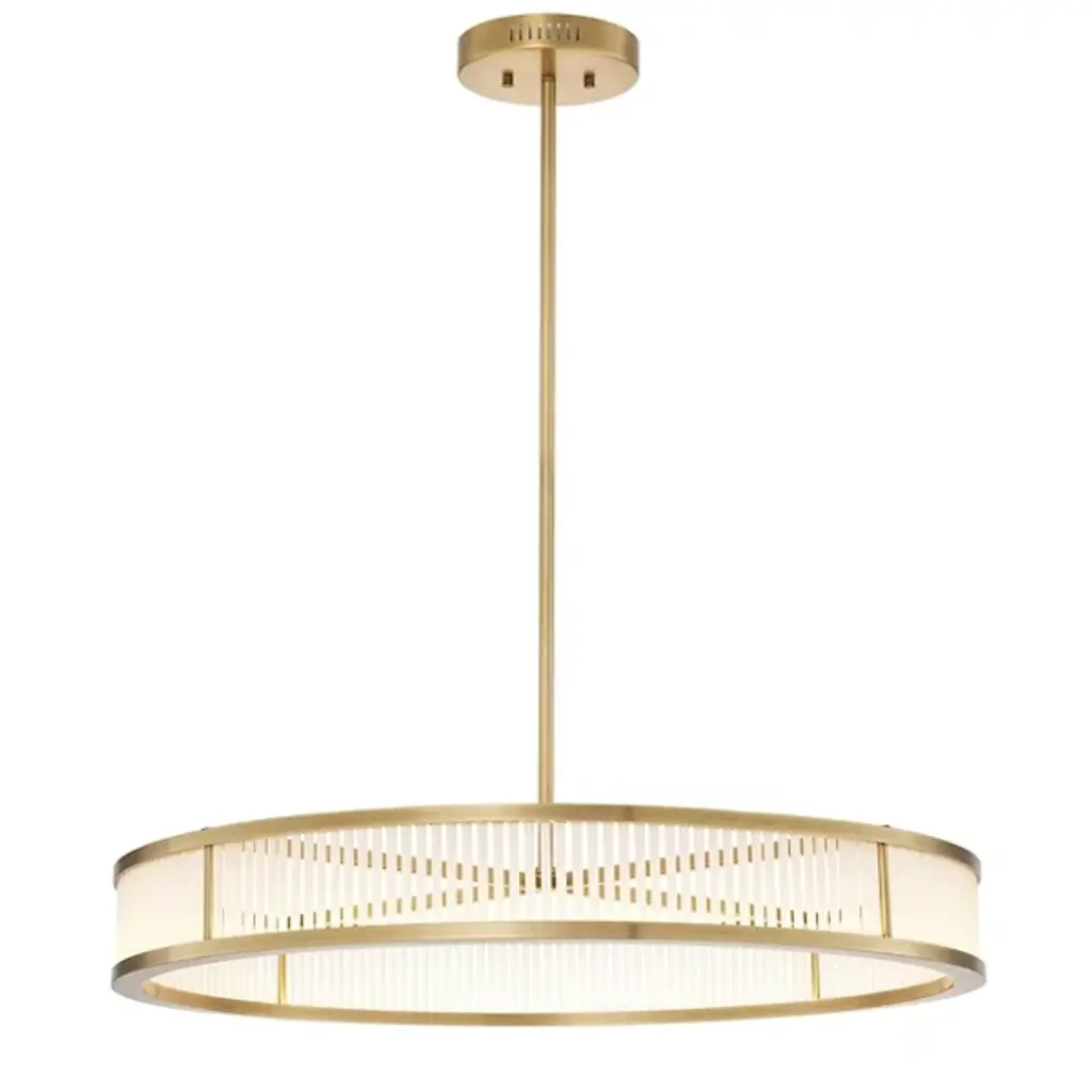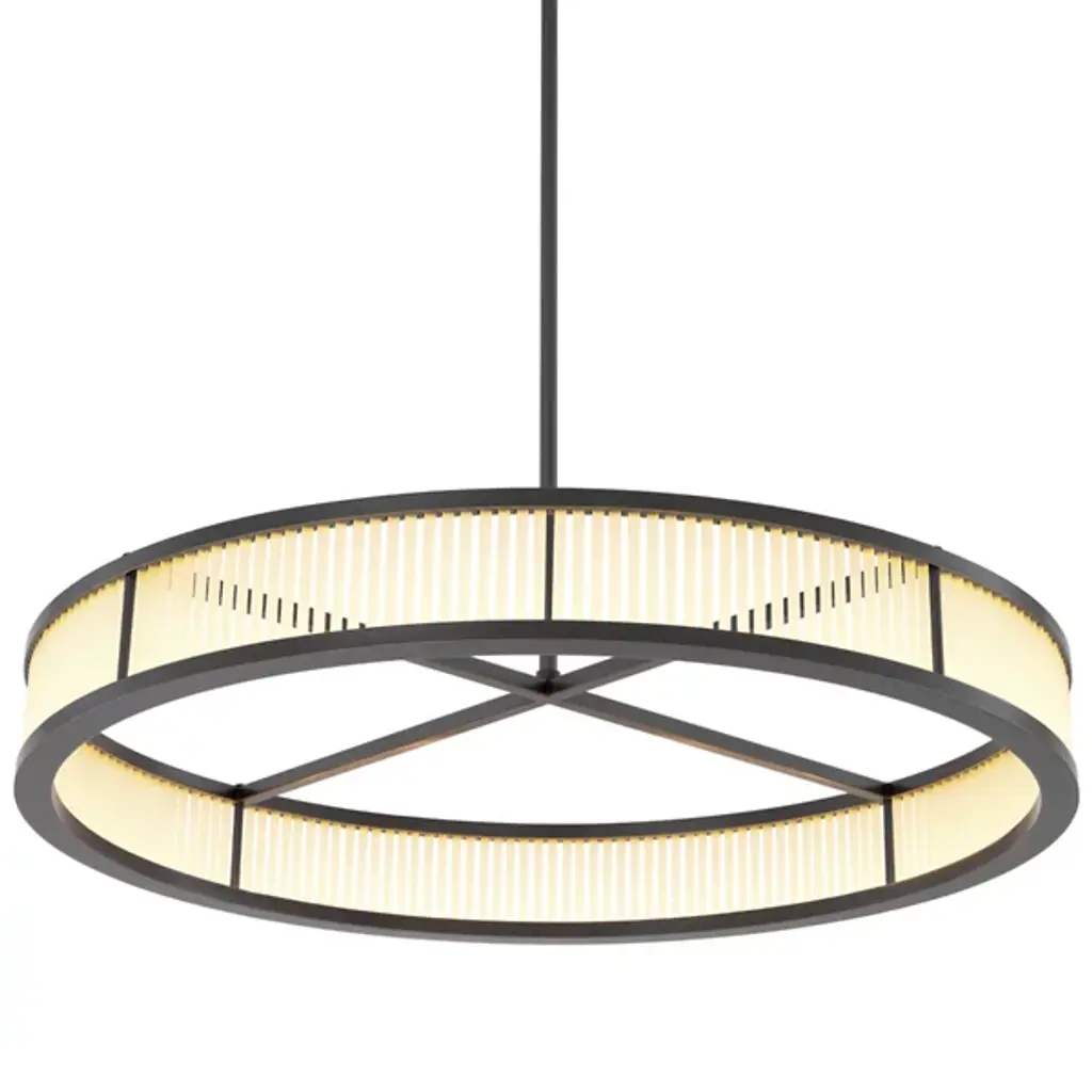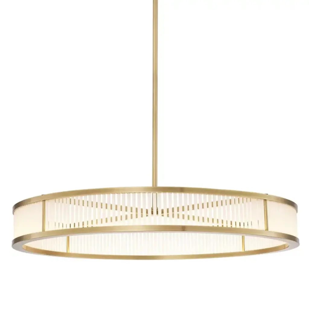 Add a gorgeous glam presence to large inside spaces, the open and elegant lines of the Thibaud Chandelier from Eichholtz. A tall and broad feature best suited to high ceiling spaces, this smooth metal fixture starts with a sleek disk canopy that sends a long central stem down to a crossbar structure below. The crossbar, in turn, supports a dual-layer metal ring structure that extends broadly around it, seating integrated LED lamping behind spaced rods of translucent frosted glass that reduce bright glare to a pleasing warmth in all directions.