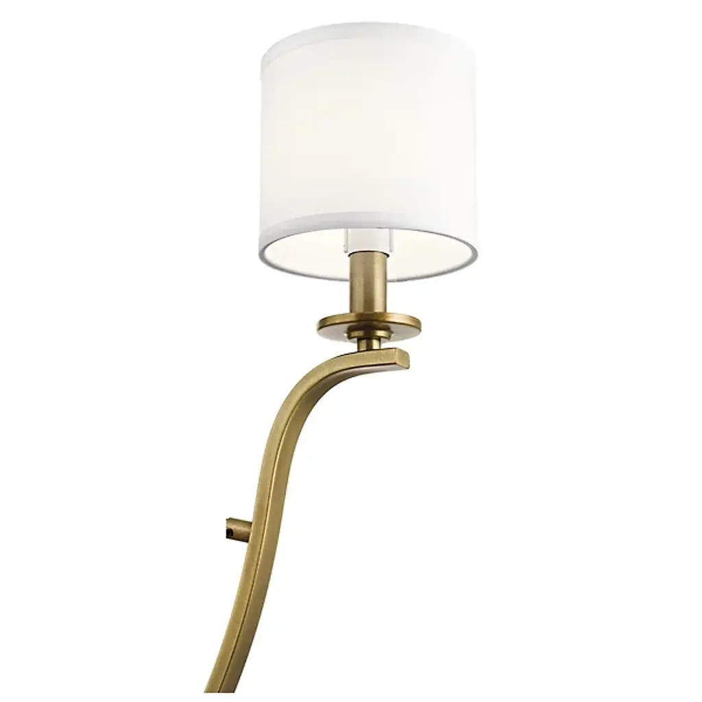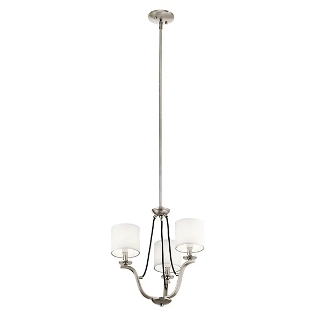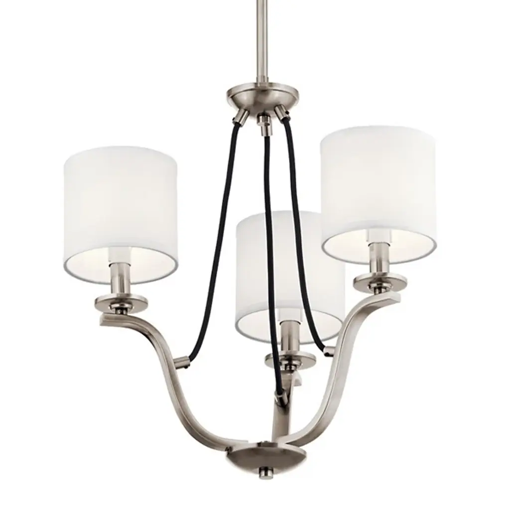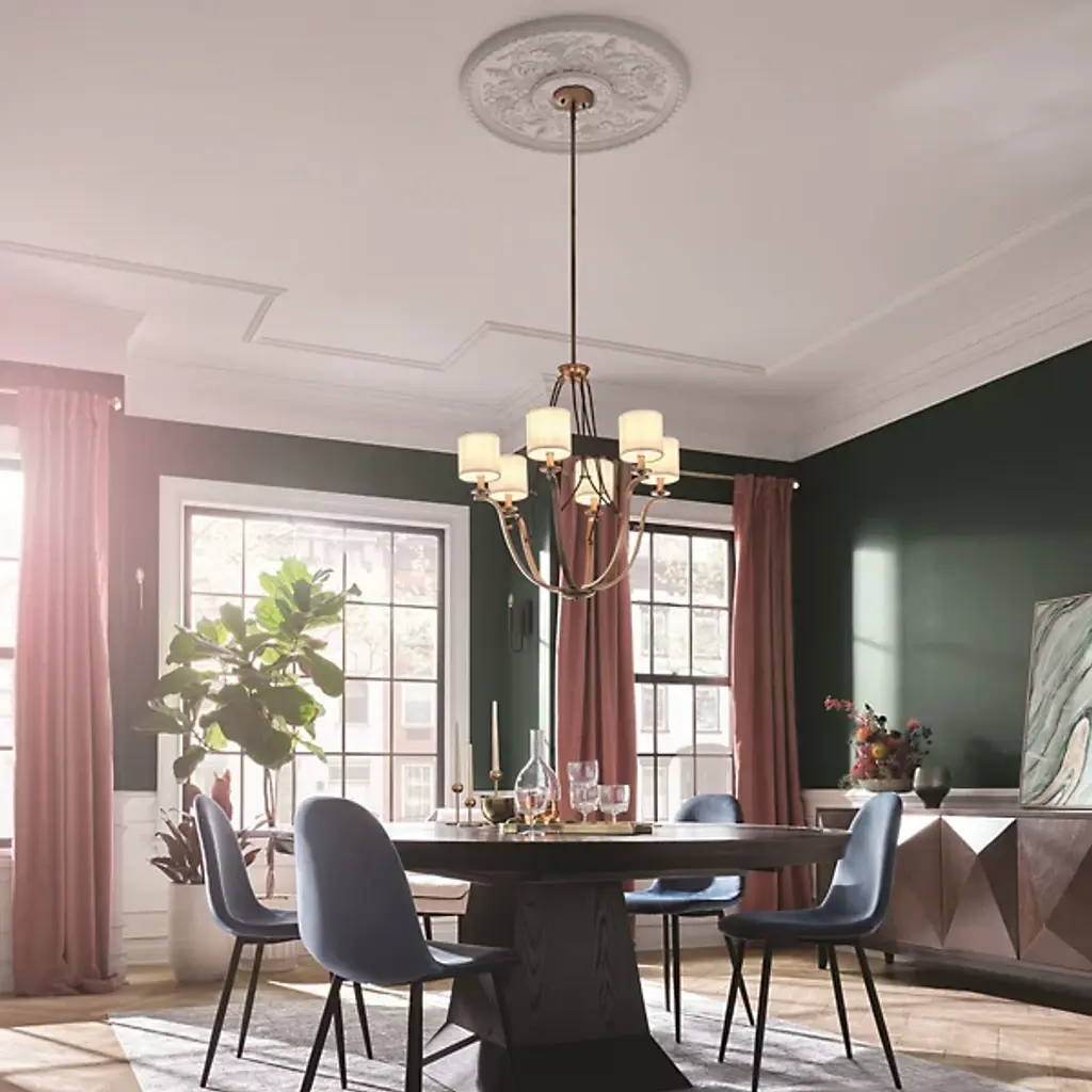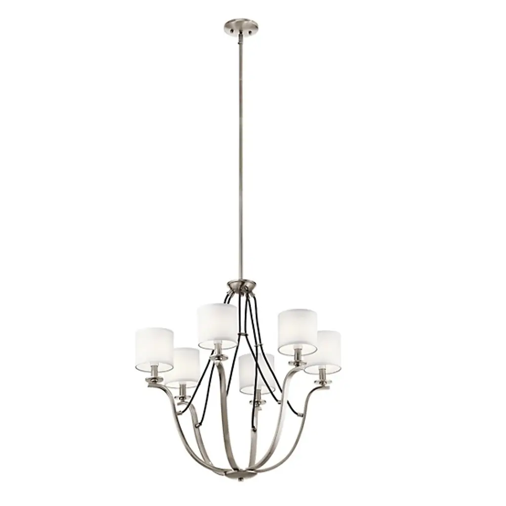 A touch of contrast goes a long way, especially with the stunning, transitional design of the Thisbe Chandelier from Kichler. Stylish strands of fabric wire fall from a central body while tethered in pairs, their artistic bends and angles complementing the precise metal construction. In a gorgeous presentation, ribbon arms sweep up in a circular order, their silhouette a pleasing glance to the eye. Cylindrical linen shades sit on top of sleek lamp holders, their diffusing properties softening the light inside into a warm, glamorous glow.