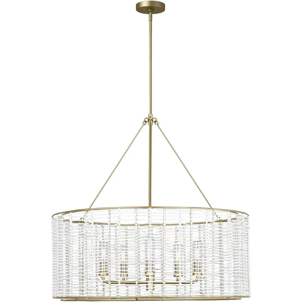 The Winslow series by Thom Filicia redefines the timeless chevron motif with a bold, three-dimensional design that brings texture and depth to any space. The intricately woven strands form a striking silhouette that surrounds an interior candelabra, allowing light to filter through and create captivating patterns and shadows. This innovative take on a classic design lends a contemporary edge while maintaining a sense of timeless elegance. Whether hung as a statement piece in a dining room, layered in a cozy living area, or under a covered patio, the Winslow hanging shades are a versatile choice that seamlessly blends with styles .