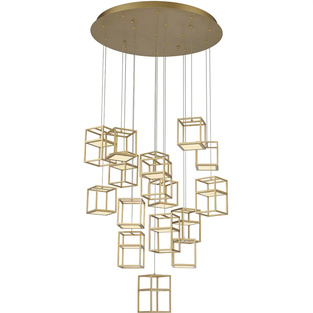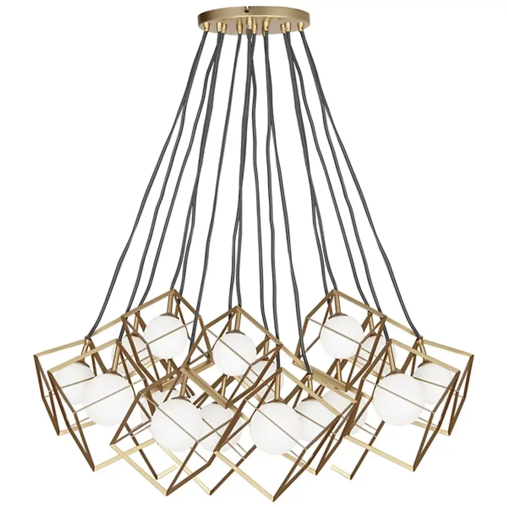 Multi-faceted lighting for ultramodern interiors. The Thomson Chandelier by Dainolite is comprised of multiple pendants that hang in a cluster from a shared ceiling canopy. Each pendant includes a glass sphere, which is surrounded by a diamond-shaped metal cage. Altogether, the cages add endless geometric style while also protecting their respective shades. The glass shades produce a rich, all-around ambient glow ideal for illuminating even the largest dining areas or kitchens.