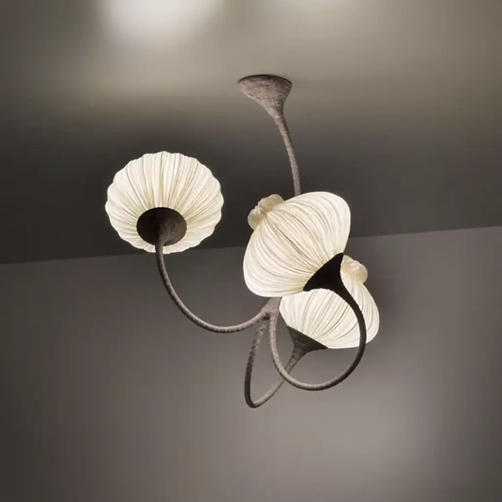 Nature-inspired lighting that easily transforms and adapts to its surroundings. Part of the Palm collection, the Three Palms LED Chandelier by Aqua Creations boasts orb-shaped forms supported by a sinuous fixture. The curvilinear branches of the fixture are made of hand-bent metal tubes wrapped in dark bronze organza fabric. Silk shades are detachable and produce evenly distributed light from the built-in LED module. This magical luminaire easily adapts to any space, and its light intensity can be adjusted to create the perfect ambiance.