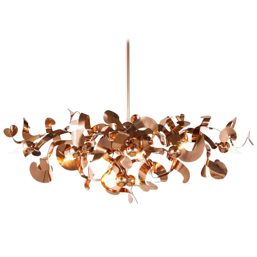 Nature-inspired lighting that easily transforms and adapts to its surroundings. Part of the Palm collection, the Three Palms LED Chandelier by Aqua Creations boasts orb-shaped forms supported by a sinuous fixture. The curvilinear branches of the fixture are made of hand-bent metal tubes wrapped in dark bronze organza fabric. Silk shades are detachable and produce evenly distributed light from the built-in LED module. This magical luminaire easily adapts to any space, and its light intensity can be adjusted to create the perfect ambiance.