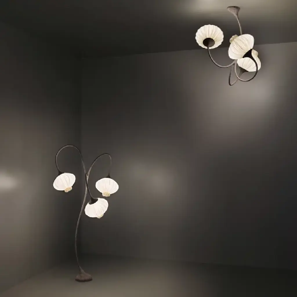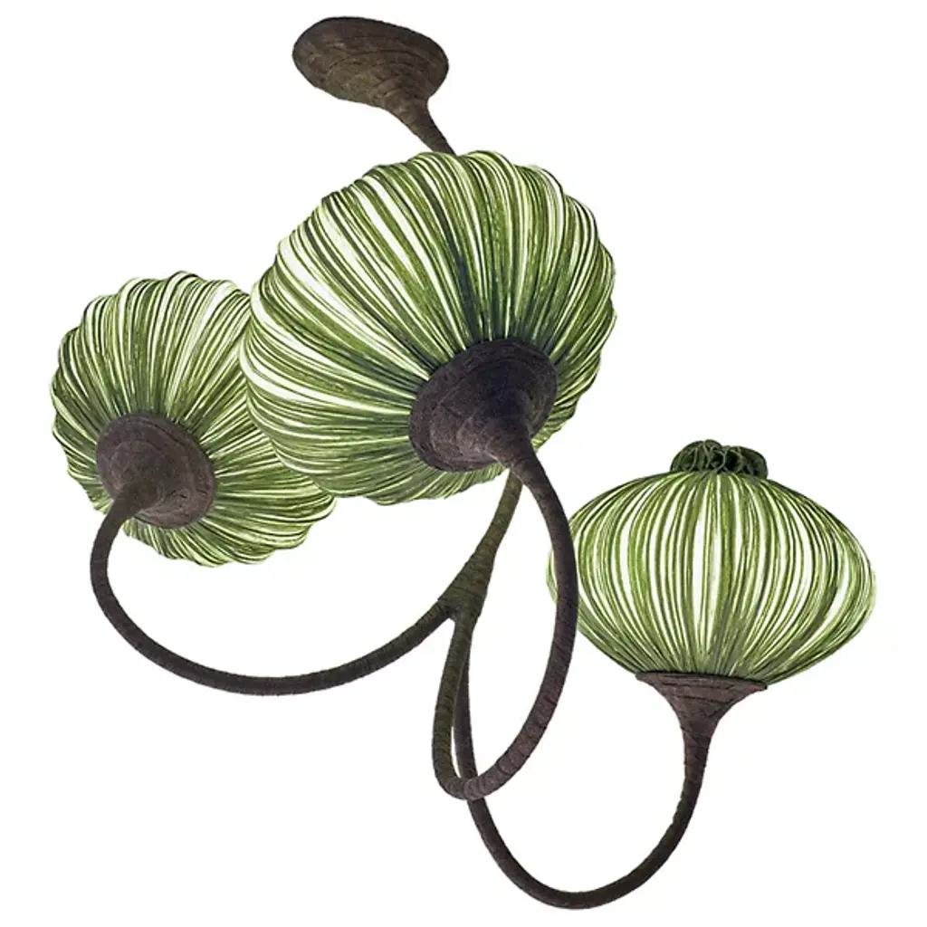 Nature-inspired lighting that easily transforms and adapts to its surroundings. Part of the Palm collection, the Three Palms LED Chandelier by Aqua Creations boasts orb-shaped forms supported by a sinuous fixture. The curvilinear branches of the fixture are made of hand-bent metal tubes wrapped in dark bronze organza fabric. Silk shades are detachable and produce evenly distributed light from the built-in LED module. This magical luminaire easily adapts to any space, and its light intensity can be adjusted to create the perfect ambiance.